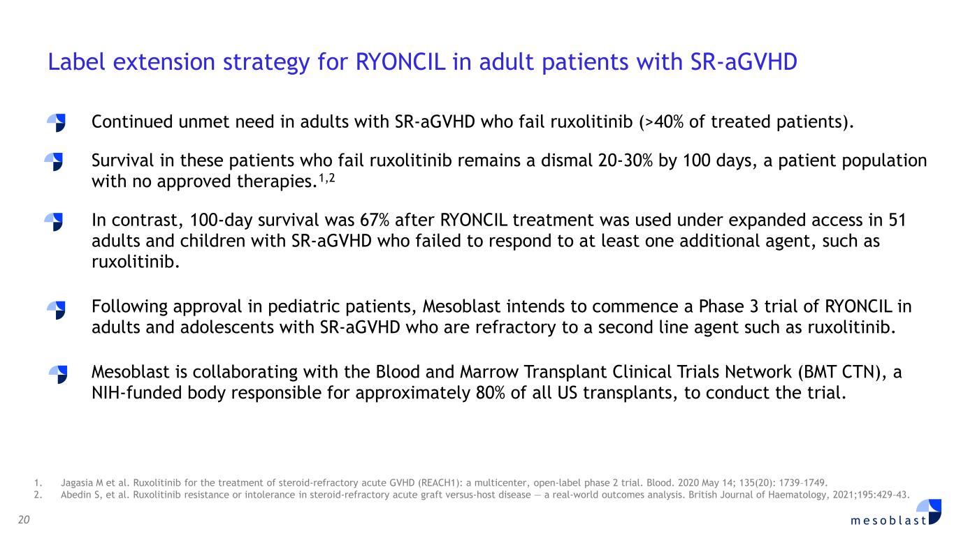 20 m e s o b l a s t在鲁索替尼失败的成人SR-AGVHD患者中持续存在未满足的需求(> 40%的已治疗患者)。这些ruxolitinib失败的患者到100天时的存活率仍然是令人沮丧的20-30 %,这是一个没有批准疗法的患者群体。1,2相比之下,在51名成人和儿童SR-AGVHD患者中,在扩大通路下使用RYONCIL治疗后,对至少一种额外药物(如ruxolitinib)没有反应的100天存活率为67%。继在儿科患者中获得批准后,Mesoblast打算在鲁索替尼等二线药物难治的SR-AGVHD成人和青少年中开始RYONCIL的3期试验。Mesoblast正在与血液和骨髓移植临床试验网络(BMT CTN)合作进行这项试验,该网络是一家由美国国立卫生研究院资助的机构,负责大约80%的美国移植手术。成人SR-AGVHD 1患者RYONCIL的标签延伸策略。Jagasia M等人Ruxolitinib用于治疗甾体难治性急性GVHD(REACH1):一项多中心、开放标签的2期试验。血。2020年5月14日;135(20):1739 – 1749。2.Abedin S,et al. Ruxolitinib耐药或不耐受在甾体难治性急性移植物抗宿主病中的应用——真实世界的结果分析。英国血液学杂志,2021;195:429 – 43。