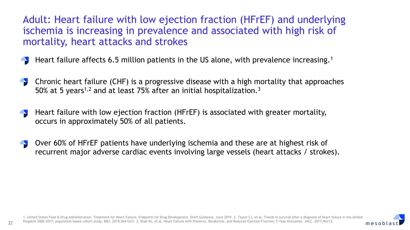32米e s o b l a s t成人:低射血分数(HFREF)和基础缺血的心力衰竭患病率正在增加,并与高死亡风险、心脏病发作和中风相关心力衰竭仅在美国就影响了650万患者,患病率增加。1慢性心力衰竭(CHF)是一种进行性疾病,死亡率在5年时接近50% 1,2,初次住院后至少75%。3低射血分数(HFREF)的心力衰竭与更高的死亡率相关,发生在大约50%的所有患者中。超60%的HFREF患者有潜在的缺血,这些患者复发涉及大血管的主要心脏不良事件(心脏病发作/中风)的风险最高。1.美国食品药品监督管理局。心力衰竭的治疗:药物开发的终点。指导草案。2019年6月。2.Taylor CJ,et al. Trends of survival after a diagnosed of heart failure in the United Kingdom 2000-2017:Population based cohort study。BMJ。2019;364:I223。3.Shah KS等人。心力衰竭伴保留、临界、射血分数降低;5年结果。JACC。2017年;11月12日。
