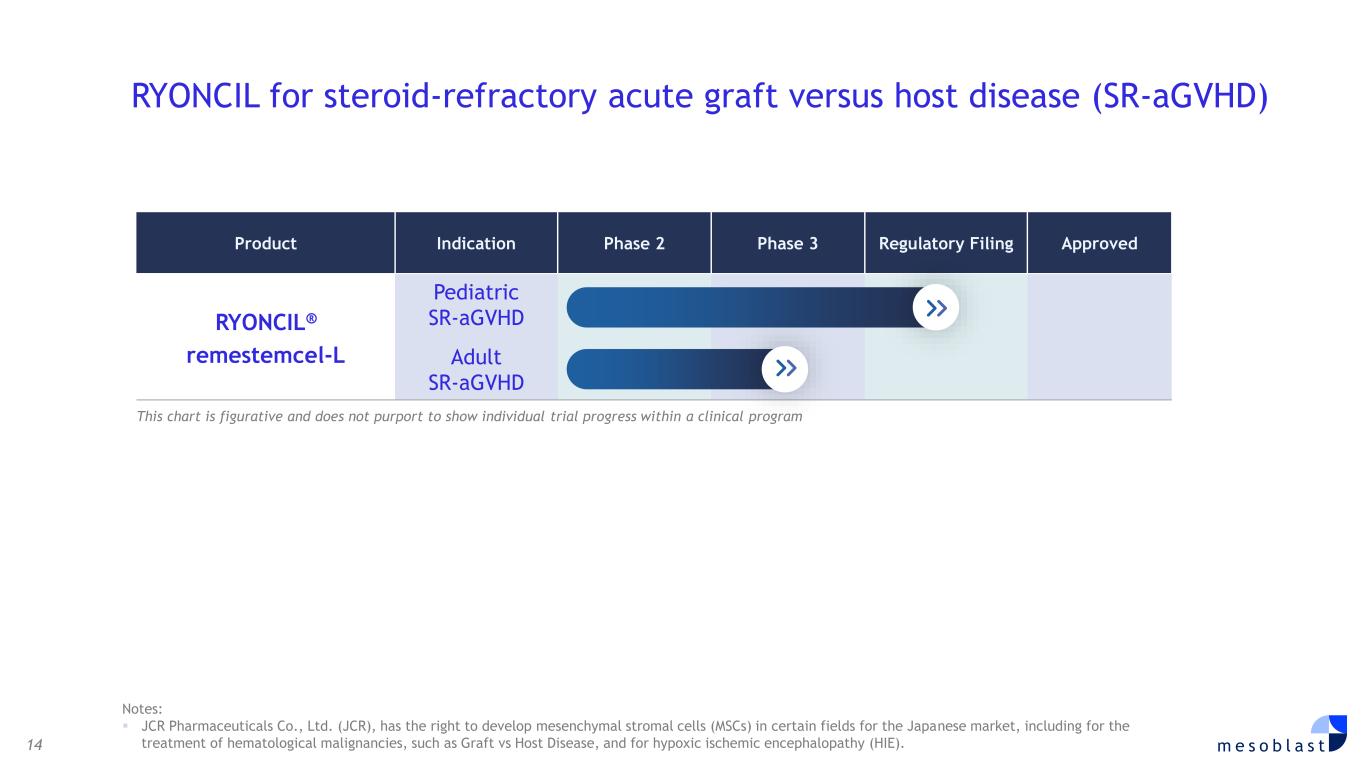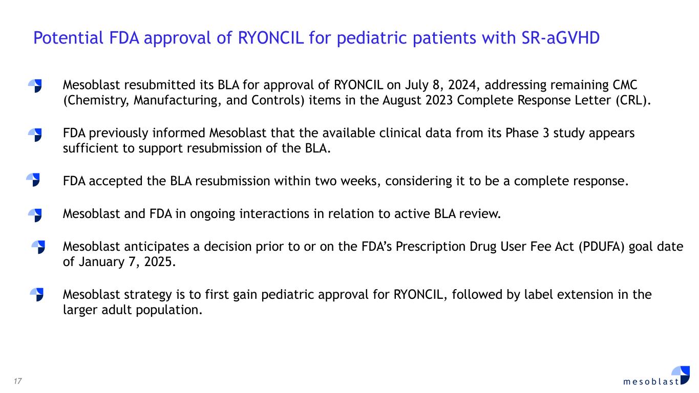 17m e s o b l a s t Mesoblast于2024年7月8日重新提交了BLA以供批准RYONCIL,在2023年8月的完整回复信(CRL)中涉及剩余的CMC(化学、制造和控制)项目。FDA此前告知Mesoblast,其3期研究的可用临床数据似乎足以支持重新提交BLA。FDA在两周内接受了BLA重新提交,认为这是一个完整的回应。Mesoblast和FDA在与主动BLA审查相关的持续互动中。Mesoblast预计将在2025年1月7日FDA的处方药用户费用法案(PDUFA)目标日期之前或就此做出决定。Mesoblast策略是首先获得RYONCIL的儿科批准,然后在更大的成年人群中进行标签扩展。RYONCIL用于SR-AGVHD儿科患者的潜在FDA批准
