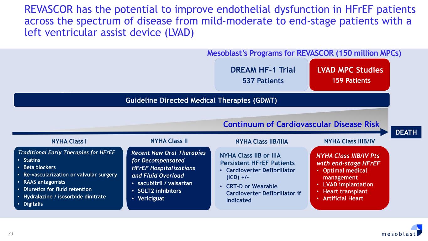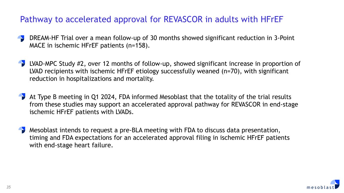 在平均随访30个月的成人HFREF DREAM-HF试验中加速批准REVASCOR的35 m e s o b l a s t通路显示缺血性HFREF患者的3点MACE显着降低(n = 158)。LVAD-MPC研究# 2,超过12个月的随访显示,有缺血性HFREF病因成功断奶的LVAD受者比例显著增加(n = 70),住院和死亡率显著降低。在2024年第一季度的B型会议上,FDA告知Mesoblast,这些研究的全部试验结果可能支持REVASCOR在伴有LVADs的终末期缺血性HFREF患者中的加速批准途径。Mesoblast打算要求与FDA举行BLA前会议,讨论数据提交、时间安排和FDA对缺血性HFREF终末期心力衰竭患者加速批准备案的期望。