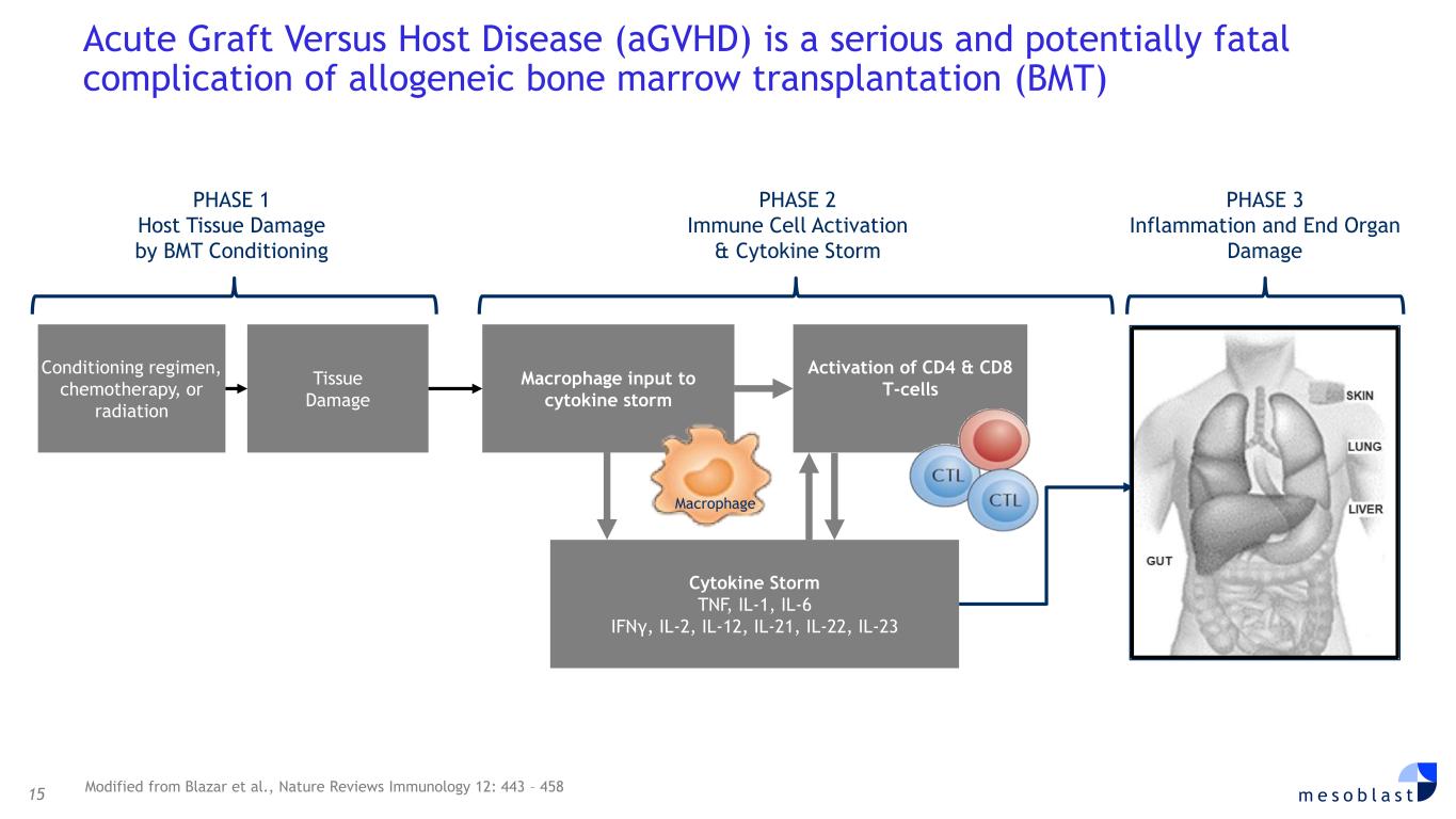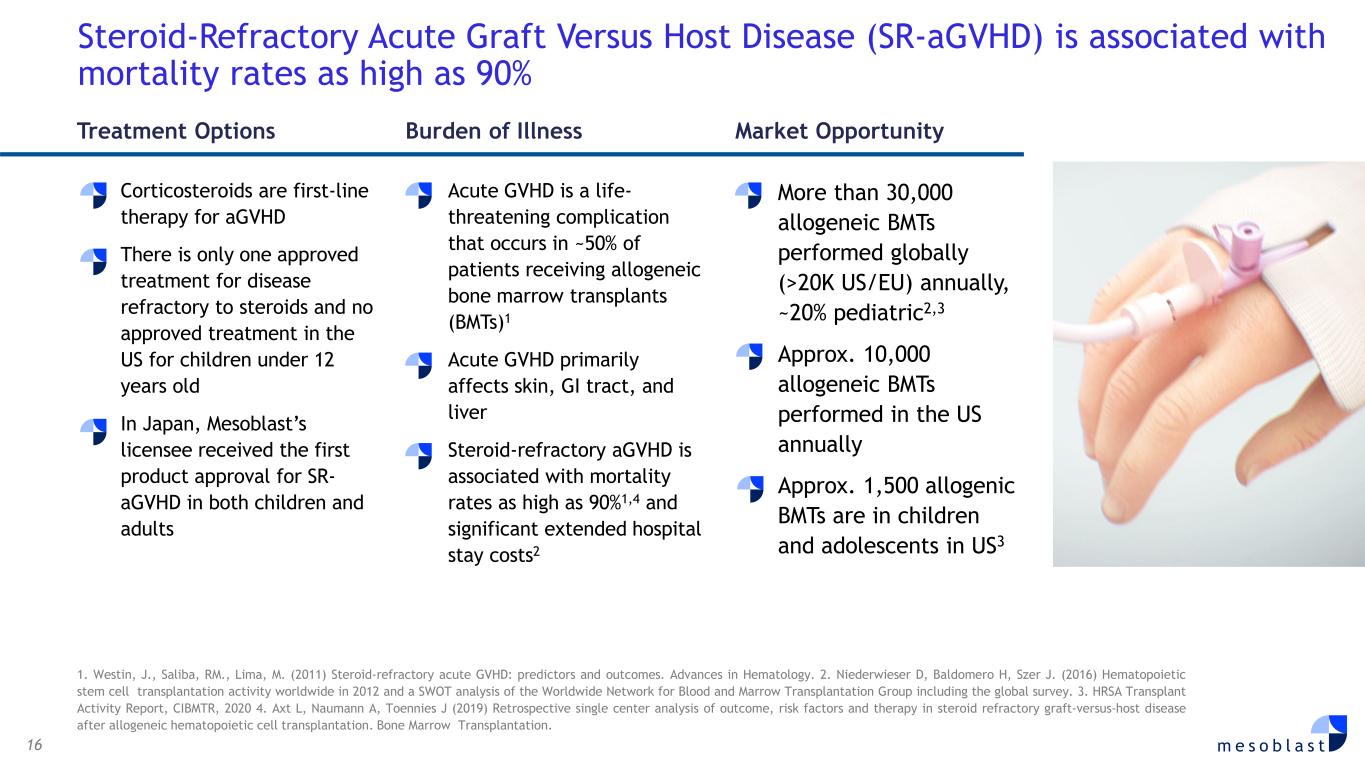 16 m e s o b l a s t 1。Westin,J.,Saliba,RM.,Lima,M.(2011)类固醇难治性急性GVHD:预测因子和结果。血液学方面的进展。2.Niederwieser D,Baldomero H,Szer J.(2016)2012年全球造血干细胞移植活动和包括全球调查在内的全球血液和骨髓移植组网络的SWOT分析。3.HRSA移植活动报告,CBMTR,20204。Axt L,Naumann A,Toennies J(2019)异基因造血细胞移植后类固醇难治性移植物抗宿主病结局、危险因素及治疗的回顾性单中心分析。骨髓移植。全球每年进行的同种异体BMT超过3万例(> 20K US/EU),~20%儿科2,3约。美国每年进行的同种异体BMT约为1万例。1500例同种异体BMT在儿童和青少年US3甾体难治性急性移植物抗宿主病(SR-AGVHD)与高达90%的死亡率相关急性GVHD是一种危及生命的并发症,发生在~50%接受同种异体骨髓移植(BMTs)的患者中1急性GVHD主要影响皮肤、胃肠道、和肝脏类固醇难治性AGVHD与高达90%的死亡率相关1,4和显着的延长住院费用2治疗方案疾病负担市场机会皮质类固醇是AGVHD的一线疗法美国只有一种批准的治疗类固醇难治的疾病的方法,日本没有批准用于12岁以下儿童的治疗方法,Mesoblast的被许可人获得了首个用于儿童和成人SR-AGVHD的产品批准