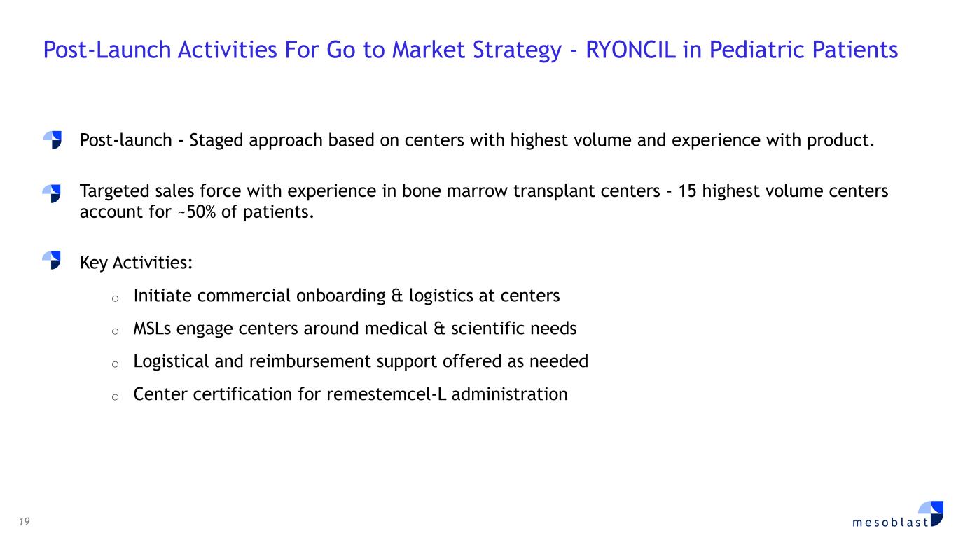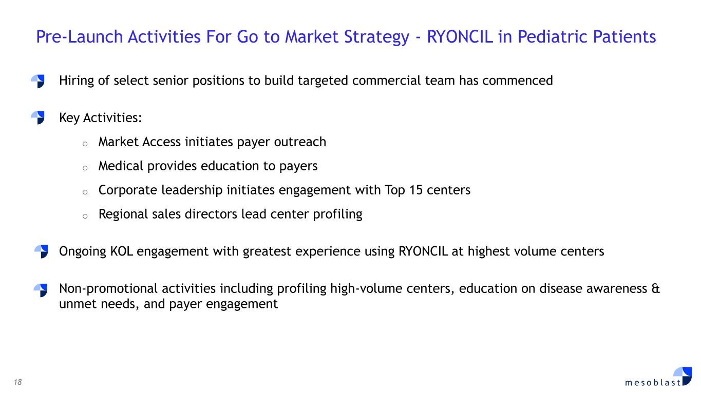 18m e s o b l a s t聘用选定的高级职位以建立有针对性的商业团队已开始关键活动:o市场准入启动付款人外联o医疗向付款人提供教育o企业领导层启动与前15名中心的接触o区域销售总监领导中心分析正在进行的KOL参与,在最高数量中心使用RYONCIL的经验最丰富非促销活动,包括分析高数量中心、疾病意识教育和未满足的需求,以及为Go to market strategy-RYONCIL在儿科患者中的启动前活动的付款人参与活动