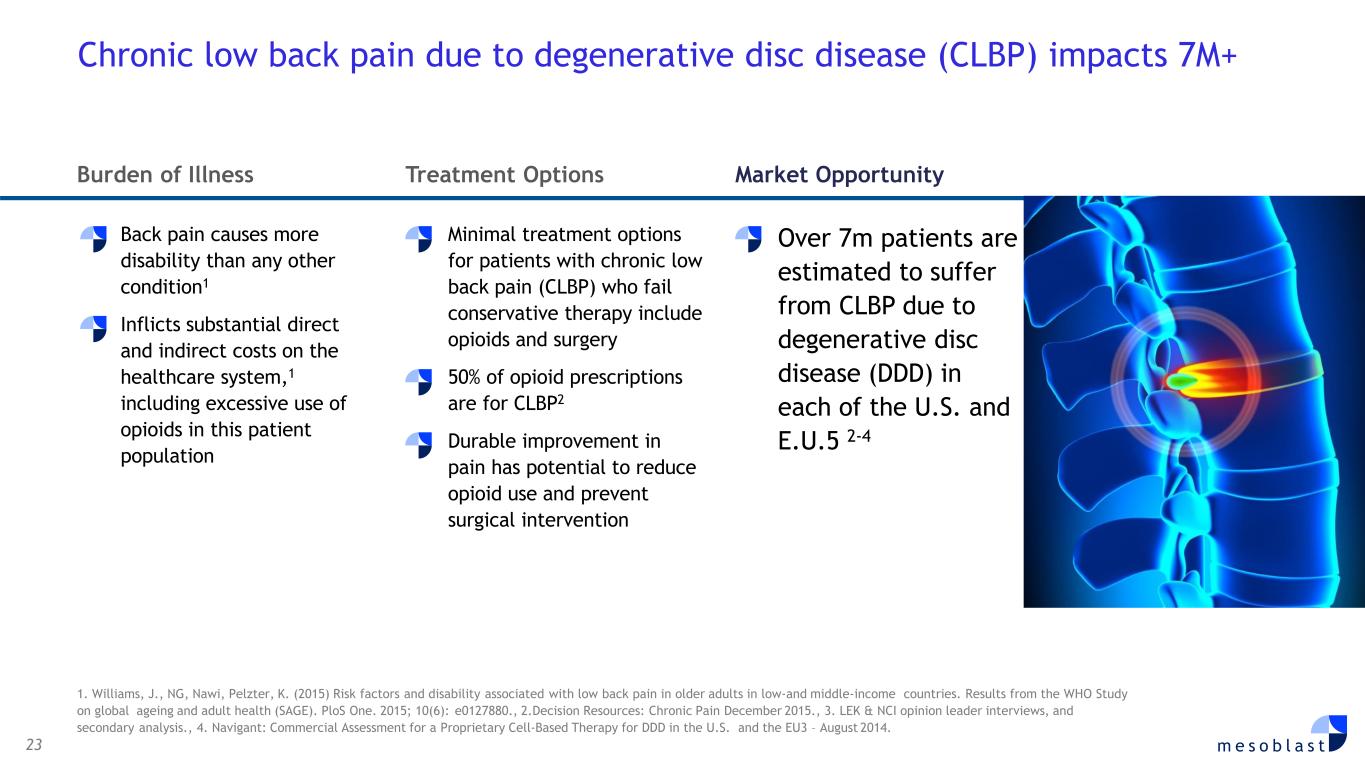 23米e s o b l a s t 1。威廉姆斯,J.,NG,Nawi,Pelzter,K.(2015)中低收入国家老年人腰痛相关的风险因素和残疾。世界卫生组织关于全球老龄化和成人健康(SAGE)的研究结果。PLOS一。2015;10(6):e0127880.,2.决策资源:慢性疼痛2015年12月.,3。LEK & NCI意见领袖访谈,二次分析。,4。Navigant:美国和欧盟3国针对DDD的专有细胞疗法的商业评估– 2014年8月。由退行性椎间盘疾病(CLBP)引起的慢性腰痛影响7m +超过7m的患者据估计,在美国和欧盟,每个国家都有超过7m的患者因退行性椎间盘疾病(DDD)而患有CLBP。5 2-4对于保守治疗失败的慢性腰痛(CLBP)患者,最起码的治疗选择包括阿片类药物和手术50%的阿片类药物处方是针对CLBP2疼痛的持久改善有可能减少阿片类药物的使用并防止手术干预疾病的治疗选择市场机会背痛导致的残疾比任何其他条件都多1引起实质性的直接和医疗保健系统的间接成本,1包括在该患者群体中过度使用阿片类药物