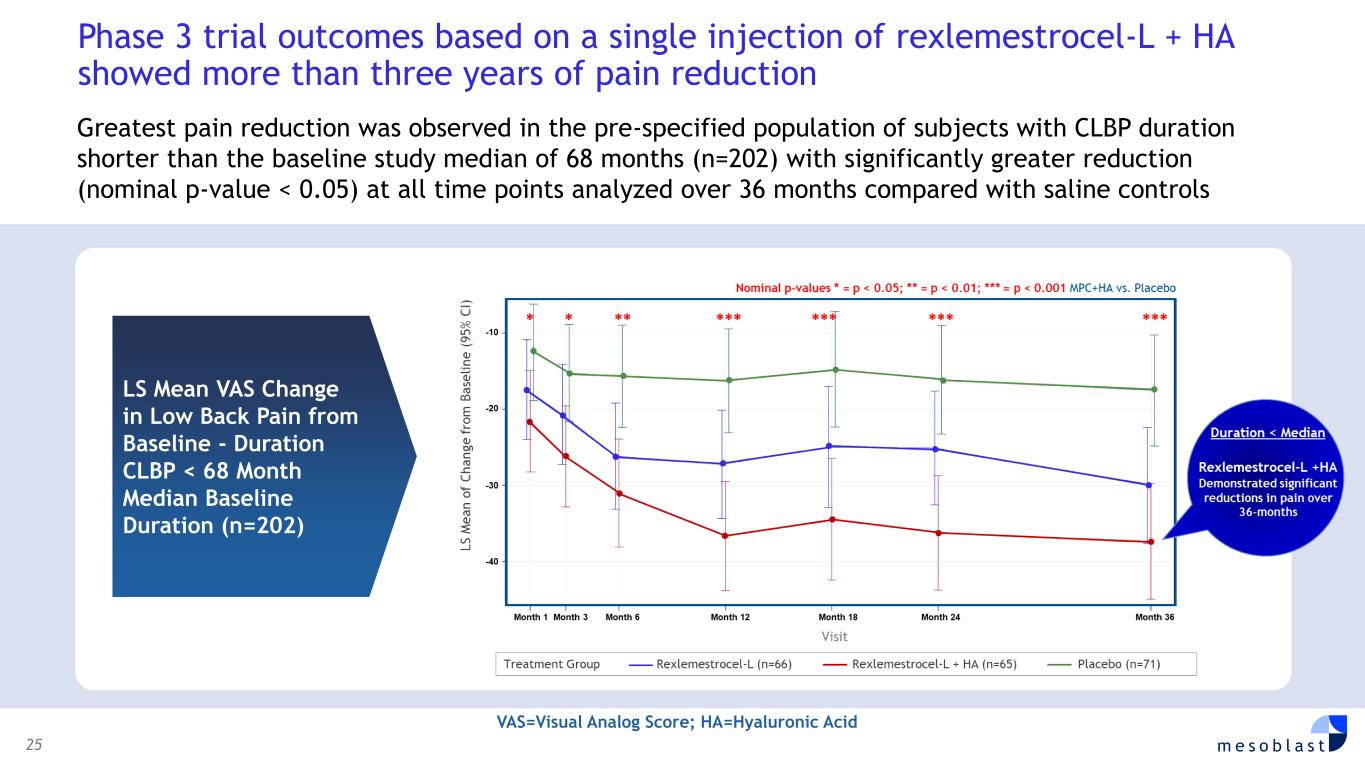 25m e s o b l a s t LS对腰痛的平均VAS变化与基线-持续时间CLBP < 68个月中位基线持续时间(n = 202)基于单次注射rexlemestrocel-L + HA的3期试验结果显示疼痛减轻超过三年在预先指定的受试者人群中观察到最大的疼痛减轻CLBP持续时间短于基线研究中位数68个月(n = 202),与生理盐水对照相比,在36个月内分析的所有时间点上均有明显更大的减轻(名义p值< 0.05)VAS =视觉模拟评分;HA =透明质酸