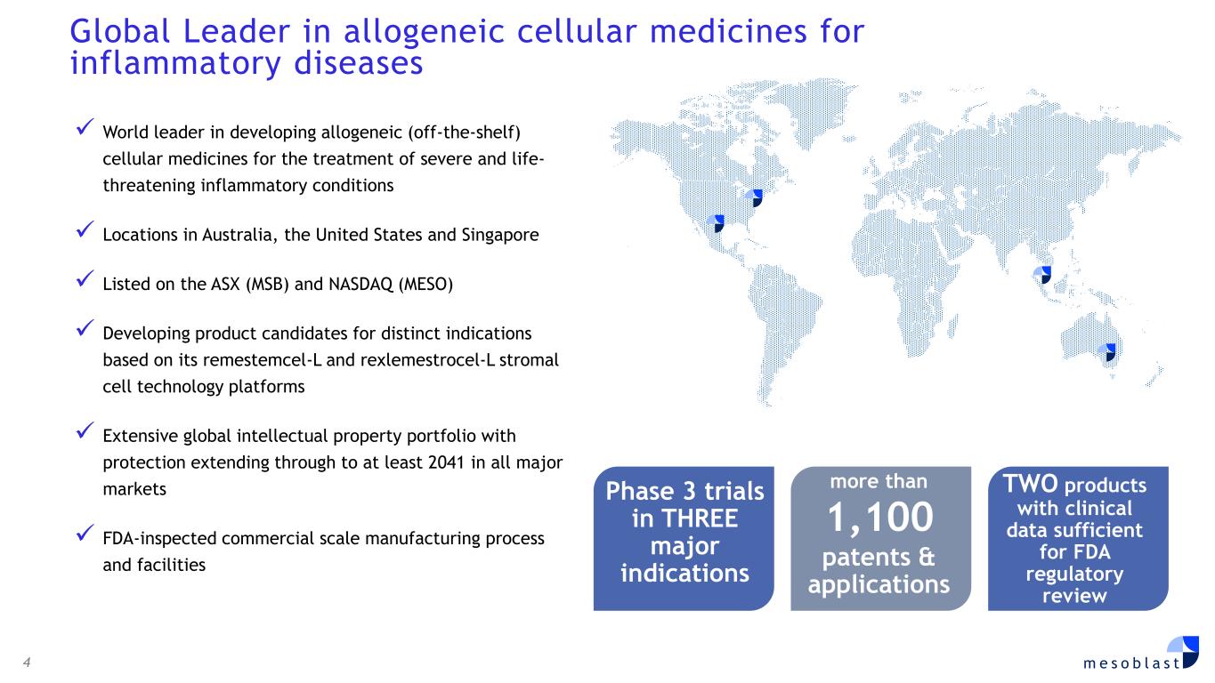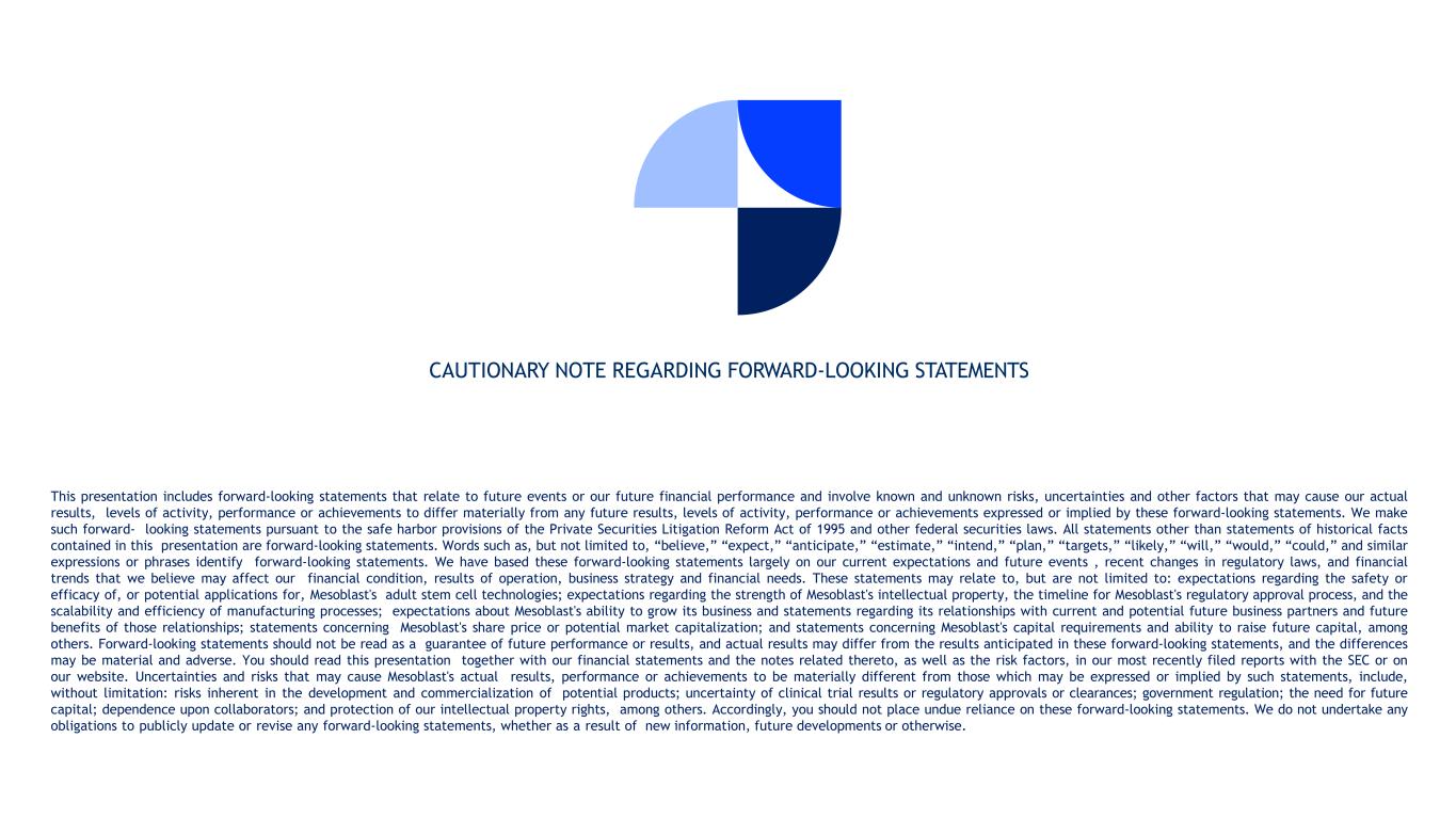 关于前瞻性陈述的注意事项本演示文稿包含与未来事件或我们未来财务业绩相关的前瞻性陈述,并涉及已知和未知的风险、不确定性和其他因素,这些因素可能导致我们的实际结果、活动水平、业绩或成就与这些前瞻性陈述明示或暗示的任何未来结果、活动水平、业绩或成就存在重大差异。我们根据1995年《私人证券诉讼改革法案》和其他联邦证券法的安全港条款作出此类前瞻性陈述。本演示文稿中包含的历史事实陈述以外的所有陈述均为前瞻性陈述。诸如但不限于“相信”、“预期”、“预期”、“估计”、“打算”、“计划”、“目标”、“可能”、“将”、“将”、“可能”等词语以及类似的表达方式或短语可识别前瞻性陈述。我们的这些前瞻性陈述主要基于我们目前的预期和未来事件、监管法律最近的变化以及我们认为可能影响我们的财务状况、经营业绩、业务战略和财务需求的财务趋势。这些陈述可能涉及但不限于:对Mesoblast成体干细胞技术的安全性或有效性或潜在应用的预期;对Mesoblast知识产权实力的预期、Mesoblast监管批准程序的时间表以及制造过程的可扩展性和效率;对Mesoblast业务增长能力的预期以及关于其与当前和潜在未来业务合作伙伴的关系以及这些关系的未来利益的声明;关于Mesoblast股价或潜在市值的声明;以及关于Mesoblast资本要求和筹集未来资本能力的声明等。前瞻性陈述不应被理解为对未来业绩或结果的保证,实际结果可能与这些前瞻性陈述中预期的结果不同,差异可能是重大的和不利的。您应该在我们最近向SEC提交的报告中或在我们的网站上阅读本演示文稿以及我们的财务报表和与之相关的说明,以及风险因素。可能导致MESBLast的实际结果、业绩或成就与此类陈述可能明示或暗示的存在重大差异的不确定性和风险包括但不限于:潜在产品的开发和商业化所固有的风险;临床试验结果或监管批准或许可的不确定性;政府监管;对未来资本的需求;对合作者的依赖;以及对我们知识产权的保护等。因此,您不应过分依赖这些前瞻性陈述。我们不承担任何义务公开更新或修改任何前瞻性陈述,无论是由于新信息、未来发展或其他原因。