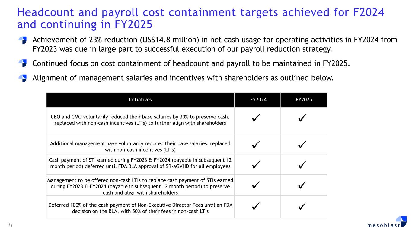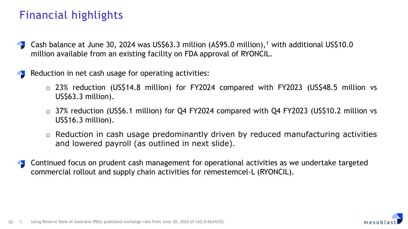 10m e s o b l a s t截至2024年6月30日的现金余额为6330万美元(9500万澳元),1另有1000万美元可从FDA批准RYONCIL的现有设施中获得。经营活动净现金使用减少:o与2023财年(4850万美元对6330万美元)相比,2024财年减少23%(1480万美元)。o与2023财年第四季度(1020万美元对1630万美元)相比,2024财年第四季度减少37%(610万美元)。o现金使用减少主要是由于制造活动减少和工资减少(如下一张幻灯片所示)。由于我们为remestemcel-L(RYONCIL)开展了有针对性的商业推广和供应链活动,因此继续专注于运营活动的审慎现金管理。财务亮点1。使用澳洲联储(RBA)公布的2024年6月30日汇率1澳元:0.66 24美元。