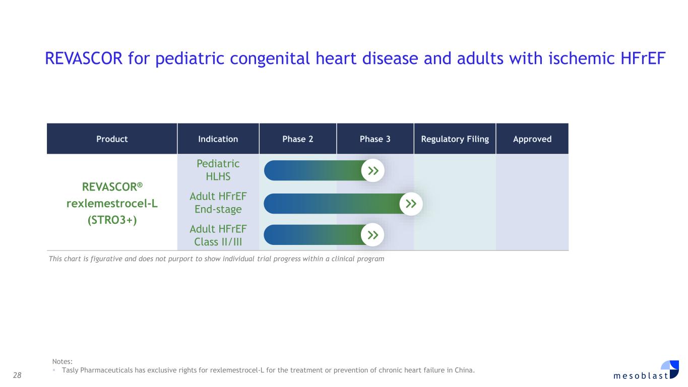 28 m e s o b l a s t REVASCOR用于儿童先天性心脏病和成人缺血性HFREF产品适应症2期3期监管备案批准REVASCOR ® rexlemestrocel-L(STRO3 +)儿科HLHS成人HFREF终末期成人HFREF II/III类此图表具有比喻性,并不旨在显示临床项目内的个别试验进展注:▪天士力制药拥有rexlemestrocel-L在中国用于治疗或预防慢性心力衰竭的独家权利。