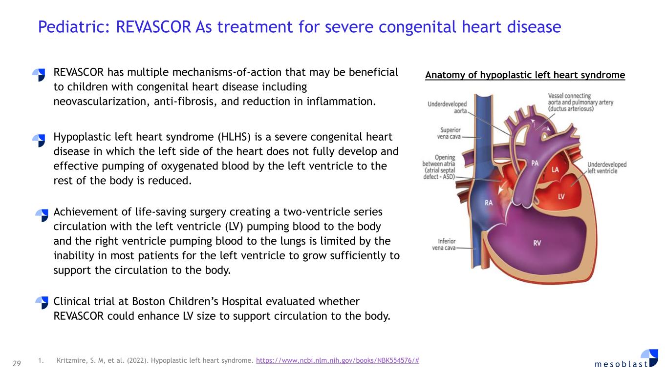 29m e s o b l a s t REVASCOR具有多种可能对先天性心脏病儿童有益的作用机制,包括新生血管、抗纤维化和减轻炎症。左心发育不全综合征(HLHS)是一种严重的先天性心脏病,其表现为心脏左侧发育不完全,左心室向身体其他部位有效泵送的含氧血液减少。拯救生命手术的成就创造了左心室(LV)向身体泵血和右心室向肺部泵血的双心室串联循环,这是由于大多数患者无法让左心室充分生长以支持向身体的循环而受到限制。波士顿儿童医院的临床试验评估了REVASCOR是否可以增强LV大小以支持循环到身体。儿科:REVASCOR作为治疗严重先天性心脏病1。Kritzmire,S. M,et al.(2022)。左心发育不全综合征。https://www.ncbi.nlm.nih.gov/books/NBK554576/#左心发育不全综合征解剖