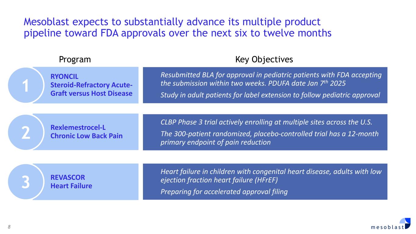 8 m e s o b l a s t Rexlemestrocel-L慢性腰痛Mesoblast预计将在未来六到十二个月内大幅推进其多个产品管线向FDA批准RYONCIL甾体难治性急性移植物抗宿主病1重新提交的BLA用于FDA在两周内接受提交的儿科患者的批准。PDUFA日期2025年1月7日在成人患者中进行的标签扩展研究,以遵循儿科批准计划关键目标REVASCOR心力衰竭23 CLBP 3期试验在美国多个地点积极招募。300名患者的随机、安慰剂对照试验有12个月的主要终点疼痛减轻先天性心脏病儿童心力衰竭、低射血分数心力衰竭(HFREF)成人准备加速审批备案