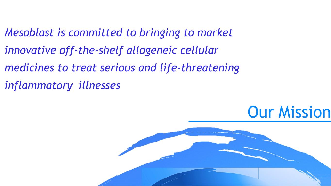 我们的使命Mesoblast致力于将创新的现成同种异体细胞药物推向市场,以治疗严重且危及生命的炎症性疾病