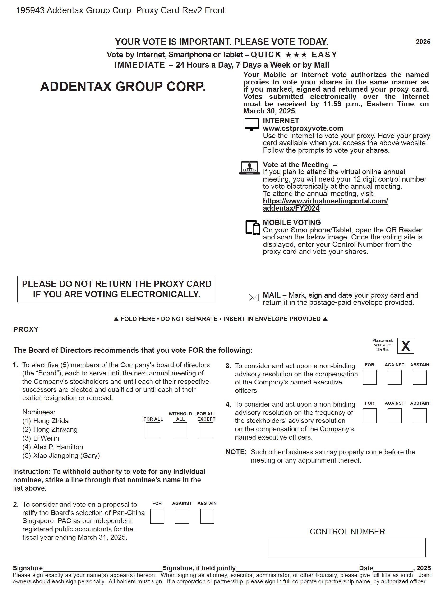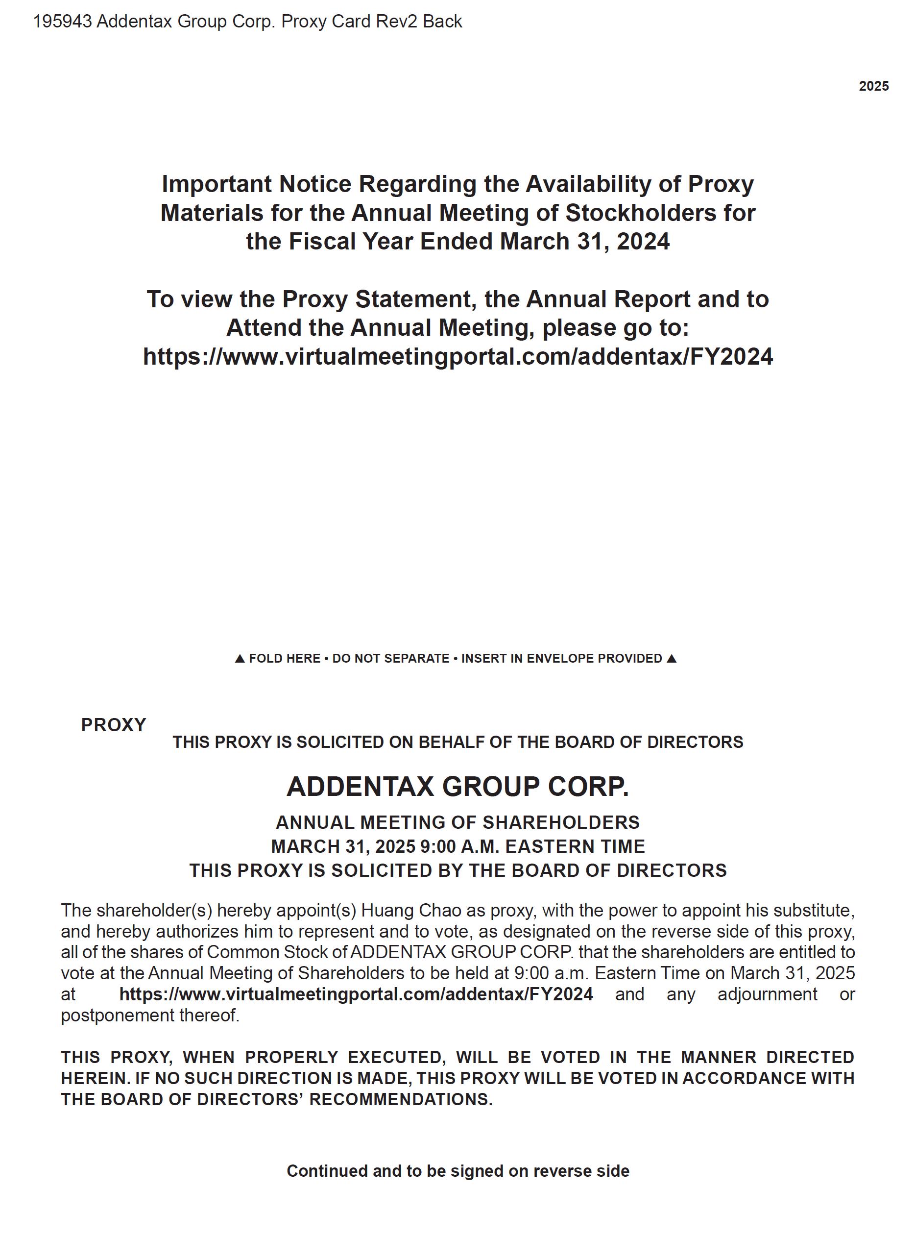 这份委托书和我们于2024年7月15日向美国证券交易委员会(“SEC”)提交的截至2024年3月31日止年度的10-K表格年度报告(“2024年年度报告”)将于2025年3月10日或前后提供给股东。我们的年度会议通知、代理声明和2024年年度报告的副本也将在https://www.virtualmeetingportal.com/addentax/FY2024上提供。