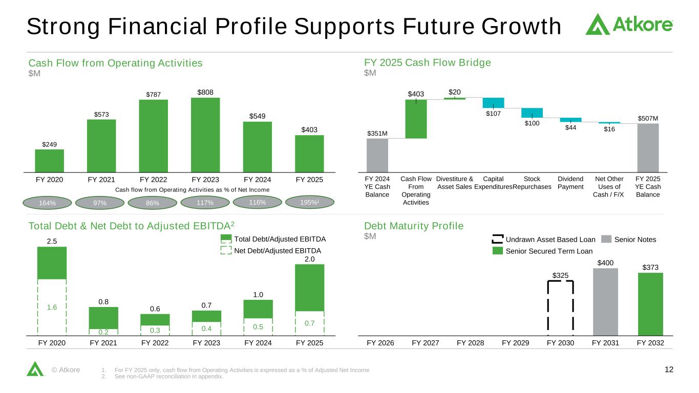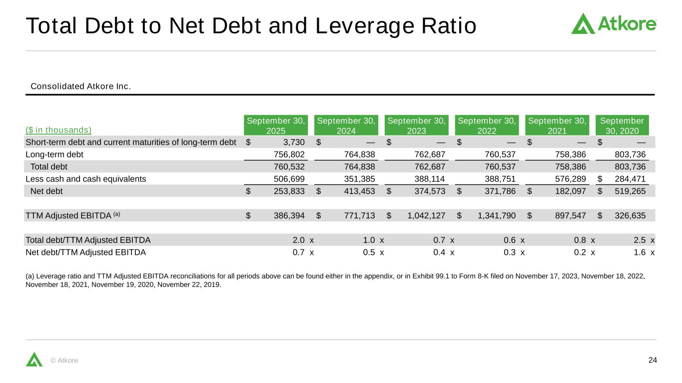 24©Atkore总债务与净债务和杠杆比率合并↓ Atkore Inc. Atkore Inc.(单位:千美元)2025年9月30日2024年9月30日2023年9月30日2022年9月30日2021年9月30日,2020年短期债务和当前到期长期债务$ 3,730 $ — $ — $ — $ —长期债务756,802764,838762,687760,537758,386803,736债务总额760,532764,838762,687760,537758,386803,736减现金和现金等价物506,699351,385388,114388,751576,289美元284,471净债务253,833美元413,453美元374,573美元371,786美元182,097美元519,265美元TTM调整后EBITDA(a)386,394美元771,713美元1,042,127美元1,341,790美元897,547美元326,635美元总债务/TTM调整后EBITDA 2.0x1.0x0.7x0.6x0.8x2.5x净债务/TTM调整后EBITDA 0.7x0.5x0.4x0.3x0.2x1.6x(a)上述所有期间的杠杆率和TTM调整后EBITDA对账可在附录中找到,或在2023年11月17日、2022年11月18日、2021年11月18日、2020年11月19日、2019年11月22日提交的附件 99.1至8-K表中。