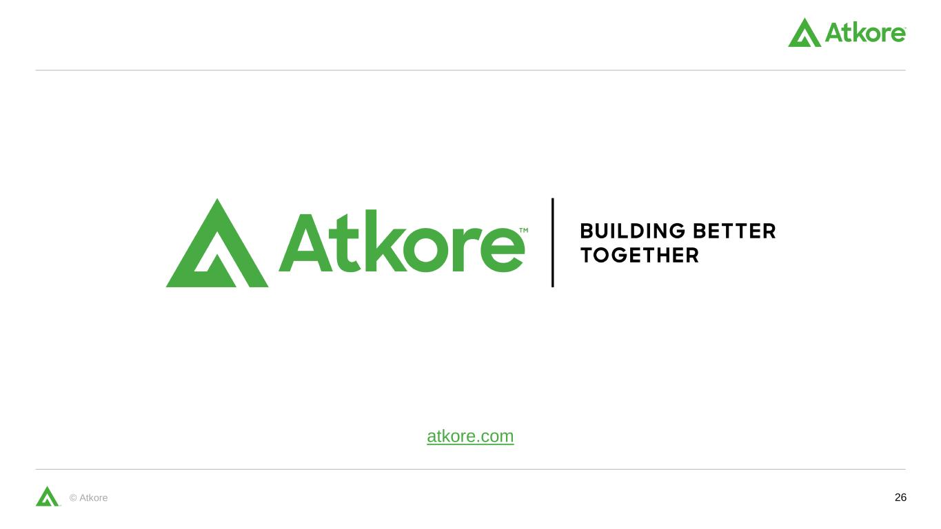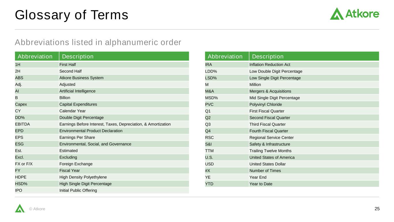 25©以字母数字顺序排列的Atkore简称术语表简称说明1H上半年2H下半年ABS Atkore业务系统调整后AI人工智能B十亿资本支出CY日历年DD %两位数百分比EBITDA息税折旧摊销前利润EPD环境产品申报EPS每股盈利ESG环境、社会、治理EST。估计不含税。不含外汇或F/X外汇FY财年HDPE高密度聚乙烯HSD %高个位数百分比IPO首次公开募股简称说明IRA通胀减少法案LDD %低双位数百分比LSD %低个位数百分比百万并购MSD %中个位数百分比PVC聚氯乙烯Q1第一财季Q2第二财季Q3第三财季Q4第四财季RSC区域服务中心S & I安全与基础设施TTM过去12个月美国美国美元# x次数YE年结年初至今