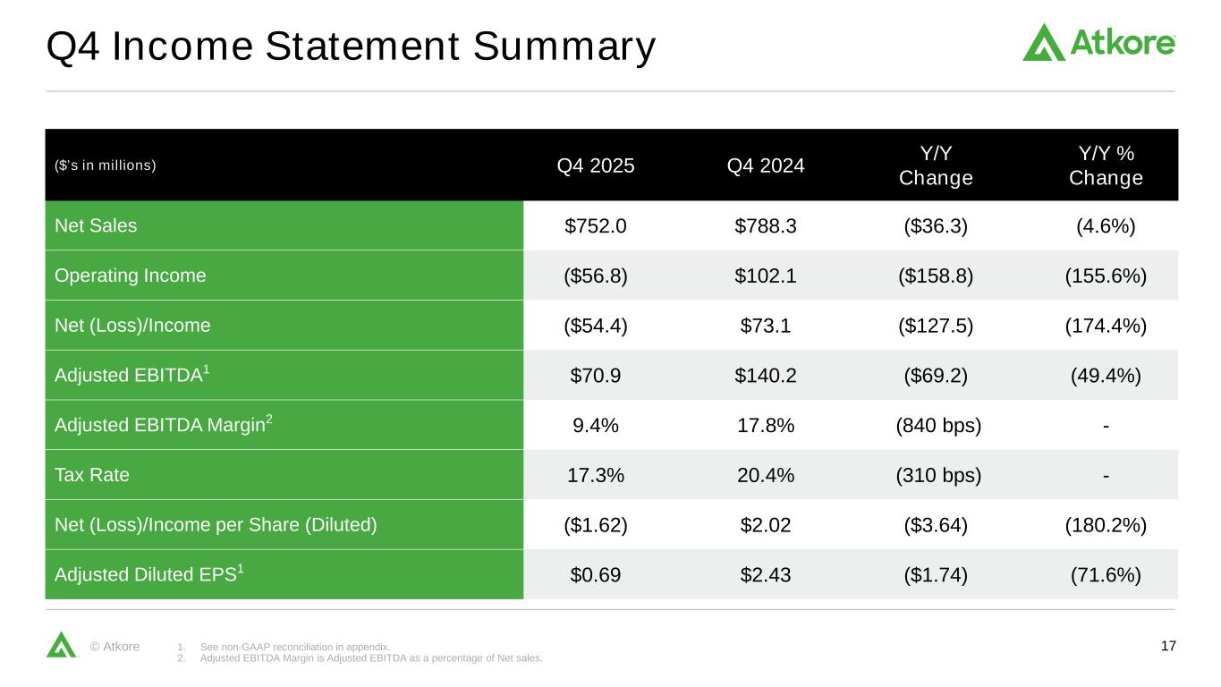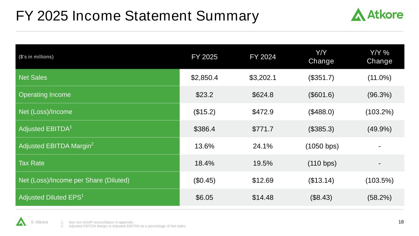 17©Atkore第四季度利润表摘要1。见附录中的非GAAP调节。2.调整后EBITDA利润率是调整后EBITDA占净销售额的百分比。(百万美元)2025年第四季度2024年第四季度同比变化Y/Y %变化净销售额752.0美元788.3美元(36.3美元)(4.6%)营业收入(56.8美元)102.1美元(158.8美元)(155.6%)净(亏损)/收入(54.4美元)73.1美元(127.5美元)(174.4%)调整后EBITDA 1 70.9美元140.2美元(69.2美元)(49.4%)调整后EBITDA利润率2 9.4% 17.8%(840个基点)-税率17.3% 20.4%(310个基点)-每股净(亏损)/收入(稀释后)(1.62美元)2.02美元(3.64美元)(180.2%)调整后稀释后每股收益1美元0.69美元2.43美元(1.74美元)(71.6%)