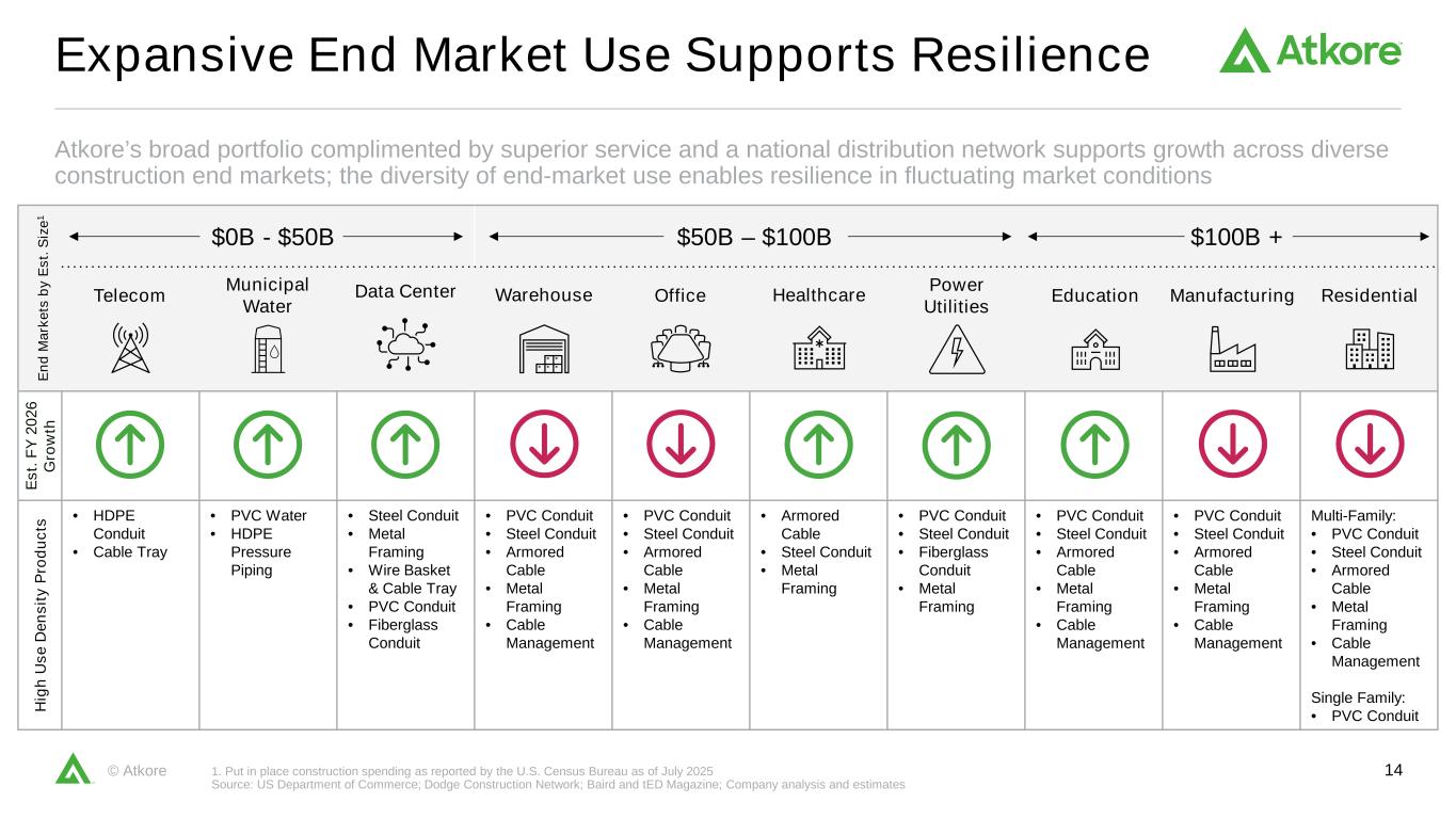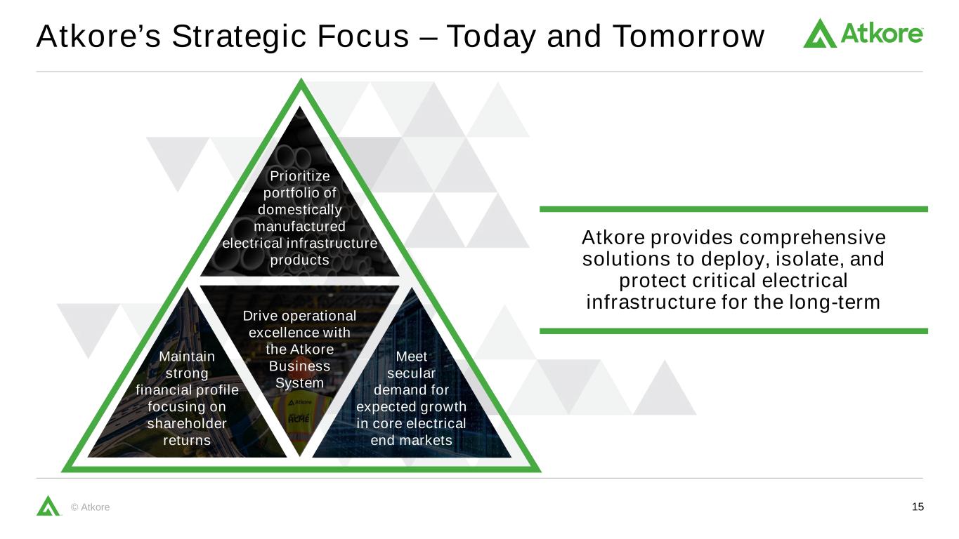 14©Atkore广阔的终端市场用途支持韧性EN D M AR KE TS B Y ES T. SIZE 1 $ 0B-$ 50B $ 50B – $ 100B $ 100B + ES T. FY 202 G ro w th H ig h U se D en si ty P ro du ct s • HDPE导管•电缆桥架• PVC水• HDPE压力管道•钢导管•金属框架•线篮&电缆桥架• PVC导管•玻璃纤维导管• PVC导管•钢导管•装甲电缆•金属框架•电缆管理•PVC导管•钢导管•铠装电缆•金属框架•电缆管理•铠装电缆•钢导管•金属框架• PVC导管•钢导管•玻璃纤维导管•金属框架• PVC导管•钢导管•铠装电缆•金属框架•电缆管理• PVC导管•钢导管•钢导管•铠装电缆•金属框架•电缆管理多家族:• PVC导管•钢导管•铠装电缆•金属框架•电缆管理单一家族:• PVC导管1。美国人口普查局报告的截至2025年7月的建筑支出到位资料来源:美国商务部;道奇建筑网络;Baird和TED杂志;公司分析和估计,Atkore广泛的产品组合辅之以卓越的服务和全国分销网络,支持跨越不同建筑终端市场的增长;终端市场用途的多样性使其能够在波动的市场条件下具有韧性数据中心市政水务办公室教育医疗保健制造仓库住宅电信电力公用事业