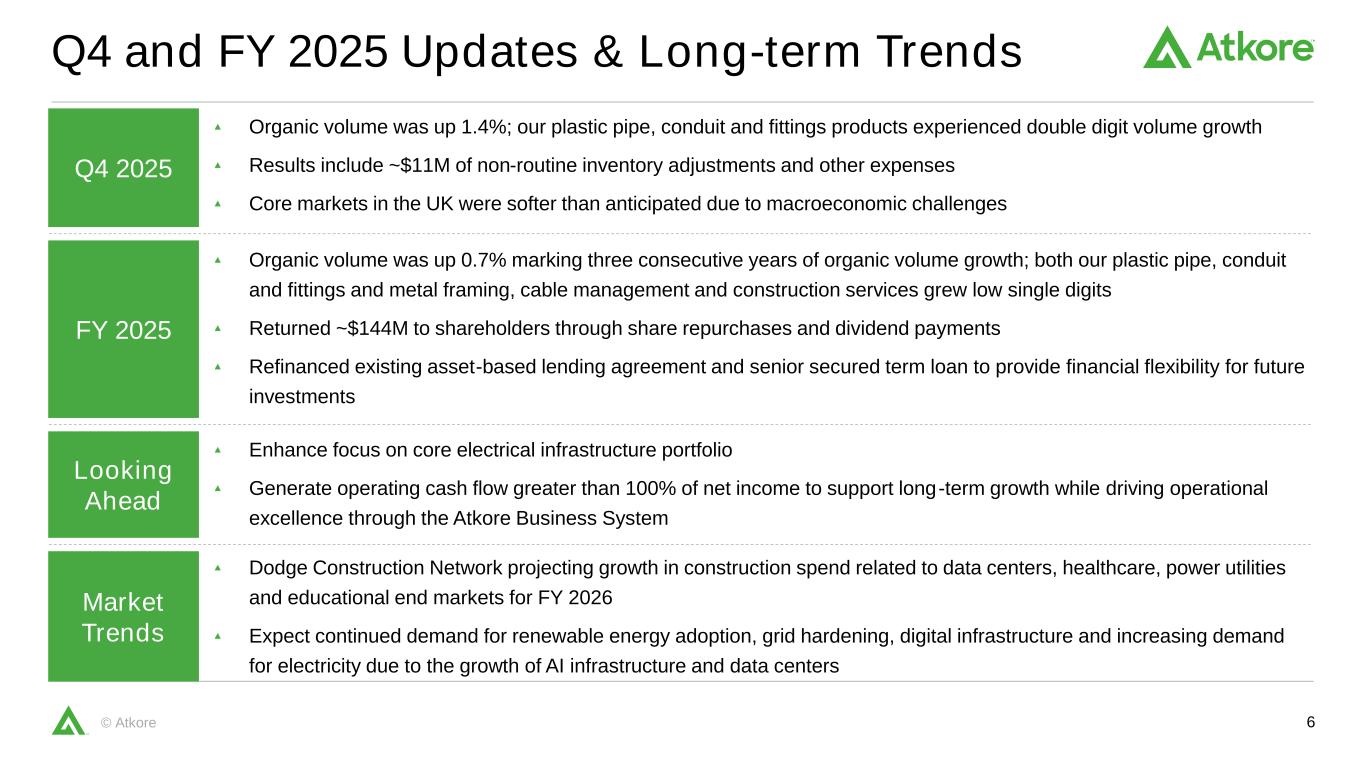 6©Atkore有机销量增长1.4%;我们的塑料管道、导管和配件产品经历了两位数的销量增长结果包括约1100万美元的非常规库存调整和其他费用,由于宏观经济挑战,英国的核心市场比预期疲软,Q4和2025财年更新&长期趋势Q4 2025财年展望未来有机销量增长0.7%,标志着连续三年的有机销量增长;我们的塑料管道、导管和配件以及金属框架,电缆管理和建设服务以低个位数增长通过股票回购和股息支付为现有的基于资产的贷款协议和高级担保定期贷款再融资向股东返还约1.44亿美元,为未来投资提供财务灵活性加强对核心电气基础设施投资组合的关注会产生高于净收入100%的经营现金流,以支持长期增长,同时通过Atkore业务系统推动卓越运营市场趋势道奇建设网络预计,2026财年与数据中心、医疗保健、电力公用事业和教育终端市场相关的建设支出将出现增长,预计对采用可再生能源、电网硬化的需求将持续,人工智能基础设施和数据中心增长带来的数字基础设施和日益增长的电力需求