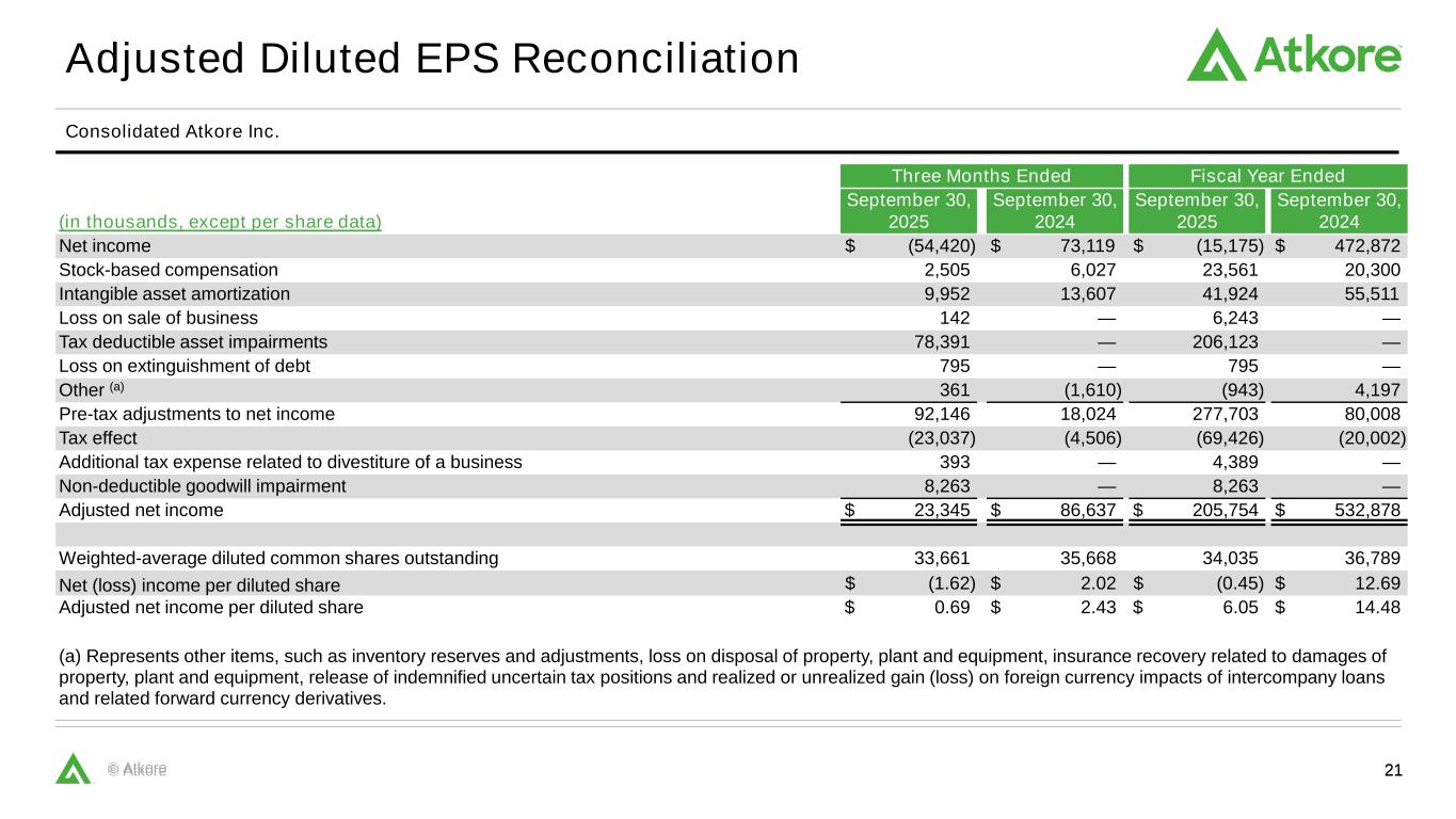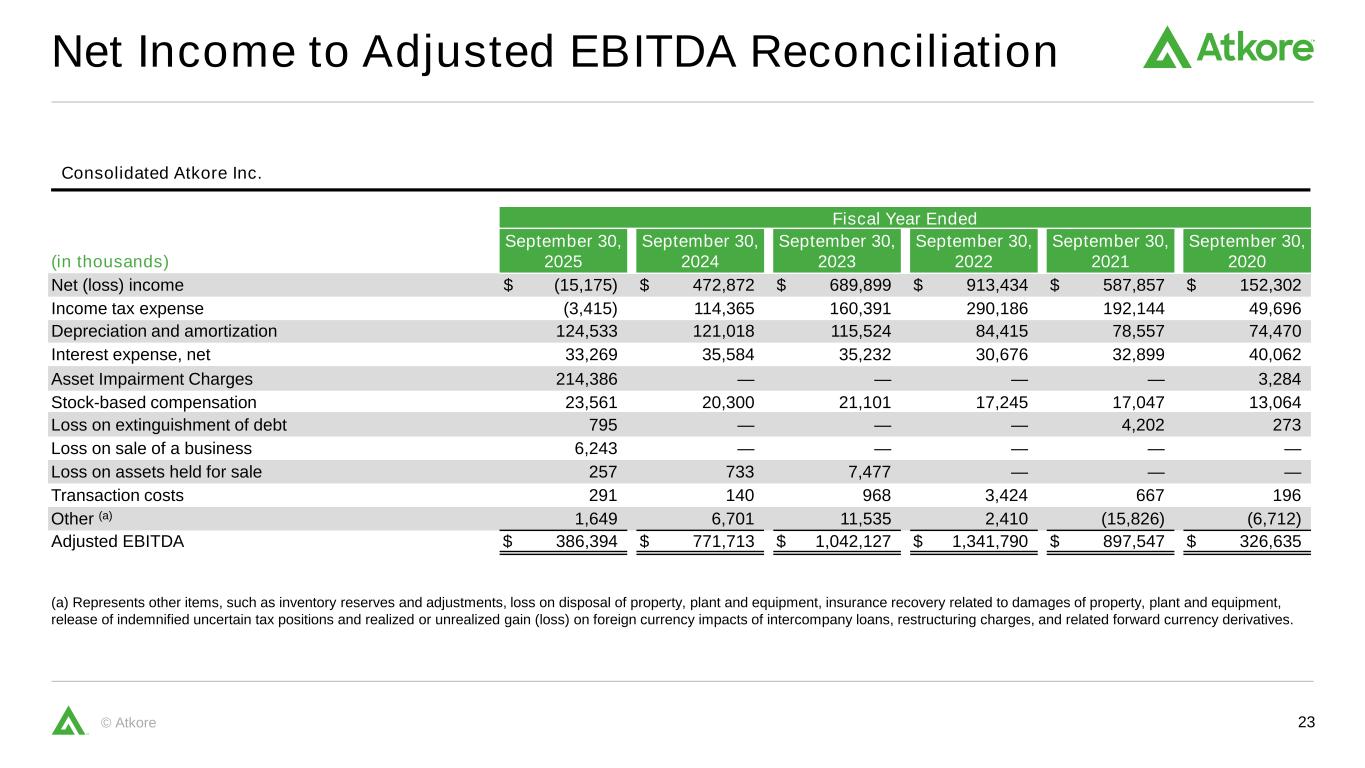 22©Atkore tkore净收入与调整后EBITDA的对账合并Atkore Inc.截至财政年度的三个月(单位:千)2025年9月30日2024年9月30日2025年9月30日2025年9月30日2024年9月30日2024年9月30日净(亏损)收入$(54,420)$ 73,119 $(15,175)$ 472,872所得税费用(11,350)18,759(3,415)114,365折旧和摊销36,92932,611124,533121,018利息费用,净额7,9269,52633,26935,584股票补偿2,5056,02723,56120,300债务清偿损失795 — 795 —出售业务损失142 — 6,243 —资产减值费用86,654 — 214,386 —其他(a)1,7341082,1977,574调整后EBITDA 70,915美元140,150美元386,394美元771,713与咨询和法律服务相关的EBITDA项目中的其他非日常项目5,4425,442与凤凰制造厂的库存调整相关的项目5,8215,821不包括非日常项目的调整后EBITDA 82,178美元397,657美元(a)表示其他项目,例如库存储备和调整,处置不动产、厂房和设备的损失、与不动产、厂房和设备损坏有关的保险赔偿、解除已赔偿的不确定税务状况以及公司间贷款的外汇影响的已实现或未实现收益(损失)、持有待售资产的损失、交易成本、某些法律事项、重组费用以及相关的远期货币衍生工具。
