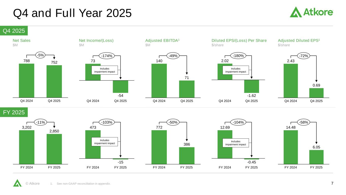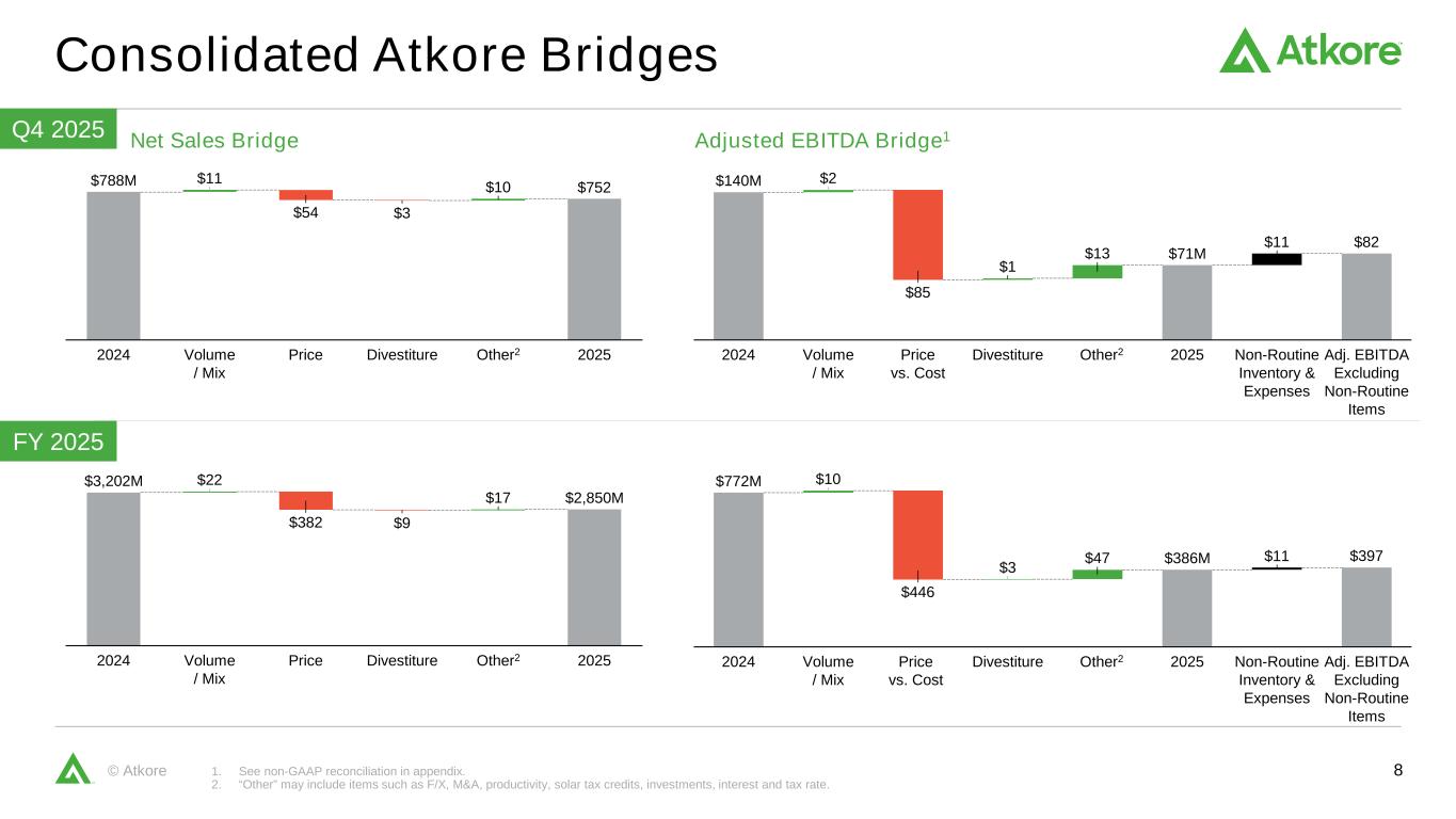 7©Atkore 2025年第四季度和全年1。见附录中的非GAAP调节。788752 Q4 2024 Q4 2025-5 % 73-54 Q4 2024 Q4 2025-174 % 14071 Q4 2024 Q4 2025-49 % 2.43 0.69 Q4 2024 Q4 2025-72 %净销售额$ M净收入/(亏损)$ M调整后EBITDA 1 $ M调整后稀释每股收益1 $/股3,2022,850 FY 2024 FY 2025-11 % 473-15 FY 2024 FY 2025-103 % 772386 FY 2024 FY 2025-50 % 14.486.05 FY 2024 FY 2025-58 % 2.02-1.62 Q4 2024 Q4 2025-180 %稀释每股收益/(亏损)$/股12.69-0.45 FY 2024 FY 2025-104 % Q4 2023Q4 2025 FY 2025包括减值影响包括减值影响包括减值影响包括减值影响