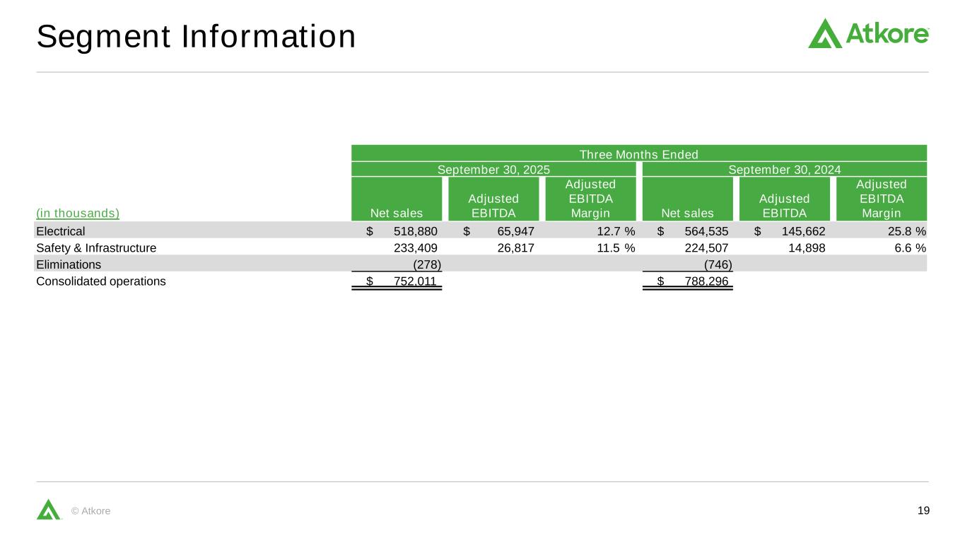 18©Atkore 2025财年损益表摘要1。见附录中的非GAAP调节。2.调整后EBITDA利润率是调整后EBITDA占净销售额的百分比。(百万美元)2025财年2024财年同比变化Y/Y %变化净销售额2,850.4美元3,202.1美元(351.7美元)(11.0%)营业收入23.2美元624.8美元(601.6美元)(96.3%)净(亏损)/收入(15.2美元)472.9美元(488.0美元)(103.2%)调整后EBITDA 1美元386.4美元771.7美元(385.3美元)(49.9%)调整后EBITDA利润率2美元13.6% 24.1%(1050个基点)-税率18.4% 19.5%(110个基点)-每股净(亏损)/收入(稀释后)(0.45美元)12.69美元(13.14美元)(103.5%)调整后稀释后每股收益1美元6.05美元14.48美元(8.43美元)(58.2%)