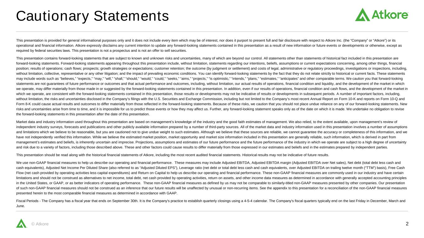 2©Atkore本演示文稿仅供一般参考之用,并不包括可能感兴趣的每一个项目,也无意就Atkore Inc.(“公司”或“Atkore”)或其运营和财务信息提供充分和公平的披露。除非联邦证券法要求,否则Atkore明确表示不打算由于新信息或未来事件或发展或其他原因而更新本演示文稿中包含的任何前瞻性陈述。本演示文稿不是招股说明书,也不是出售证券的要约。本演示文稿包含受已知和未知风险和不确定性影响的前瞻性陈述,其中许多风险和不确定性超出我们的控制范围。本演示文稿中除历史事实陈述外的所有陈述均为前瞻性陈述。本演示文稿中出现的前瞻性陈述包括但不限于关于我们的意图、信念、假设或当前预期的陈述,其中包括财务状况;经营业绩;现金流;前景;增长战略或预期;客户保留;法律、行政或监管程序、调查或检查的结果(通过判决或和解)和成本,包括但不限于集体、代表或任何其他诉讼;以及当前经济状况的影响。您可以通过与历史或当前事实不严格相关这一事实来识别前瞻性陈述。这些陈述可能包括“相信”、“预期”、“可能”、“将”、“应该”、“应该”、“将”、“可以”、“寻求”、“目标”、“项目”、“乐观”、“打算”、“计划”、“估计”、“预期”等类似词语。我们提醒您,前瞻性陈述并非对未来业绩或结果的保证,实际业绩和结果,包括但不限于我们的实际运营结果、财务状况和流动性,以及我们经营所在市场的发展,可能与本演示文稿中包含的前瞻性陈述中做出或暗示的内容存在重大差异。此外,即使我们的经营业绩、财务状况和现金流,以及我们经营所在市场的发展与本演示文稿中包含的前瞻性陈述一致,这些结果或发展可能并不代表后续期间的结果或发展。许多重要因素,包括但不限于公司向美国证券交易委员会提交的文件中披露的风险和不确定性,包括但不限于公司最近的10-K表格年度报告以及10-Q表格和8-K表格报告,可能导致实际结果和结果与前瞻性陈述中反映的结果和结果存在重大差异。由于存在这些风险,我们提醒您,您不应过分依赖我们的任何前瞻性陈述。新的风险和不确定性不时出现,我们无法预测那些事件或它们可能如何影响我们。此外,任何前瞻性陈述仅在作出之日起生效。我们不承担在本演示文稿日期之后修改本演示文稿中的前瞻性陈述的义务。本演示文稿中使用的市场数据和行业信息基于管理层对行业的了解和管理层的善意估计。我们还在现有范围内依赖管理层对独立行业调查、预测和出版物的审查以及由一些第三方来源编制的其他公开信息。本演示文稿中使用的所有市场数据和行业信息都涉及一些我们认为合理的假设和限制,但请注意不要对此类估计给予过度的权重。尽管我们认为这些来源是可靠的,但我们无法保证这些信息的准确性或完整性,我们也没有对这些信息进行独立核实。虽然我们认为本演示文稿中包含的估计市场地位、市场机会和市场规模信息总体上是可靠的,但这些信息部分来自管理层的估计和信念,本质上是不确定和不精确的。对我们未来业绩的预测、假设和估计以及我们经营所在行业的未来业绩由于多种因素而具有高度的不确定性和风险, 包括上面描述的那些。这些因素和其他因素可能导致结果与我们的估计和信念以及独立方编制的估计中表达的结果存在重大差异。此列报方式应与Atkore的历史财务报表一起阅读,包括最近一期经审计的财务报表。历史结果可能并不代表未来的结果。我们使用非公认会计准则财务指标来帮助我们描述我们的运营和财务业绩。这些衡量标准可能包括调整后EBITDA、调整后EBITDA利润率(调整后EBITDA超过净销售额)、净债务(总债务减去现金和现金等价物)、调整后每股摊薄净收益(也称为“调整后摊薄每股收益”)、杠杆率(净债务或总债务减去现金和现金等价物,超过过去12个月调整后EBITDA(“TTM”)、自由现金流(经营活动提供的净现金减去资本支出)和资本回报率,以帮助我们描述我们的经营和财务业绩。这些非GAAP财务指标在我们的行业中普遍使用,具有一定的局限性,不应被解释为替代净收入、总债务、经营活动提供的净现金、资产回报率以及根据美国公认会计原则或GAAP确定的其他收入数据指标,或作为更好的经营业绩指标。我们定义的这些非GAAP财务指标可能无法与其他公司提出的类似标题的非GAAP指标进行比较。我们对这类非GAAP财务指标的表述不应被解释为我们未来业绩将不受异常或非经常性项目影响的推断。请参阅本演示文稿的附录,了解此处介绍的非GAAP财务指标与根据GAAP确定的最具可比性的财务指标的对账。财政期-公司的财政年度于9月30日结束。该公司的惯例是使用4-5-4日历建立季度结算。该公司的财政季度通常在12月、3月和6月的最后一个星期五结束。警示性声明