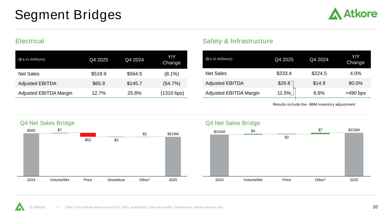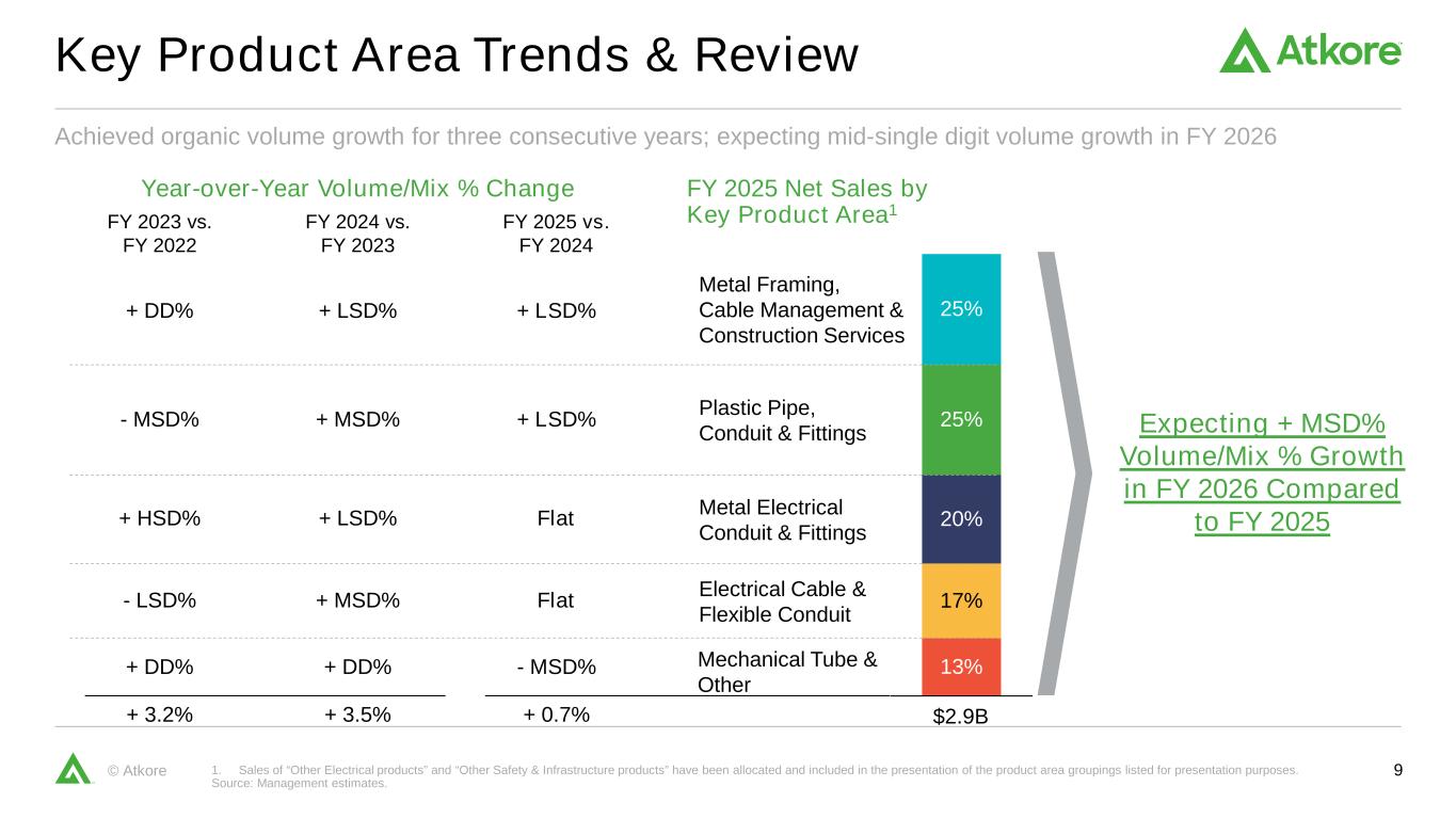 8©Atkore巩固Atkore桥梁1。见附录中的非GAAP调节。2.“其他”可能包括F/X、并购、生产力、太阳能税收抵免、投资、利息和税率等项目。调整后EBITDA Bridge1Net Sales Bridge $ 752 $ 11 $ 54 $ 3 $ 102024数量/混合价格剥离Other22025 $ 7.88亿$ 82 $ 2 $ 85 $ 1 $ 13 $ 112024数量/混合价格vs.成本剥离Other22025 Non-routine Inventory & Expenses Adj. EBITDA excluding non-routine items $ 1.40亿$ 7100万$ 22 $ 382 $ 9 $ 172024数量/混合价格剥离Other22025 $ 32.02亿$ 28.50亿$ 397 $ 10 $ 446 $ 3 $ 47 $ 112024数量/混合价格vs.成本剥离Other22025 Non-routine Inventory & Expenses Adj. EBITDA excluding non-routine items $ 7.72亿$ 3.86亿Q4 2025 FY 2025