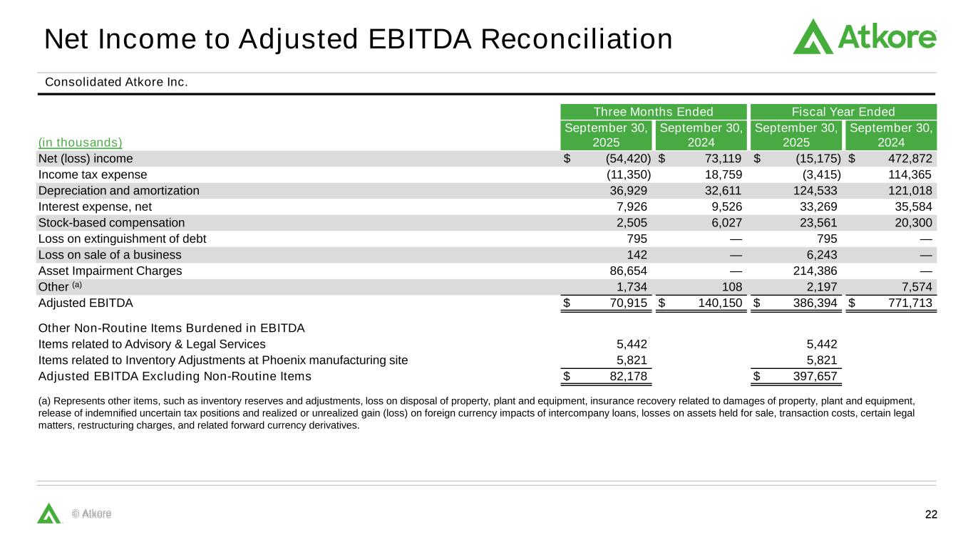 21©Atkore tkore调整后稀释后每股收益对账并表Atkore Inc.截至财政年度的三个月(单位:千,每股数据除外)2025年9月30日2024年9月30日2025年9月30日,2024年净收入$(54,420)$ 73,119 $(15,175)$ 472,872基于股票的补偿2,5056,02723,56120,300无形资产摊销9,95213,60741,92455,511出售业务损失142 — 6,243 —可抵税资产减值78,391 — 206,123 —债务清偿损失795 — 795 —其他(a)361(1,610)(943)4,197对净收入的税前调整92,14618,024277,70380,008税收影响(23,037)(4,506)(69,426)(20,002)与剥离业务相关的额外税收费用393 — 4,389 —不可扣除的商誉减值8,263 — 8,263 —调整后的净收入23,345美元86,532,878美元加权平均稀释后已发行普通股33,66135,66834,03536,789美元每股摊薄净(亏损)收益$(1.62)$ 2.02 $(0.45)$ 12.69调整后每股摊薄净收益$ 0.69 $ 2.43 $ 6.05 $ 14.48(a)代表其他项目,例如库存储备和调整、不动产、厂房和设备处置损失、与不动产、厂房和设备损坏有关的保险赔偿、解除已赔偿的不确定税务状况以及公司间贷款和相关远期货币衍生工具的外汇影响的已实现或未实现收益(损失)。