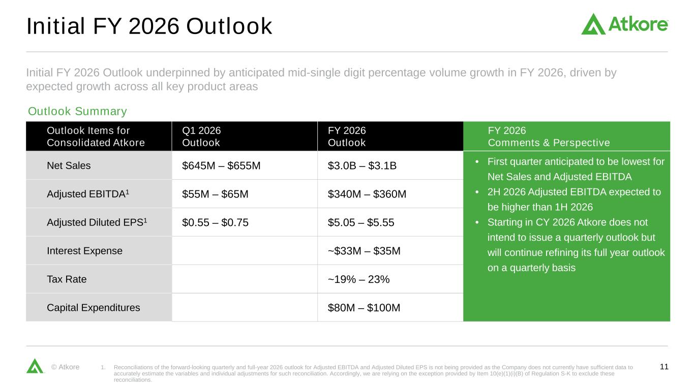 11©Atkore 2026财年初步展望展望摘要1。由于公司目前没有足够的数据来准确估计此类调节的变量和个别调整,因此没有提供调整后EBITDA和调整后稀释每股收益的前瞻性2026年季度和全年前景的调节。因此,我们依赖S-K条例第10(e)(1)(i)(b)项规定的例外情况来排除这些和解。合并Atkore的展望项目2026年第一季度展望2026财年展望2026财年评论&透视净销售额$ 6.45亿– $ 6.55亿$ 3.0b – $ 3.1b •预计第一季度净销售额最低调整后EBITDA • 2026年第二季度调整后EBITDA预计将高于2026年第一季度•从2026年第一季度开始,Atkore不打算发布季度展望,但将继续按季度完善全年展望调整后EBITDA 1 5500万美元– 6500万美元3.4亿美元– 3.6亿美元调整后稀释后每股收益1美元0.55美元– 0.75美元5.05美元– 5.55美元利息支出~3300万美元– 3500万美元税率~19% – 23%资本支出8000万美元– 1亿美元2026财年初步展望受到预期中个位数百分比的销量增长的支撑,这是由所有关键产品领域的预期增长推动的