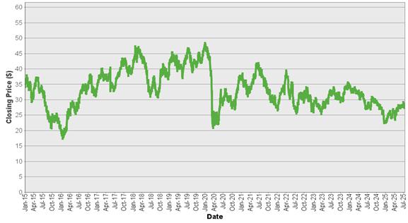 下图显示iShares股票的收盘价®MSCI巴西ETF在2015年1月2日至2025年7月16日期间的每一天都有这样的价格。我们从Bloomberg L.P.获得收盘价,未经独立核实。你不应该拿iShares股票的历史价格®MSCI巴西ETF作为未来表现的指示。