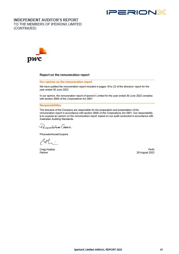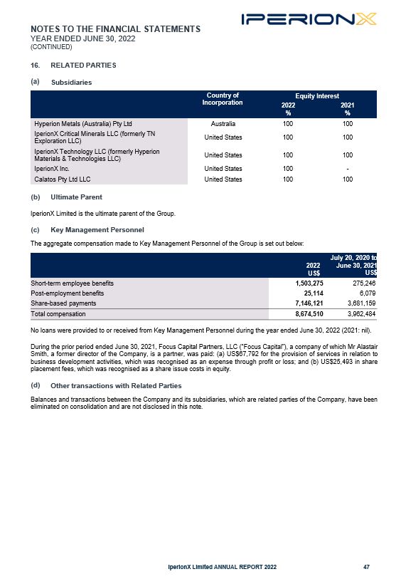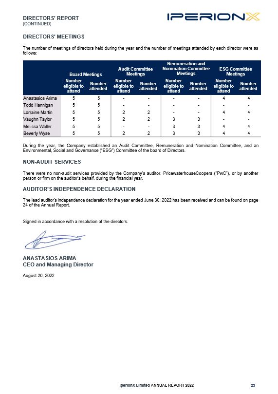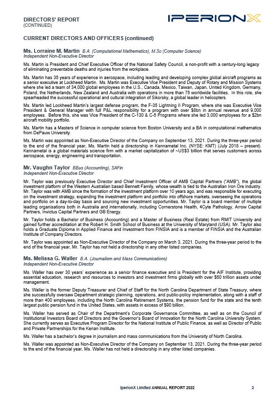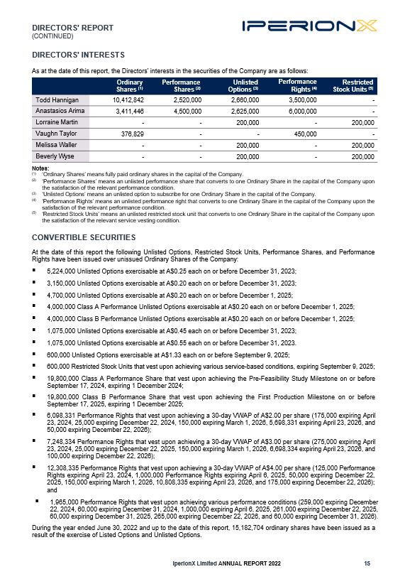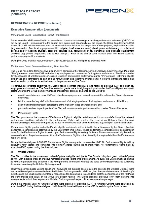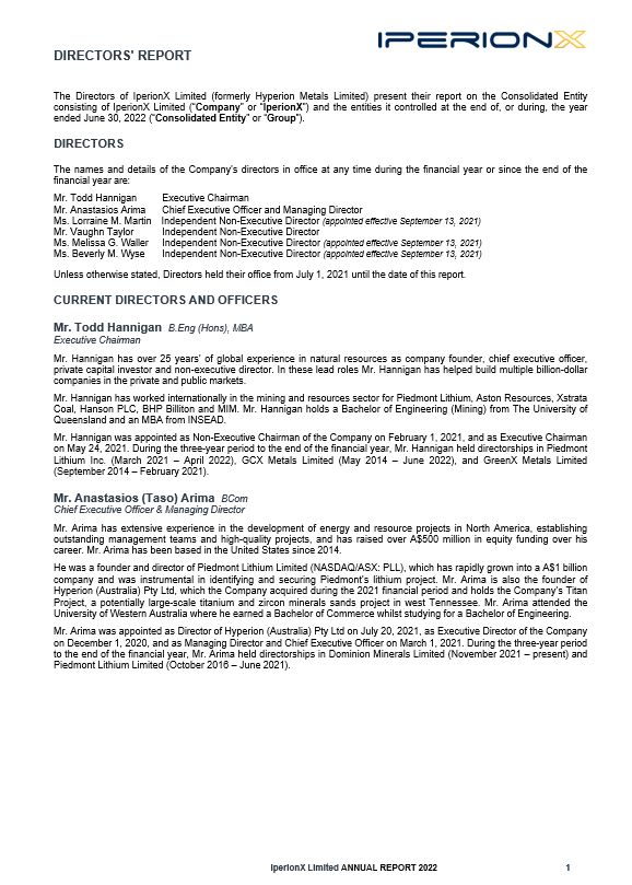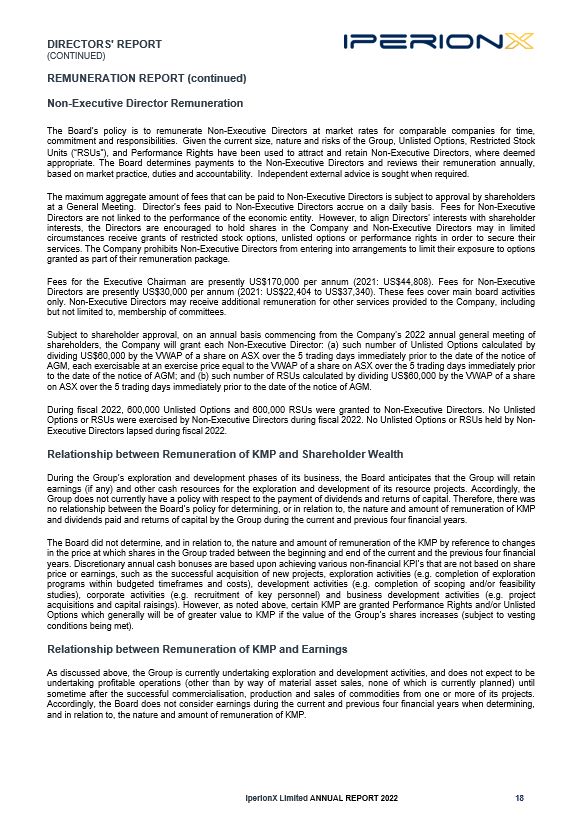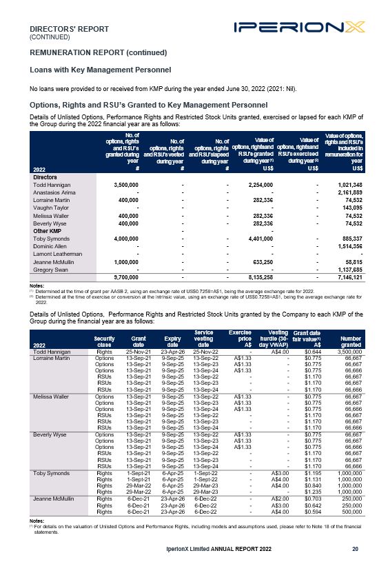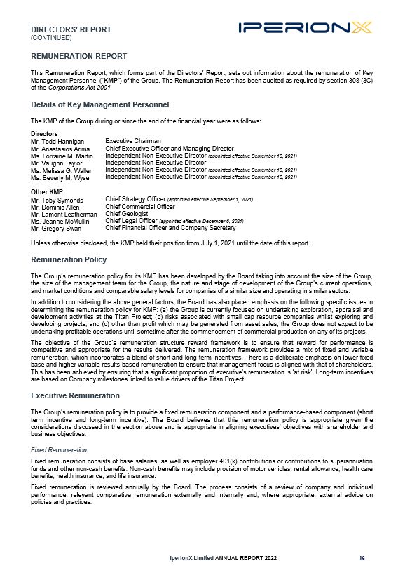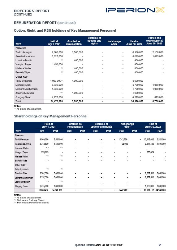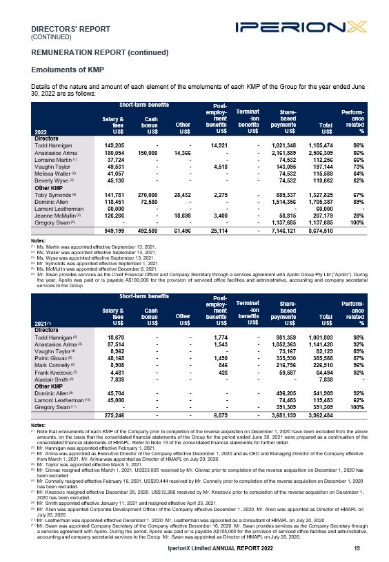 董事报告(续)薪酬报告(续)KMP薪酬截至6月30日止年度集团各KMP薪酬各要素的性质及金额详情,2022年是如下:IperionX Limited 2022年年度报告19短期福利离职后福利美元2022工资和费用美元现金红利美元其他美元终端福利美元股份支付美元总额美元业绩相关%董事丨托德·汉尼根丨149,205--14,921-1,021,3481,185,47486% Anastasios Arima 180,054150,00014,366--2,161,8892,506,30986% Lorraine Martin(1)37,724----74,532112,25666% Vaughn Taylor 49,531--4,518-143,095197,14473% Melissa Waller(2)41,057----74,532115,58964%74,532119,66262%其他KMP Toby Symonds(4)141,781270,00028,4322,275-885,3371,327,82567% Dominic Allen 118,45172,580--1,514,3561,705,38789% Lamont Leatherman 60,000----60,000-Jeanne McMullin(5)126,266-18,6983,400-58,815207,17928% Gregory Swan(6)----1,137,6851,137,685100% 949,199492,58061,49625,114-7,146,1218,674,510注:(1)Martin女士获委任,自2021年9月13日起生效。(2)Waller女士获委任,自2021年9月13日起生效。(3)Wyse女士获委任,自2021年9月13日起生效。(4)西蒙兹先生获委任,自2021年9月1日起生效。(5)McMullin女士获委任,自2021年12月6日起生效。(6)Swan先生通过与Apollo Group Pty Ltd(“Apollo”)签订的服务协议,作为首席财务官和公司秘书提供服务。年内,Apollo因向集团提供服务式办公设施以及行政、会计和公司秘书服务而获得或应支付180,000澳元。短期福利离职后福利2021美元(1)工资和费用美元现金红利美元其他美元终端福利美元股份支付美元总额美元业绩相关%董事Todd Hannigan(2)18,670--1,774-981,3591,001,80398%丨Anastasios Arima Anastasios Arima(3)87,514--1,543-1,052,3631,141,42092% Vaughn Taylor(4)8,962---73,16782,12989% Patric Glovac(5)48,168--1,490-335,930385,58887% Mark Connelly(6)8,908--846-216,756226,51096% Frank Knezovic(7)Smith(8)7,839-----7,839-其他KMP Dominic Allen(9)45,704----496,205541,90992% Lamont Leatherman(10)45,000---74,483119,48362% Gregory Swan(11)----391,309391,309100% 275,246--6,079-3,681,1593,962,484注:(1)请注意,公司于2020年12月1日完成反向收购前各KMP的薪酬已从上述金额中剔除,基于集团截至6月30日止期间的综合财务报表,2021年是作为HMAPL合并财务报表的延续而编制的。详情请参阅综合财务报表附注15。(2)汉尼根先生获委任,自2021年2月1日起生效。(3)Arima先生获委任为公司执行董事,自2020年12月1日起生效,并获委任为公司首席执行官及董事总经理,自2021年3月1日起生效。有马先生于2020年7月20日获委任为HMAPL董事。(4)Taylor先生获委任,自2021年3月3日起生效。(5)Glovac先生辞职,自2021年3月1日起生效。Glovac先生在2020年12月1日完成反向收购之前收到的33,905美元已被排除在外。(6)Connelly先生辞职,自2021年2月18日起生效。Connelly先生在2020年12月1日完成反向收购之前收到的20,444美元已被排除在外。(7)Knezovic先生辞职,自2020年12月29日起生效。Knezovic先生在2020年12月1日完成反向收购之前收到的12,266美元已被排除在外。(8)Smith先生的委任于2021年1月11日生效,并于2021年4月23日辞职。(9)Allen先生获委任为公司企业发展总监,自2020年12月1日起生效。Allen先生于2020年7月20日获委任为HMAPL董事。(10)Leatherman先生获委任,自2020年12月1日起生效。Leatherman先生于2020年7月20日被任命为HMAPL的顾问。(11)Swan先生获委任为公司公司秘书,自2020年12月16日起生效。Swan先生通过与Apollo的服务协议作为公司秘书提供服务。在此期间,Apollo因向集团提供服务式办公设施以及行政、会计和公司秘书服务而获得或应支付105,000澳元。Swan先生于2020年7月20日获委任为HMAPL董事。