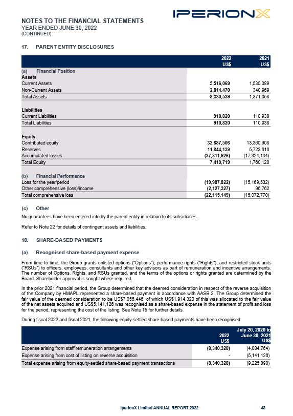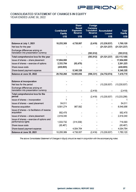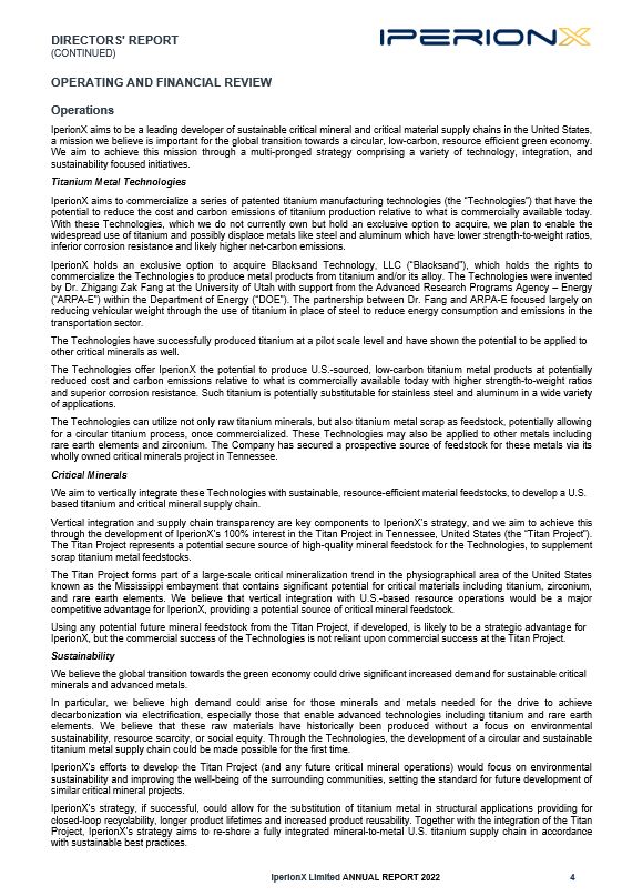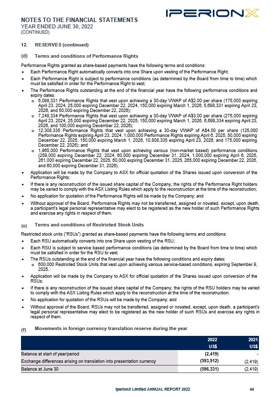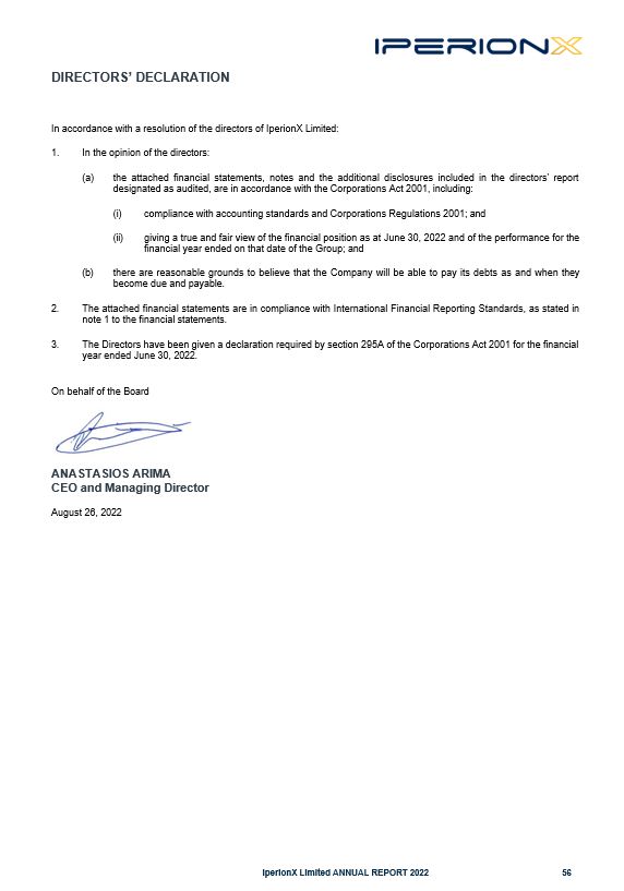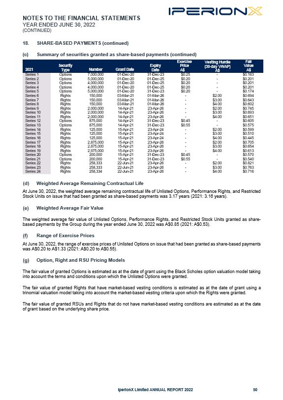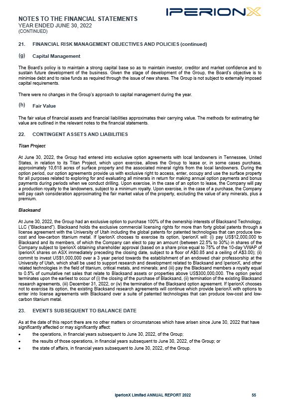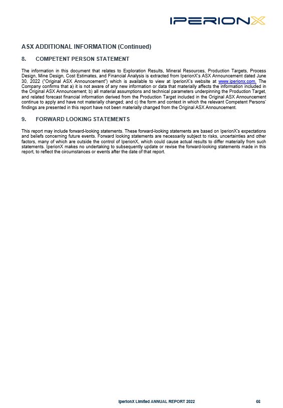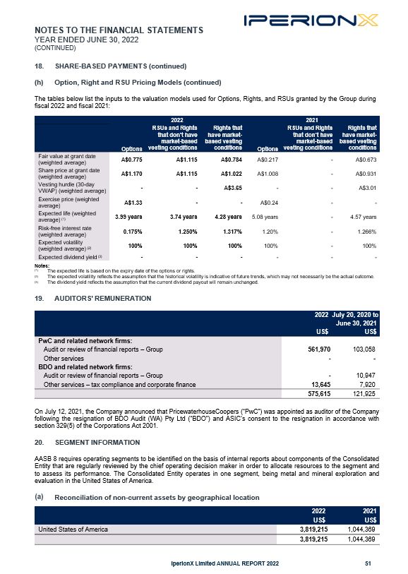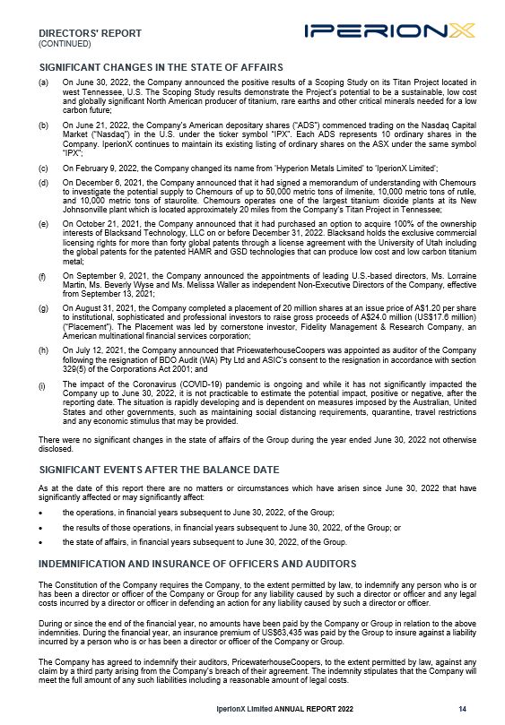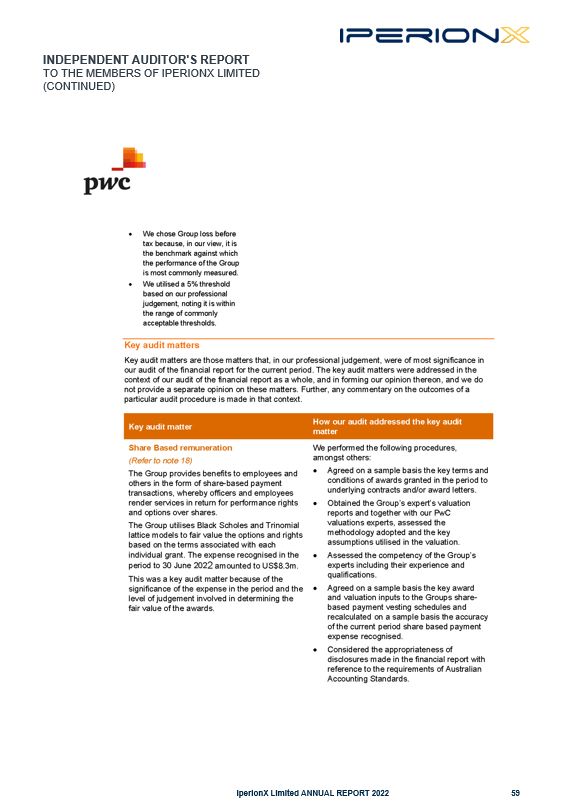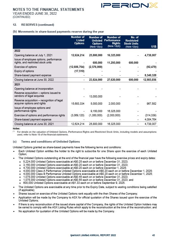 董事报告(续)薪酬报告(续)KMP薪酬截至6月30日止年度集团各KMP薪酬各要素的性质及金额详情,2022年是如下:IperionX Limited 2022年年度报告19短期福利离职后福利美元2022工资和费用美元现金红利美元其他美元终端福利美元股份支付美元总额美元业绩相关%董事丨托德·汉尼根丨149,205--14,921-1,021,3481,185,47486% Anastasios Arima 180,054150,00014,366--2,161,8892,506,30986% Lorraine Martin(1)37,724----74,532112,25666% Vaughn Taylor 49,531--4,518-143,095197,14473% Melissa Waller(2)41,057----74,532115,58964%74,532119,66262%其他KMP Toby Symonds(4)141,781270,00028,4322,275-885,3371,327,82567% Dominic Allen 118,45172,580--1,514,3561,705,38789% Lamont Leatherman 60,000----60,000-Jeanne McMullin(5)126,266-18,6983,400-58,815207,17928% Gregory Swan(6)----1,137,6851,137,685100% 949,199492,58061,49625,114-7,146,1218,674,510注:(1)Martin女士获委任,自2021年9月13日起生效。(2)Waller女士获委任,自2021年9月13日起生效。(3)Wyse女士获委任,自2021年9月13日起生效。(4)西蒙兹先生获委任,自2021年9月1日起生效。(5)McMullin女士获委任,自2021年12月6日起生效。(6)Swan先生通过与Apollo Group Pty Ltd(“Apollo”)签订的服务协议,作为首席财务官和公司秘书提供服务。年内,Apollo因向集团提供服务式办公设施以及行政、会计和公司秘书服务而获得或应支付180,000澳元。短期福利离职后福利2021美元(1)工资和费用美元现金红利美元其他美元终端福利美元股份支付美元总额美元业绩相关%董事Todd Hannigan(2)18,670--1,774-981,3591,001,80398%丨Anastasios Arima Anastasios Arima(3)87,514--1,543-1,052,3631,141,42092% Vaughn Taylor(4)8,962---73,16782,12989% Patric Glovac(5)48,168--1,490-335,930385,58887% Mark Connelly(6)8,908--846-216,756226,51096% Frank Knezovic(7)Smith(8)7,839-----7,839-其他KMP Dominic Allen(9)45,704----496,205541,90992% Lamont Leatherman(10)45,000---74,483119,48362% Gregory Swan(11)----391,309391,309100% 275,246--6,079-3,681,1593,962,484注:(1)请注意,公司于2020年12月1日完成反向收购前各KMP的薪酬已从上述金额中剔除,基于集团截至6月30日止期间的综合财务报表,2021年是作为HMAPL合并财务报表的延续而编制的。详情请参阅综合财务报表附注15。(2)汉尼根先生获委任,自2021年2月1日起生效。(3)Arima先生获委任为公司执行董事,自2020年12月1日起生效,并获委任为公司首席执行官及董事总经理,自2021年3月1日起生效。有马先生于2020年7月20日获委任为HMAPL董事。(4)Taylor先生获委任,自2021年3月3日起生效。(5)Glovac先生辞职,自2021年3月1日起生效。Glovac先生在2020年12月1日完成反向收购之前收到的33,905美元已被排除在外。(6)Connelly先生辞职,自2021年2月18日起生效。Connelly先生在2020年12月1日完成反向收购之前收到的20,444美元已被排除在外。(7)Knezovic先生辞职,自2020年12月29日起生效。Knezovic先生在2020年12月1日完成反向收购之前收到的12,266美元已被排除在外。(8)Smith先生的委任于2021年1月11日生效,并于2021年4月23日辞职。(9)Allen先生获委任为公司企业发展总监,自2020年12月1日起生效。Allen先生于2020年7月20日获委任为HMAPL董事。(10)Leatherman先生获委任,自2020年12月1日起生效。Leatherman先生于2020年7月20日被任命为HMAPL的顾问。(11)Swan先生获委任为公司公司秘书,自2020年12月16日起生效。Swan先生通过与Apollo的服务协议作为公司秘书提供服务。在此期间,Apollo因向集团提供服务式办公设施以及行政、会计和公司秘书服务而获得或应支付105,000澳元。Swan先生于2020年7月20日获委任为HMAPL董事。