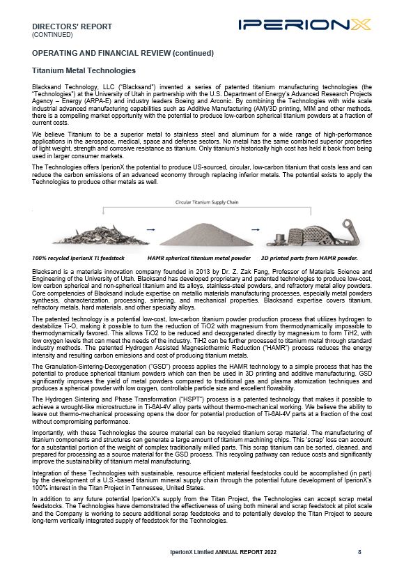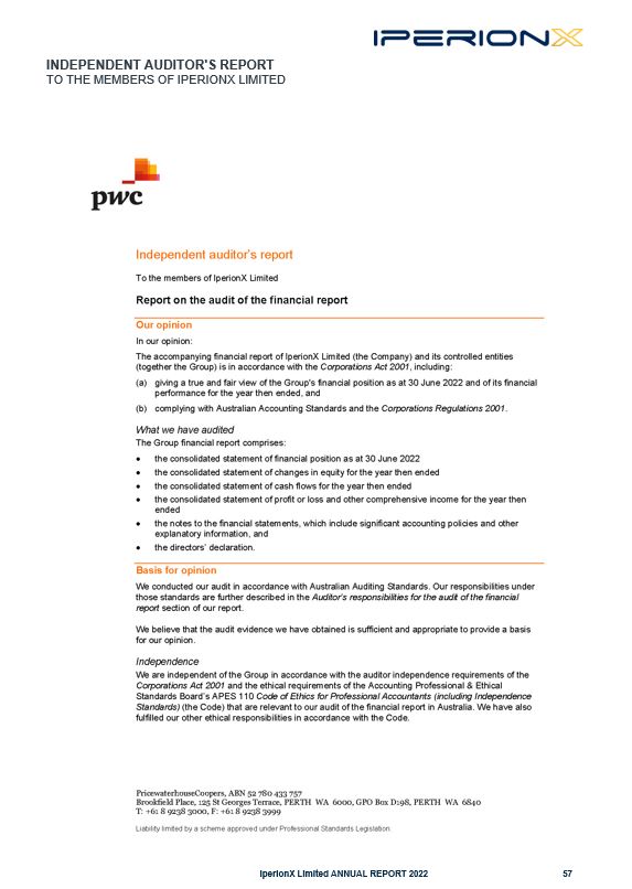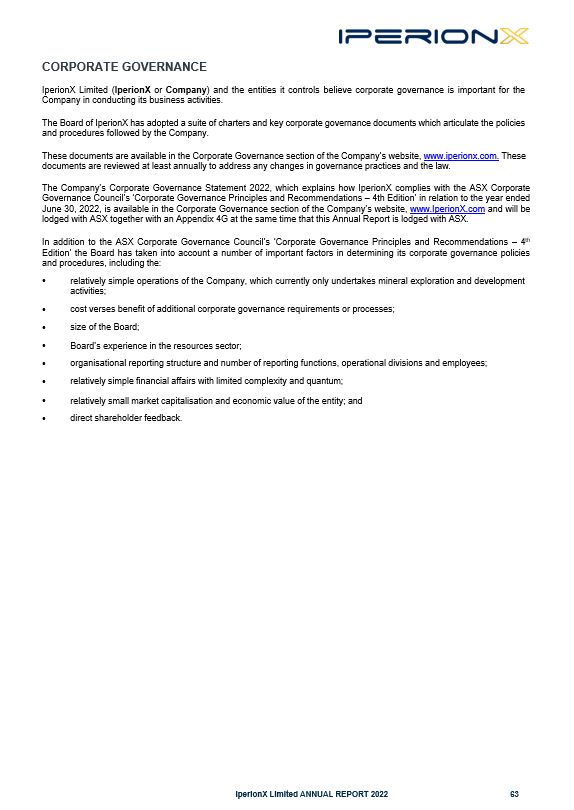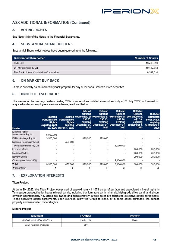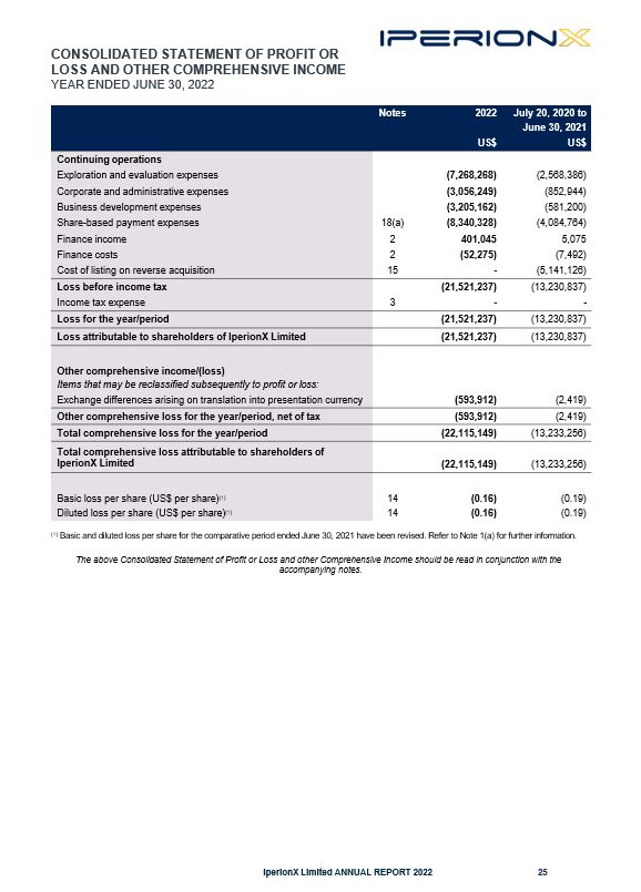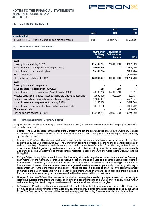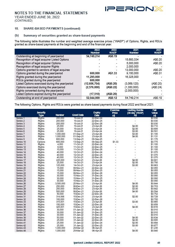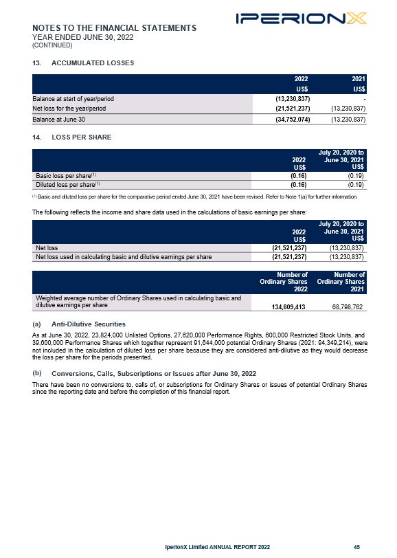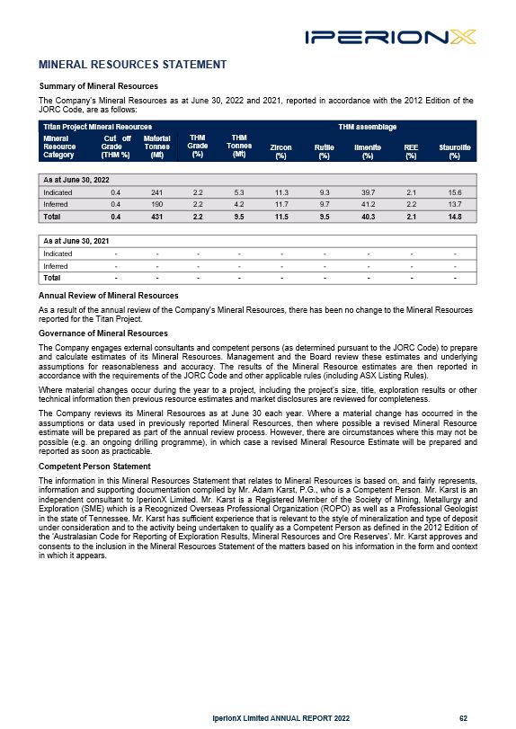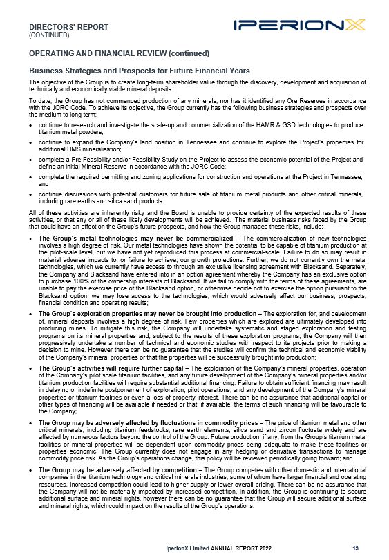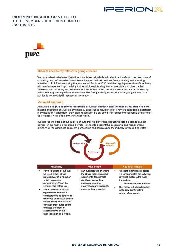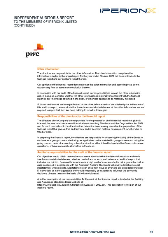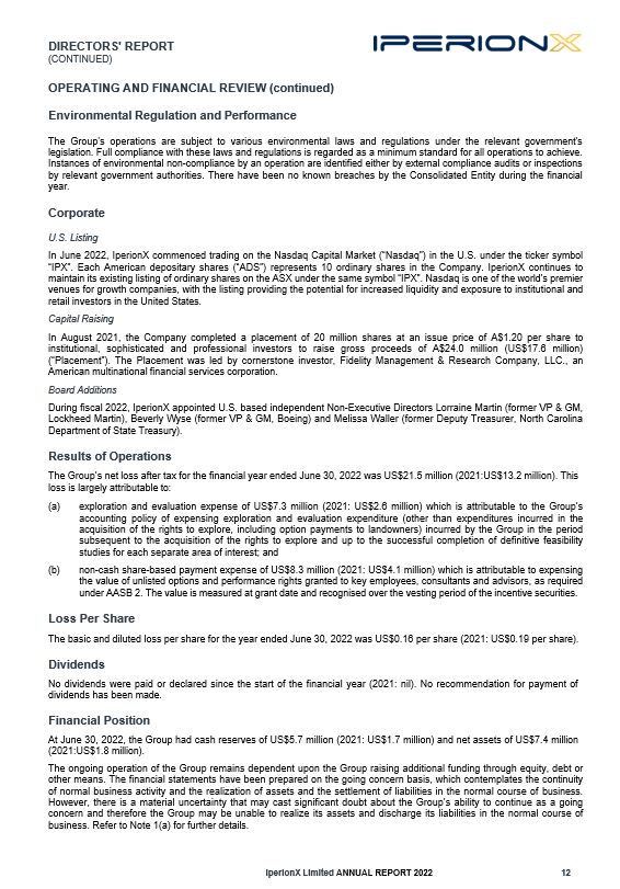 董事报告(续)薪酬报告(续)KMP薪酬截至6月30日止年度集团各KMP薪酬各要素的性质及金额详情,2022年是如下:IperionX Limited 2022年年度报告19短期福利离职后福利美元2022工资和费用美元现金红利美元其他美元终端福利美元股份支付美元总额美元业绩相关%董事丨托德·汉尼根丨149,205--14,921-1,021,3481,185,47486% Anastasios Arima 180,054150,00014,366--2,161,8892,506,30986% Lorraine Martin(1)37,724----74,532112,25666% Vaughn Taylor 49,531--4,518-143,095197,14473% Melissa Waller(2)41,057----74,532115,58964%74,532119,66262%其他KMP Toby Symonds(4)141,781270,00028,4322,275-885,3371,327,82567% Dominic Allen 118,45172,580--1,514,3561,705,38789% Lamont Leatherman 60,000----60,000-Jeanne McMullin(5)126,266-18,6983,400-58,815207,17928% Gregory Swan(6)----1,137,6851,137,685100% 949,199492,58061,49625,114-7,146,1218,674,510注:(1)Martin女士获委任,自2021年9月13日起生效。(2)Waller女士获委任,自2021年9月13日起生效。(3)Wyse女士获委任,自2021年9月13日起生效。(4)西蒙兹先生获委任,自2021年9月1日起生效。(5)McMullin女士获委任,自2021年12月6日起生效。(6)Swan先生通过与Apollo Group Pty Ltd(“Apollo”)签订的服务协议,作为首席财务官和公司秘书提供服务。年内,Apollo因向集团提供服务式办公设施以及行政、会计和公司秘书服务而获得或应支付180,000澳元。短期福利离职后福利2021美元(1)工资和费用美元现金红利美元其他美元终端福利美元股份支付美元总额美元业绩相关%董事Todd Hannigan(2)18,670--1,774-981,3591,001,80398%丨Anastasios Arima Anastasios Arima(3)87,514--1,543-1,052,3631,141,42092% Vaughn Taylor(4)8,962---73,16782,12989% Patric Glovac(5)48,168--1,490-335,930385,58887% Mark Connelly(6)8,908--846-216,756226,51096% Frank Knezovic(7)Smith(8)7,839-----7,839-其他KMP Dominic Allen(9)45,704----496,205541,90992% Lamont Leatherman(10)45,000---74,483119,48362% Gregory Swan(11)----391,309391,309100% 275,246--6,079-3,681,1593,962,484注:(1)请注意,公司于2020年12月1日完成反向收购前各KMP的薪酬已从上述金额中剔除,基于集团截至6月30日止期间的综合财务报表,2021年是作为HMAPL合并财务报表的延续而编制的。详情请参阅综合财务报表附注15。(2)汉尼根先生获委任,自2021年2月1日起生效。(3)Arima先生获委任为公司执行董事,自2020年12月1日起生效,并获委任为公司首席执行官及董事总经理,自2021年3月1日起生效。有马先生于2020年7月20日获委任为HMAPL董事。(4)Taylor先生获委任,自2021年3月3日起生效。(5)Glovac先生辞职,自2021年3月1日起生效。Glovac先生在2020年12月1日完成反向收购之前收到的33,905美元已被排除在外。(6)Connelly先生辞职,自2021年2月18日起生效。Connelly先生在2020年12月1日完成反向收购之前收到的20,444美元已被排除在外。(7)Knezovic先生辞职,自2020年12月29日起生效。Knezovic先生在2020年12月1日完成反向收购之前收到的12,266美元已被排除在外。(8)Smith先生的委任于2021年1月11日生效,并于2021年4月23日辞职。(9)Allen先生获委任为公司企业发展总监,自2020年12月1日起生效。Allen先生于2020年7月20日获委任为HMAPL董事。(10)Leatherman先生获委任,自2020年12月1日起生效。Leatherman先生于2020年7月20日被任命为HMAPL的顾问。(11)Swan先生获委任为公司公司秘书,自2020年12月16日起生效。Swan先生通过与Apollo的服务协议作为公司秘书提供服务。在此期间,Apollo因向集团提供服务式办公设施以及行政、会计和公司秘书服务而获得或应支付105,000澳元。Swan先生于2020年7月20日获委任为HMAPL董事。