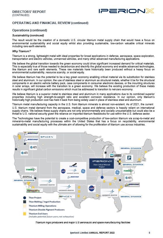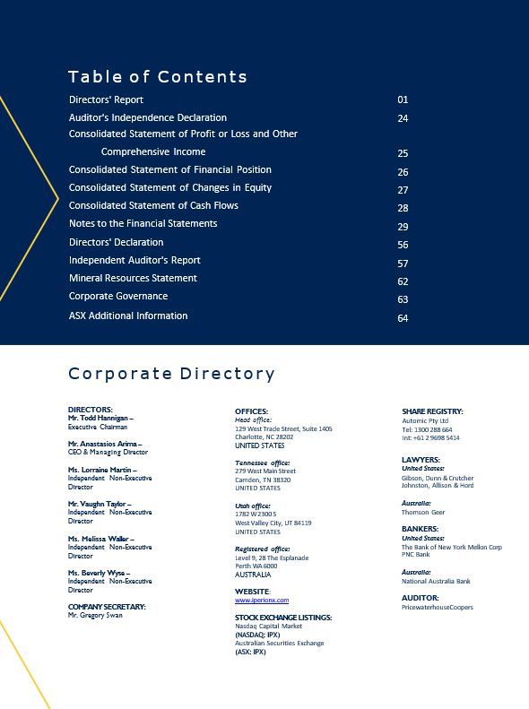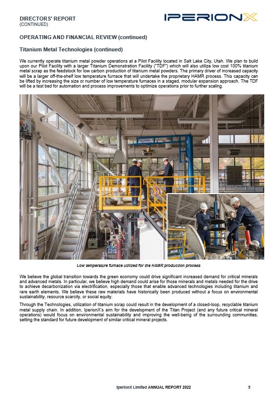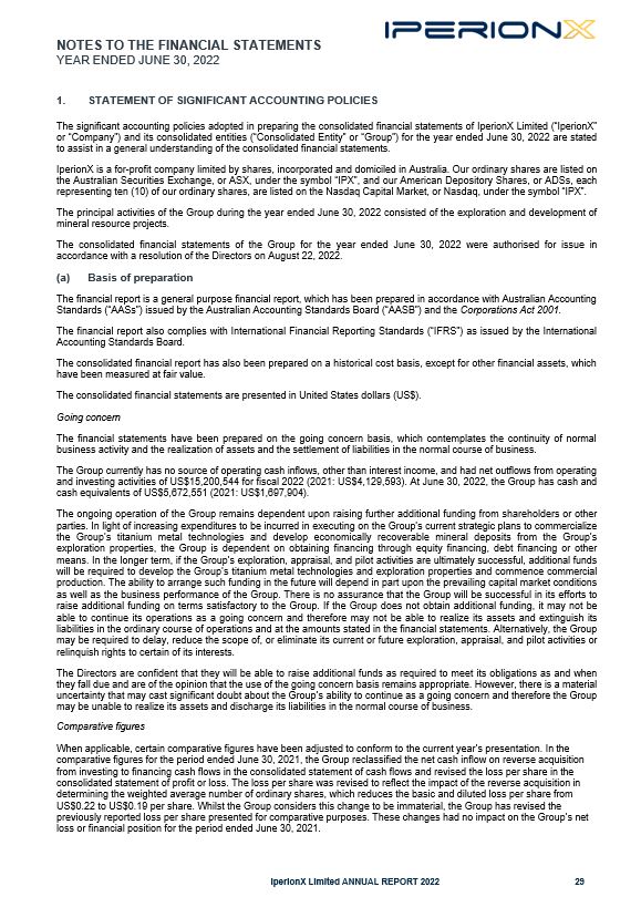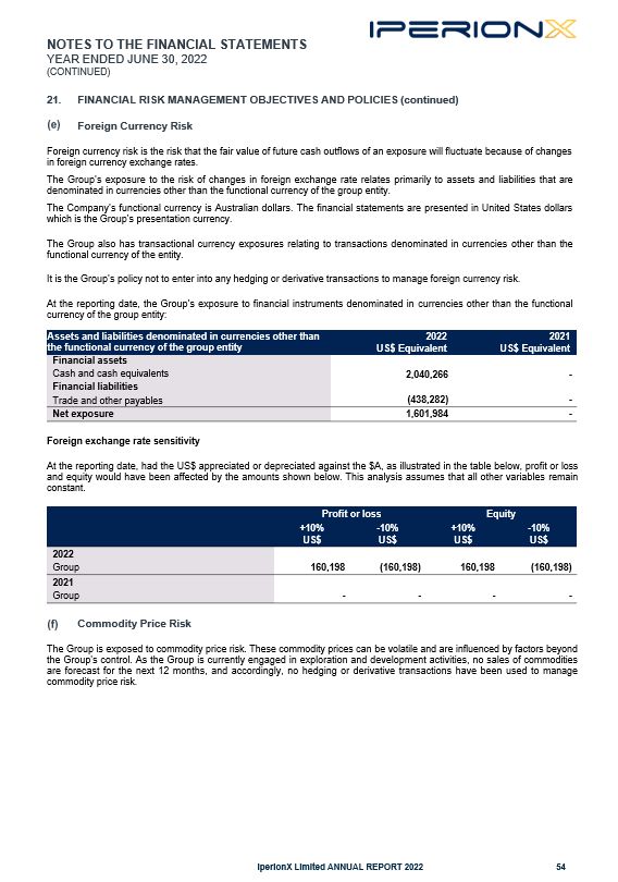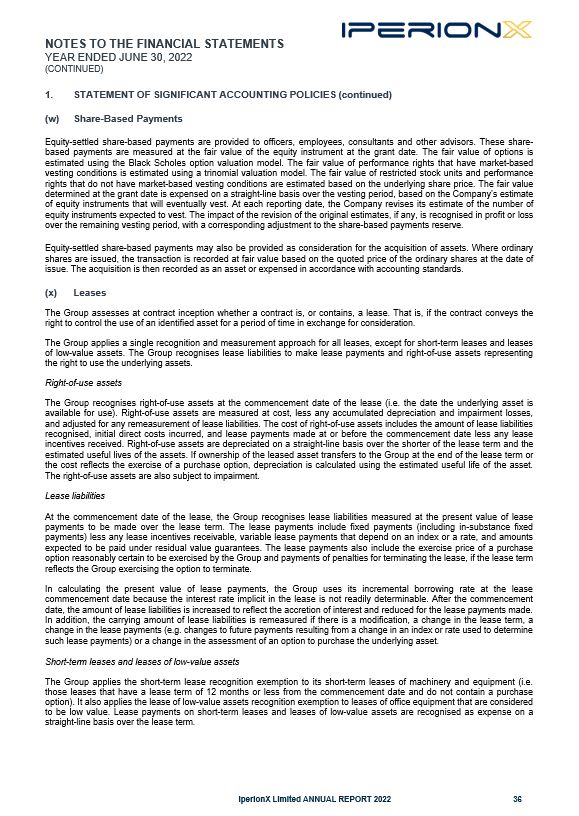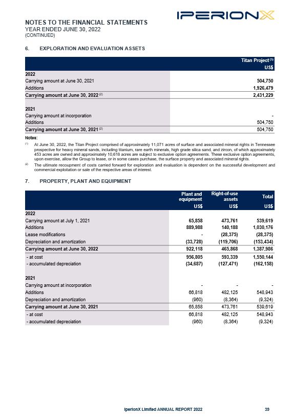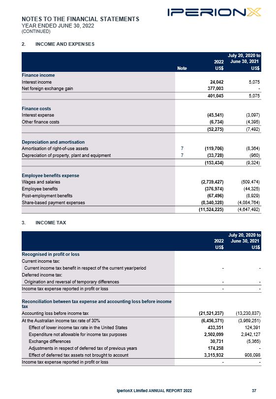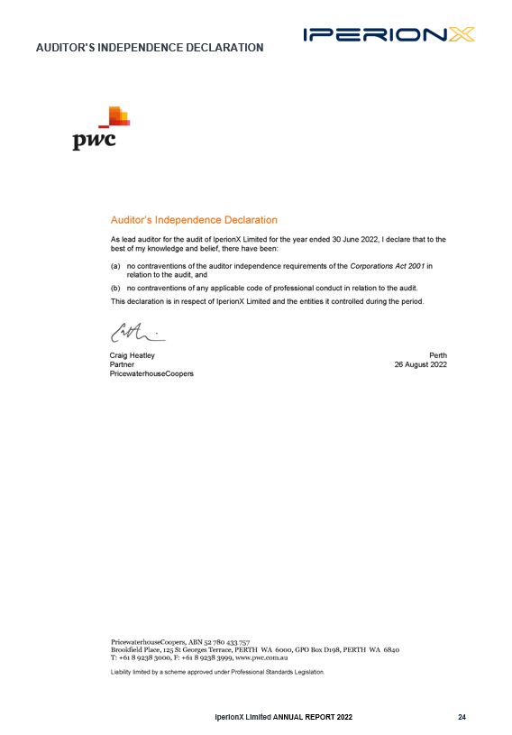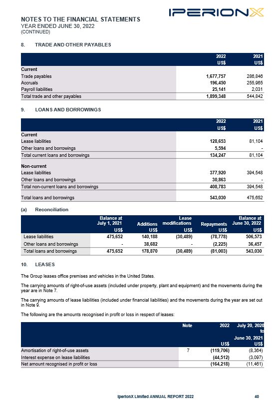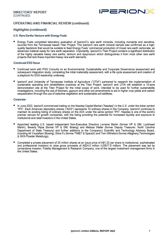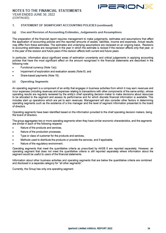 董事报告(续)薪酬报告(续)KMP薪酬截至6月30日止年度集团各KMP薪酬各要素的性质及金额详情,2022年是如下:IperionX Limited 2022年年度报告19短期福利离职后福利美元2022工资和费用美元现金红利美元其他美元终端福利美元股份支付美元总额美元业绩相关%董事丨托德·汉尼根丨149,205--14,921-1,021,3481,185,47486% Anastasios Arima 180,054150,00014,366--2,161,8892,506,30986% Lorraine Martin(1)37,724----74,532112,25666% Vaughn Taylor 49,531--4,518-143,095197,14473% Melissa Waller(2)41,057----74,532115,58964%74,532119,66262%其他KMP Toby Symonds(4)141,781270,00028,4322,275-885,3371,327,82567% Dominic Allen 118,45172,580--1,514,3561,705,38789% Lamont Leatherman 60,000----60,000-Jeanne McMullin(5)126,266-18,6983,400-58,815207,17928% Gregory Swan(6)----1,137,6851,137,685100% 949,199492,58061,49625,114-7,146,1218,674,510注:(1)Martin女士获委任,自2021年9月13日起生效。(2)Waller女士获委任,自2021年9月13日起生效。(3)Wyse女士获委任,自2021年9月13日起生效。(4)西蒙兹先生获委任,自2021年9月1日起生效。(5)McMullin女士获委任,自2021年12月6日起生效。(6)Swan先生通过与Apollo Group Pty Ltd(“Apollo”)签订的服务协议,作为首席财务官和公司秘书提供服务。年内,Apollo因向集团提供服务式办公设施以及行政、会计和公司秘书服务而获得或应支付180,000澳元。短期福利离职后福利2021美元(1)工资和费用美元现金红利美元其他美元终端福利美元股份支付美元总额美元业绩相关%董事Todd Hannigan(2)18,670--1,774-981,3591,001,80398%丨Anastasios Arima Anastasios Arima(3)87,514--1,543-1,052,3631,141,42092% Vaughn Taylor(4)8,962---73,16782,12989% Patric Glovac(5)48,168--1,490-335,930385,58887% Mark Connelly(6)8,908--846-216,756226,51096% Frank Knezovic(7)Smith(8)7,839-----7,839-其他KMP Dominic Allen(9)45,704----496,205541,90992% Lamont Leatherman(10)45,000---74,483119,48362% Gregory Swan(11)----391,309391,309100% 275,246--6,079-3,681,1593,962,484注:(1)请注意,公司于2020年12月1日完成反向收购前各KMP的薪酬已从上述金额中剔除,基于集团截至6月30日止期间的综合财务报表,2021年是作为HMAPL合并财务报表的延续而编制的。详情请参阅综合财务报表附注15。(2)汉尼根先生获委任,自2021年2月1日起生效。(3)Arima先生获委任为公司执行董事,自2020年12月1日起生效,并获委任为公司首席执行官及董事总经理,自2021年3月1日起生效。有马先生于2020年7月20日获委任为HMAPL董事。(4)Taylor先生获委任,自2021年3月3日起生效。(5)Glovac先生辞职,自2021年3月1日起生效。Glovac先生在2020年12月1日完成反向收购之前收到的33,905美元已被排除在外。(6)Connelly先生辞职,自2021年2月18日起生效。Connelly先生在2020年12月1日完成反向收购之前收到的20,444美元已被排除在外。(7)Knezovic先生辞职,自2020年12月29日起生效。Knezovic先生在2020年12月1日完成反向收购之前收到的12,266美元已被排除在外。(8)Smith先生的委任于2021年1月11日生效,并于2021年4月23日辞职。(9)Allen先生获委任为公司企业发展总监,自2020年12月1日起生效。Allen先生于2020年7月20日获委任为HMAPL董事。(10)Leatherman先生获委任,自2020年12月1日起生效。Leatherman先生于2020年7月20日被任命为HMAPL的顾问。(11)Swan先生获委任为公司公司秘书,自2020年12月16日起生效。Swan先生通过与Apollo的服务协议作为公司秘书提供服务。在此期间,Apollo因向集团提供服务式办公设施以及行政、会计和公司秘书服务而获得或应支付105,000澳元。Swan先生于2020年7月20日获委任为HMAPL董事。