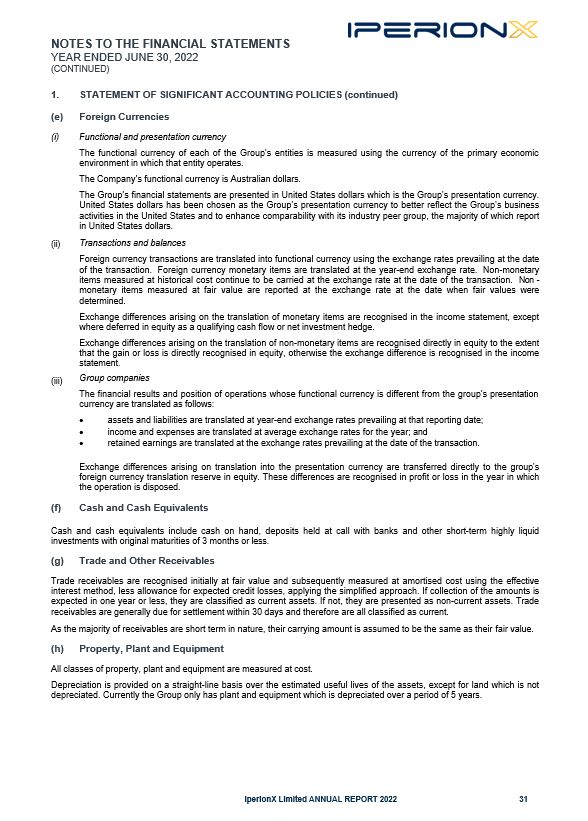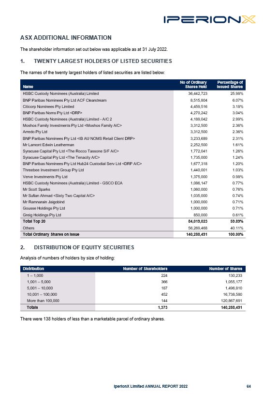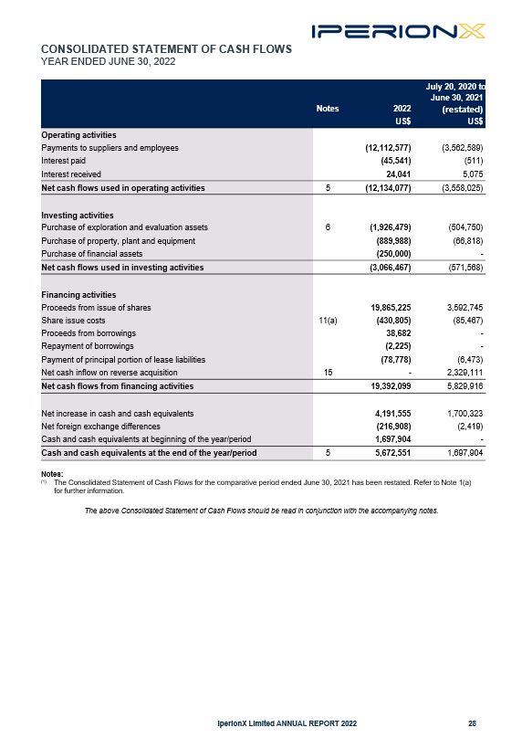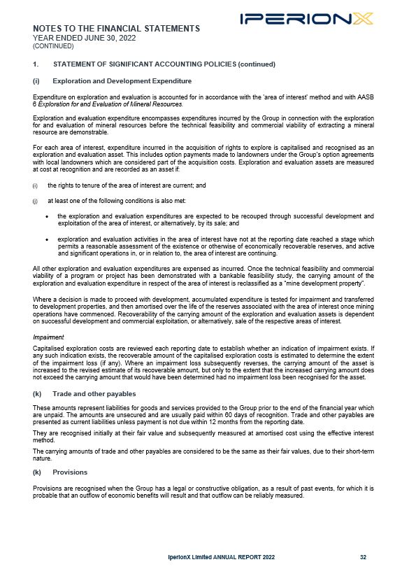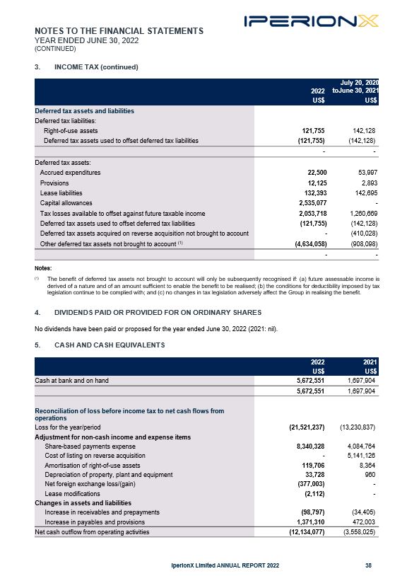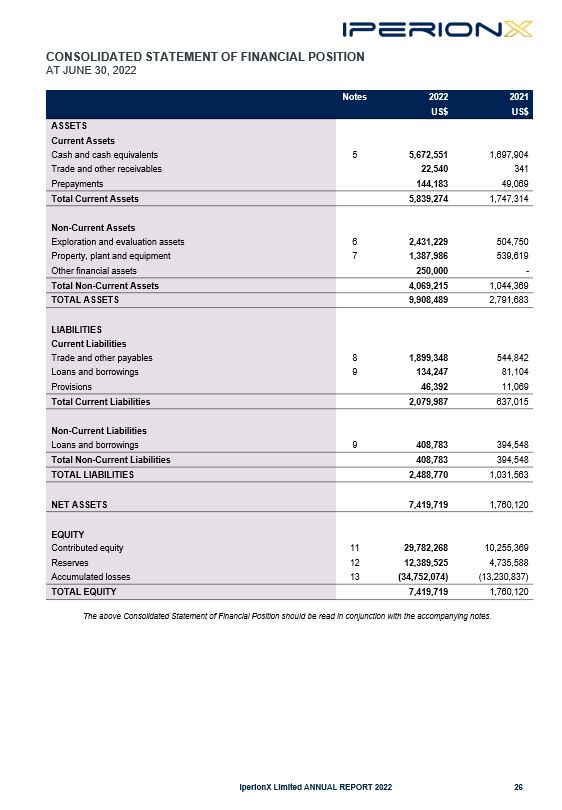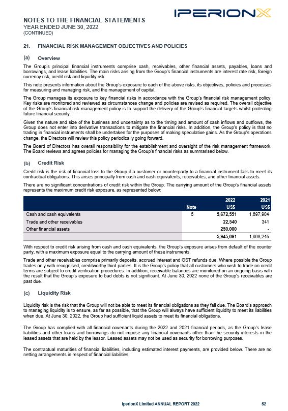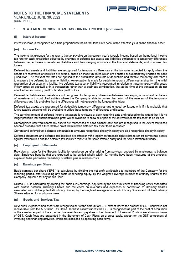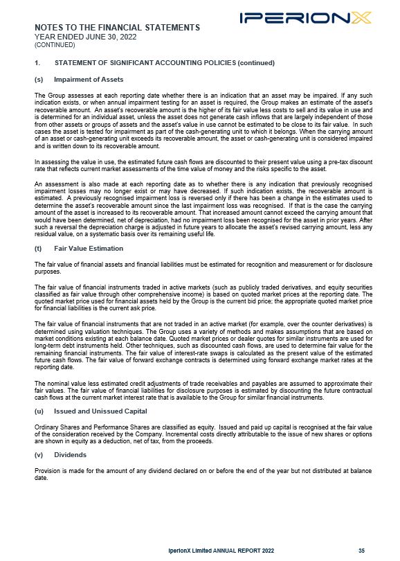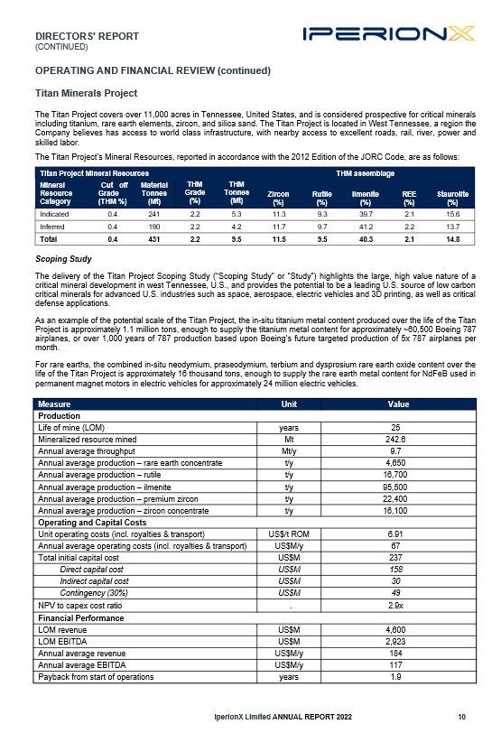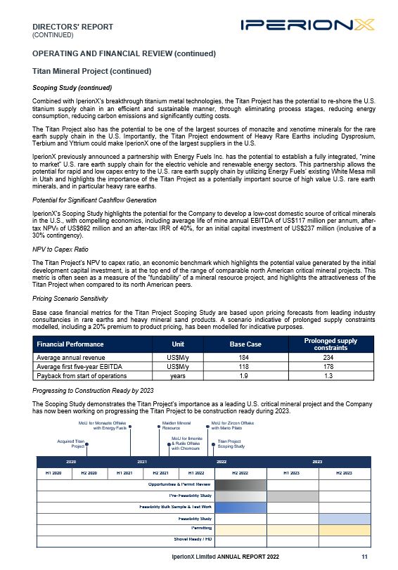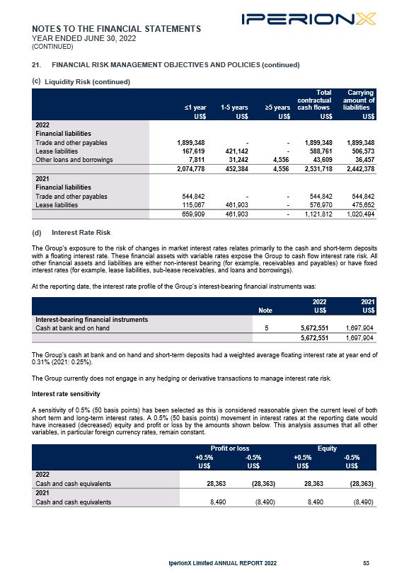 董事报告(续)薪酬报告(续)KMP薪酬截至6月30日止年度集团各KMP薪酬各要素的性质及金额详情,2022年是如下:IperionX Limited 2022年年度报告19短期福利离职后福利美元2022工资和费用美元现金红利美元其他美元终端福利美元股份支付美元总额美元业绩相关%董事丨托德·汉尼根丨149,205--14,921-1,021,3481,185,47486% Anastasios Arima 180,054150,00014,366--2,161,8892,506,30986% Lorraine Martin(1)37,724----74,532112,25666% Vaughn Taylor 49,531--4,518-143,095197,14473% Melissa Waller(2)41,057----74,532115,58964%74,532119,66262%其他KMP Toby Symonds(4)141,781270,00028,4322,275-885,3371,327,82567% Dominic Allen 118,45172,580--1,514,3561,705,38789% Lamont Leatherman 60,000----60,000-Jeanne McMullin(5)126,266-18,6983,400-58,815207,17928% Gregory Swan(6)----1,137,6851,137,685100% 949,199492,58061,49625,114-7,146,1218,674,510注:(1)Martin女士获委任,自2021年9月13日起生效。(2)Waller女士获委任,自2021年9月13日起生效。(3)Wyse女士获委任,自2021年9月13日起生效。(4)西蒙兹先生获委任,自2021年9月1日起生效。(5)McMullin女士获委任,自2021年12月6日起生效。(6)Swan先生通过与Apollo Group Pty Ltd(“Apollo”)签订的服务协议,作为首席财务官和公司秘书提供服务。年内,Apollo因向集团提供服务式办公设施以及行政、会计和公司秘书服务而获得或应支付180,000澳元。短期福利离职后福利2021美元(1)工资和费用美元现金红利美元其他美元终端福利美元股份支付美元总额美元业绩相关%董事Todd Hannigan(2)18,670--1,774-981,3591,001,80398%丨Anastasios Arima Anastasios Arima(3)87,514--1,543-1,052,3631,141,42092% Vaughn Taylor(4)8,962---73,16782,12989% Patric Glovac(5)48,168--1,490-335,930385,58887% Mark Connelly(6)8,908--846-216,756226,51096% Frank Knezovic(7)Smith(8)7,839-----7,839-其他KMP Dominic Allen(9)45,704----496,205541,90992% Lamont Leatherman(10)45,000---74,483119,48362% Gregory Swan(11)----391,309391,309100% 275,246--6,079-3,681,1593,962,484注:(1)请注意,公司于2020年12月1日完成反向收购前各KMP的薪酬已从上述金额中剔除,基于集团截至6月30日止期间的综合财务报表,2021年是作为HMAPL合并财务报表的延续而编制的。详情请参阅综合财务报表附注15。(2)汉尼根先生获委任,自2021年2月1日起生效。(3)Arima先生获委任为公司执行董事,自2020年12月1日起生效,并获委任为公司首席执行官及董事总经理,自2021年3月1日起生效。有马先生于2020年7月20日获委任为HMAPL董事。(4)Taylor先生获委任,自2021年3月3日起生效。(5)Glovac先生辞职,自2021年3月1日起生效。Glovac先生在2020年12月1日完成反向收购之前收到的33,905美元已被排除在外。(6)Connelly先生辞职,自2021年2月18日起生效。Connelly先生在2020年12月1日完成反向收购之前收到的20,444美元已被排除在外。(7)Knezovic先生辞职,自2020年12月29日起生效。Knezovic先生在2020年12月1日完成反向收购之前收到的12,266美元已被排除在外。(8)Smith先生的委任于2021年1月11日生效,并于2021年4月23日辞职。(9)Allen先生获委任为公司企业发展总监,自2020年12月1日起生效。Allen先生于2020年7月20日获委任为HMAPL董事。(10)Leatherman先生获委任,自2020年12月1日起生效。Leatherman先生于2020年7月20日被任命为HMAPL的顾问。(11)Swan先生获委任为公司公司秘书,自2020年12月16日起生效。Swan先生通过与Apollo的服务协议作为公司秘书提供服务。在此期间,Apollo因向集团提供服务式办公设施以及行政、会计和公司秘书服务而获得或应支付105,000澳元。Swan先生于2020年7月20日获委任为HMAPL董事。