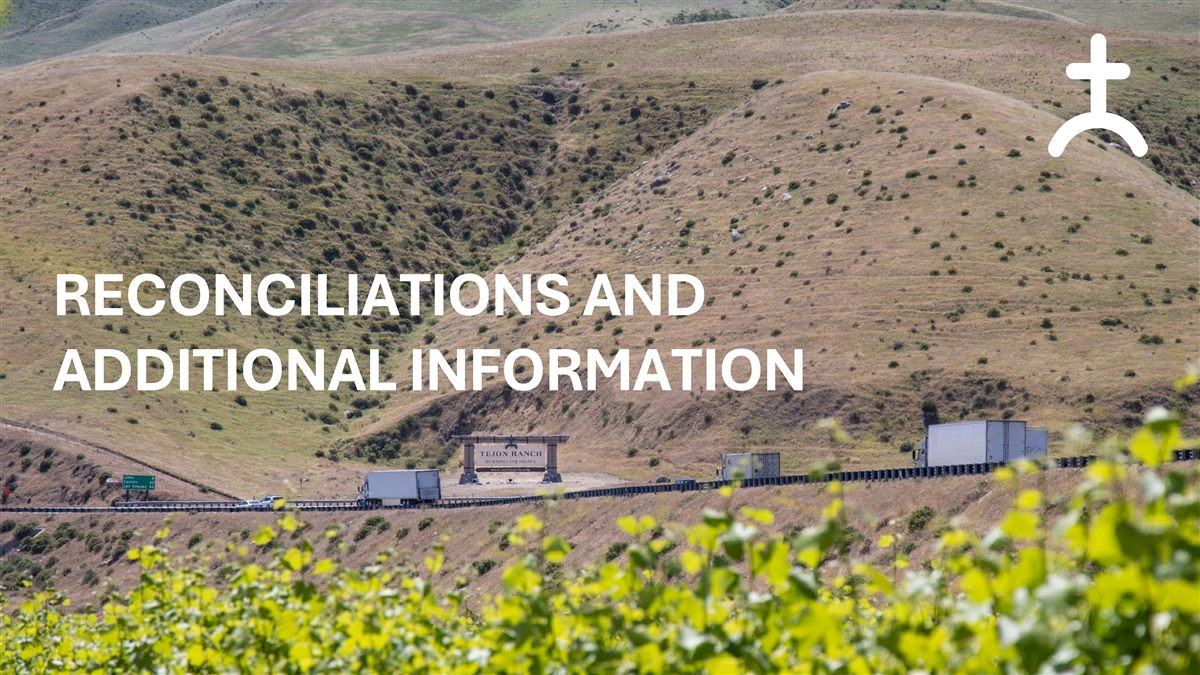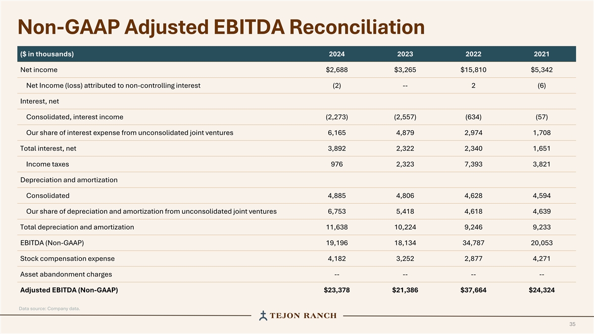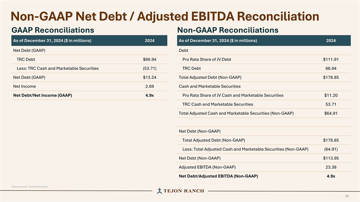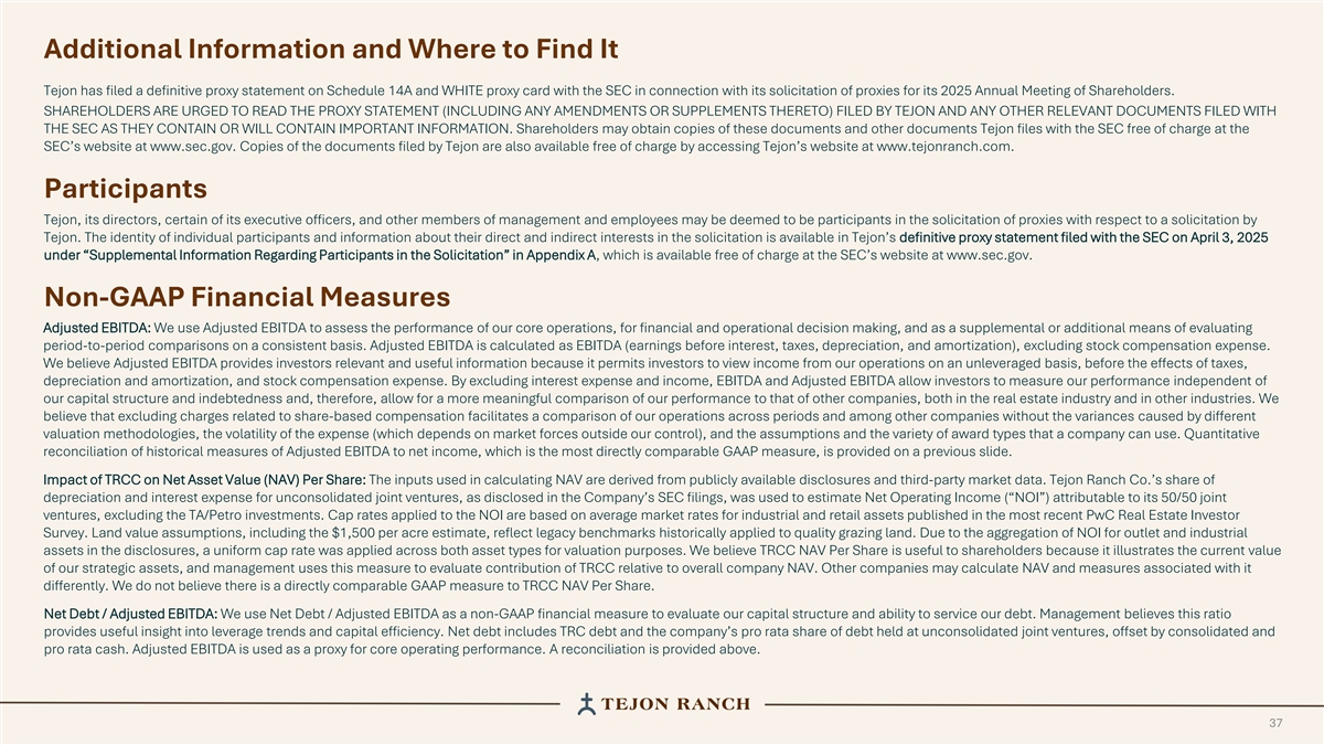 附加信息和在哪里可以找到Tejon已向SEC提交了一份关于附表14A和白色代理卡的最终代理声明,涉及其为2025年年度股东大会征集代理。敦促股东阅读TEJON提交的代理声明(包括对其的任何修订或补充)以及向SEC提交的任何其他相关文件,因为它们包含或将包含重要信息。股东可以在SEC网站www.sec.gov上免费获得这些文件和Tejon向SEC提交的其他文件的副本。Tejon提交的文件副本也可通过访问Tejon网站www.tejonranch.com免费获得。参与者Tejon、其董事、其某些执行官以及管理层的其他成员和员工可能被视为Tejon征集代理的参与者。Tejon于2025年4月3日在附录A的“关于征集参与者的补充信息”下向SEC提交的最终代理声明中提供了个人参与者的身份以及有关其在征集中直接和间接利益的信息,该声明可在SEC网站www.sec.gov上免费获取。非GAAP财务指标调整后EBITDA:我们使用调整后EBITDA来评估我们核心业务的业绩,用于财务和运营决策,并作为在一致基础上评估期间比较的补充或额外手段。调整后的EBITDA计算为EBITDA(息税折旧摊销前利润),不包括股票补偿费用。我们认为,调整后的EBITDA为投资者提供了相关和有用的信息,因为它允许投资者在没有杠杆的基础上查看我们运营的收入,在税收、折旧和摊销以及股票补偿费用的影响之前。通过排除利息支出和收入,EBITDA和调整后EBITDA使投资者能够独立于我们的资本结构和债务来衡量我们的业绩,因此,我们可以与其他公司的业绩进行更有意义的比较,无论是在房地产行业还是在其他行业。我们认为,排除与股份薪酬相关的费用有助于比较我们在不同期间和其他公司之间的运营,而不会出现不同估值方法导致的差异、费用的波动性(这取决于我们无法控制的市场力量)以及公司可以使用的假设和奖励类型的多样性。上一张幻灯片提供了调整后EBITDA与净收入的历史衡量标准的量化对账,这是最直接可比的GAAP衡量标准。TRCC对每股资产净值(NAV)的影响:用于计算NAV的输入数据来自公开披露和第三方市场数据。正如该公司提交给美国证券交易委员会的文件所披露的,Tejon Ranch Co.在未合并合资企业的折旧和利息费用中所占份额用于估计归属于其50/50合资企业的净营业收入(“NOI”),不包括TA/Petro投资。适用于NOI的上限利率基于普华永道房地产投资者调查中公布的工业和零售资产的平均市场利率。土地价值假设,包括每英亩1500美元的估计,反映了历史上适用于优质牧场的遗留基准。由于在披露中汇总了奥特莱斯和工业资产的NOI,出于估值目的,对这两种资产类型适用了统一的上限率。我们认为TRCC每股NAV对股东有用,因为它说明了我们战略资产的当前价值,管理层使用这一衡量标准来评估TRCC相对于整体公司NAV的贡献。其他公司可能会以不同的方式计算NAV和与之相关的衡量标准。我们认为没有与TRCC每股NAV直接可比的GAAP衡量标准。净债务/调整后EBITDA:我们使用净债务/调整后EBITDA作为非公认会计准则财务指标来评估我们的资本结构和偿债能力。管理层认为,这一比率提供了对杠杆趋势和资本效率的有用洞察。净债务包括TRC债务和公司在未合并的合资企业持有的债务的按比例份额,由合并和按比例现金抵消。调整后EBITDA被用作核心经营业绩的代表。上面提供了对账。37