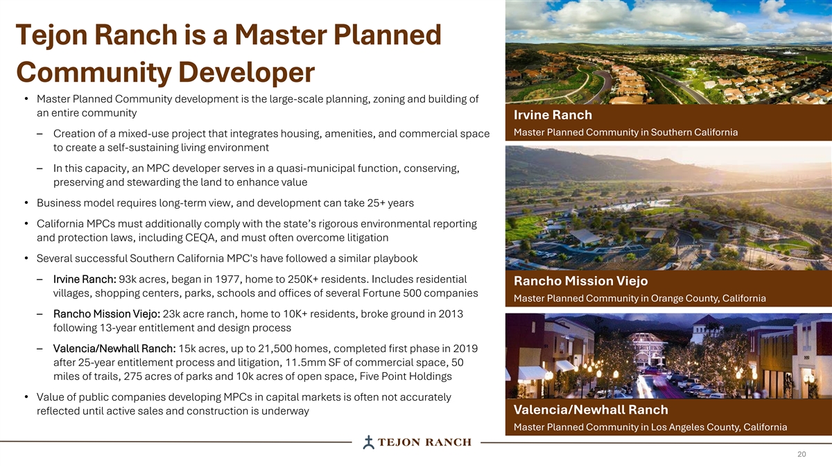 Tejon牧业是一家总规划社区开发商•总规划社区开发是对位于南加州的整个社区欧文牧场总规划社区进行大规模规划、分区和建设–创建一个集住房、便利设施、商业空间于一体的混合用途项目,以创造一个自我维持的生活环境–在这个身份下,MPC开发商服务于准市政职能,养护、保存和管理土地以提升价值•商业模式需要长远的眼光,开发可能需要25年以上的时间•加利福尼亚州的MPC还必须遵守该州严格的环境报告和保护法律,包括CEQA,并且必须经常克服诉讼•几个成功的南加州MPC遵循了类似的剧本——欧文牧场:93k英亩,始于1977年,拥有250k +居民。包括位于加利福尼亚州Orange County的多家财富500强公司Master Planned Community的住宅Rancho Mission Viejo村庄、购物中心、公园、学校和办公室– Rancho Mission Viejo:占地23k英亩的牧场,拥有10K +居民,经过13年的权利和设计过程,于2013年破土动工– Valencia/Newhall Ranch:1.5k英亩,多达2.15万套住宅,经过25年的权利过程和诉讼,于2019年完成第一阶段,11.5mm SF的商业空间、50英里的小径、275英亩的公园和1万英亩的空地,五点控股 •在积极的销售和建设开始之前,发展MPC的公众公司在资本市场上的价值通常无法准确反映出来加利福尼亚州洛杉矶县的Valencia/Newhall Ranch Master Planned Community 20