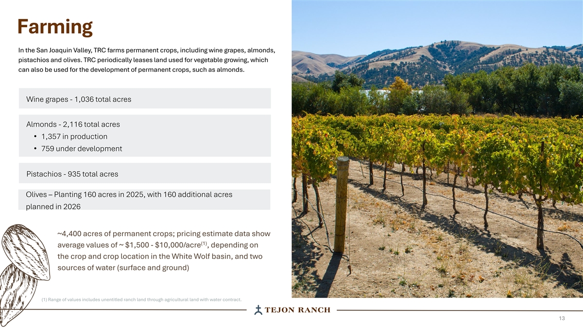 在圣华金河谷务农,TRC种植永久性作物,包括酿酒葡萄、杏仁、开心果和橄榄。TRC会定期出租用于蔬菜种植的土地,这些土地也可以用于种植永久性作物的发展,例如杏仁。酿酒葡萄-1,036总英亩杏仁-2,116总英亩• 1,357在产• 759个正在开发的开心果-935总英亩橄榄– 2025年种植160英亩,2026年计划增加160英亩~4,400英亩永久作物;定价估计数据显示(1)平均价值约为1,500美元-10,000美元/英亩,取决于白狼盆地的作物和作物位置,以及两种水源(地表和地面)(1)价值范围包括通过有水合同的农业用地未获得授权的牧场土地。13