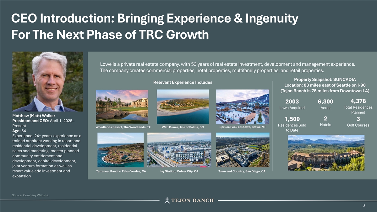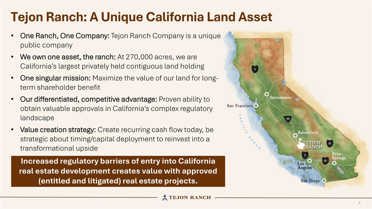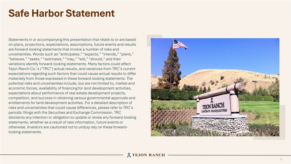 安全港声明本演示文稿中或随附的与计划、预测、预期、假设、未来事件和结果相关或基于此的声明是涉及许多风险和不确定性的前瞻性声明。“预期”、“预期”、“打算”、“计划”、“相信”、“寻求”、“估计”、“可能”、“将”、“应该”等词及其变体可识别前瞻性陈述。许多因素可能会影响Tejon Ranch Co.(“TRC”)的实际结果,以及与TRC当前对此类因素的预期存在差异,这些因素可能导致实际结果与这些前瞻性陈述中表达的结果存在重大差异。潜在的风险和不确定因素包括但不限于市场和经济力量、土地开发活动融资的可获得性、对房地产开发项目业绩的预期、竞争以及成功获得各种政府批准和土地开发活动的权利。有关可能导致差异的风险和不确定性的详细描述,请参阅TRC定期向美国证券交易委员会提交的文件。TRC不承担任何更新或修改任何前瞻性陈述的意图或义务,无论是由于新信息、未来事件或其他原因。投资者被告诫不要过度依赖这些前瞻性陈述。2
