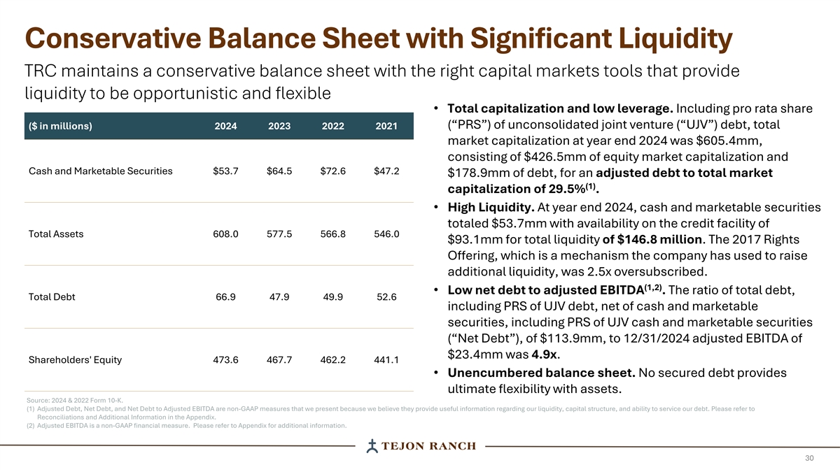 流动性显著的保守型资产负债表TRC维持保守型资产负债表,合适的资本市场工具提供流动性具有机会性和灵活性•总资本化和低杠杆。包括未合并的合资企业(“UJV”)债务的按比例份额(“PRS”),2024年底的总市值(百万美元)2024202320222021为605.4mm,包括426.5mm的股票市值和现金和有价证券53.7美元64.5美元72.6美元47.2美元178.9mm的债务,调整后的债务占总市值(1)的29.5%。•高流动性。截至2024年底,现金和有价证券总额为53.7mm,可用信贷额度为Total Assets 608.05 77.5566.85 46.0 $ 93.1mm,总流动性为1.468亿美元。2017年供股获2.5倍超额认购,这是该公司用来筹集额外流动资金的机制。(1,2)•调整后EBITDA净债务较低。总债务、总债务66.947.94 9.95 2.6,包括UJV债务的PRS,扣除现金和有价证券,包括UJV现金和有价证券的PRS(“净债务”),为113.9mm美元,与12/31/2024调整后EBITDA为23.4mm美元的比率为4.9x。股东权益473.6467.7462.24 41.1•未支配资产负债表。没有任何担保债务为资产提供了最终的灵活性。资料来源:2024 & 2022 10-K表。(1)调整后的债务、净债务和调整后EBITDA的净债务是我们提出的非GAAP衡量标准,因为我们认为它们提供了有关我们的流动性、资本结构和偿债能力的有用信息。请参阅附录中的和解和附加信息。(2)调整后EBITDA是一种非公认会计准则财务指标。更多信息请参见附录。30