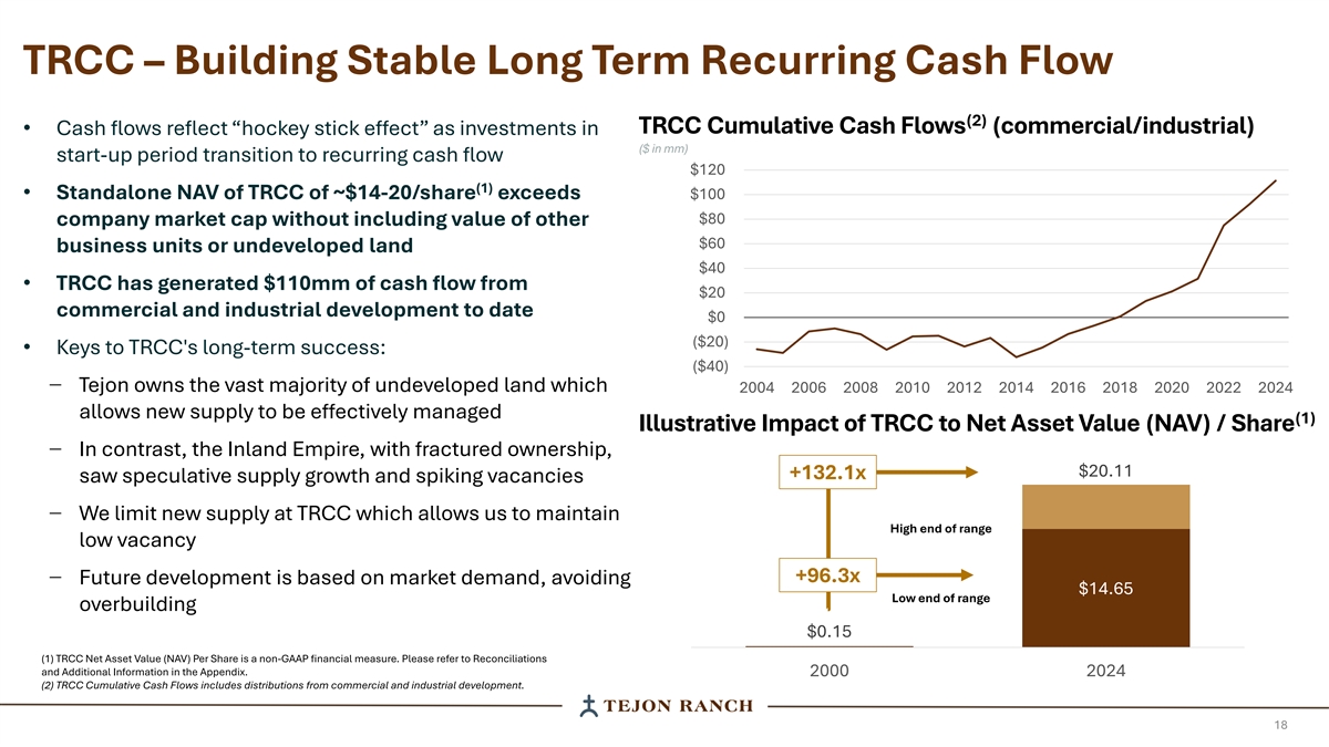 从开拓机遇到制度型房地产•漫长的权利程序和CEQA诉讼辩护(1997-TRCC:工业用地随时间推移价值($ per sq.ft.)2007)为未来增长铺平了道路$ 10 $ 9.00/SF − Travel Plaza:2年$ 9 $ 8 − TRCC-West:3年$ 7 $ 6 − TRCC East:7年$ 5 −权利只会变得更加复杂,从而在加利福尼亚州甚至创造了4美元3美元更大的进入壁垒$ 2 $ 0.57/SF •自成立以来,工业用地价格已上涨1,479% $ 1 $ 0 •如今,数千人受雇于商业中心200020052010201520202025 • Tejon在执行方面取得成功:奥特莱斯合资企业的管理成员,按时、按预算、按愿景交付资产•在没有合作伙伴的情况下在资产负债表上执行Terra Vista公寓•通过合资企业审慎利用资本− Industrial:Majestic、Dedeaux − Retail:TravelCenters of America、洛克菲勒•向最终用户(包括宜家、雀巢和卡特彼勒)进行机会性的土地销售•随着时间的推移增加经常性现金流的机会17