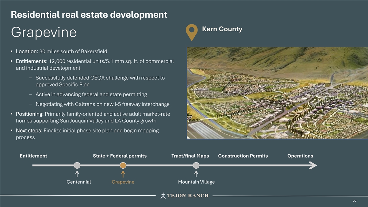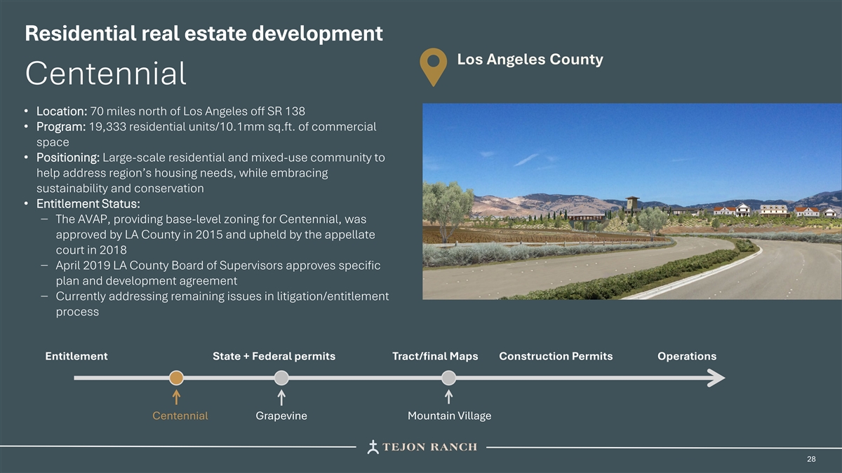 住宅房地产开发Kern County Grapevine •位置:贝克斯菲尔德以南30英里•权利:12,000个住宅单元/5.1毫米平方英尺的商业和工业开发−就已批准的具体计划成功应对CEQA挑战−积极推进联邦和州许可−与加州交通运输公司就新的I-5高速公路交汇处进行谈判•定位:主要面向家庭和活跃的成人市场利率房屋,支持圣华金谷和洛杉矶县的发展•下一步:最终确定初始阶段场地计划并开始绘图过程权利州+联邦许可区域/最终地图施工许可运营山村27
