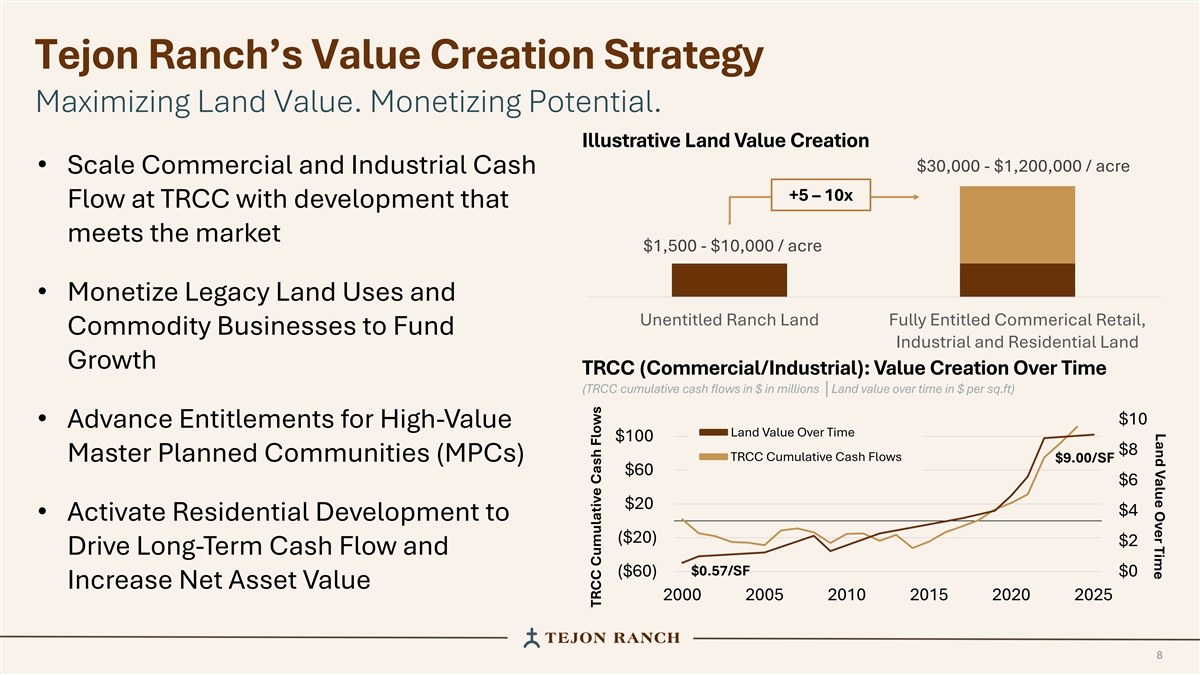 Tejon牧业土地价值最大化的价值创造战略。货币化潜力。说明性土地价值创造30,000美元至1,200,000美元/英亩•规模商业和工业现金+ 5 – 10倍流量在TRCC与符合市场的开发项目1,500美元至10,000美元/英亩•将传统土地使用和未获得资格的牧场土地完全获得资格的商业零售货币化,为工业和住宅土地增长提供资金的商品企业TRCC(商业/工业):随着时间的推移创造价值(TRCC累积现金流以百万美元计│土地价值随着时间的推移以每平方英尺计)10美元•随着时间的推移为高价值土地价值预缴权利100美元8 TRCC累积现金流主规划社区(MPCs)9.00美元/SF 60美元6美元20美元4 •激活住宅开发至(20美元)2美元推动长期现金流和0.57美元/SF(60美元)0美元增加资产净值2000200520102015202020258 TRCC累积现金流