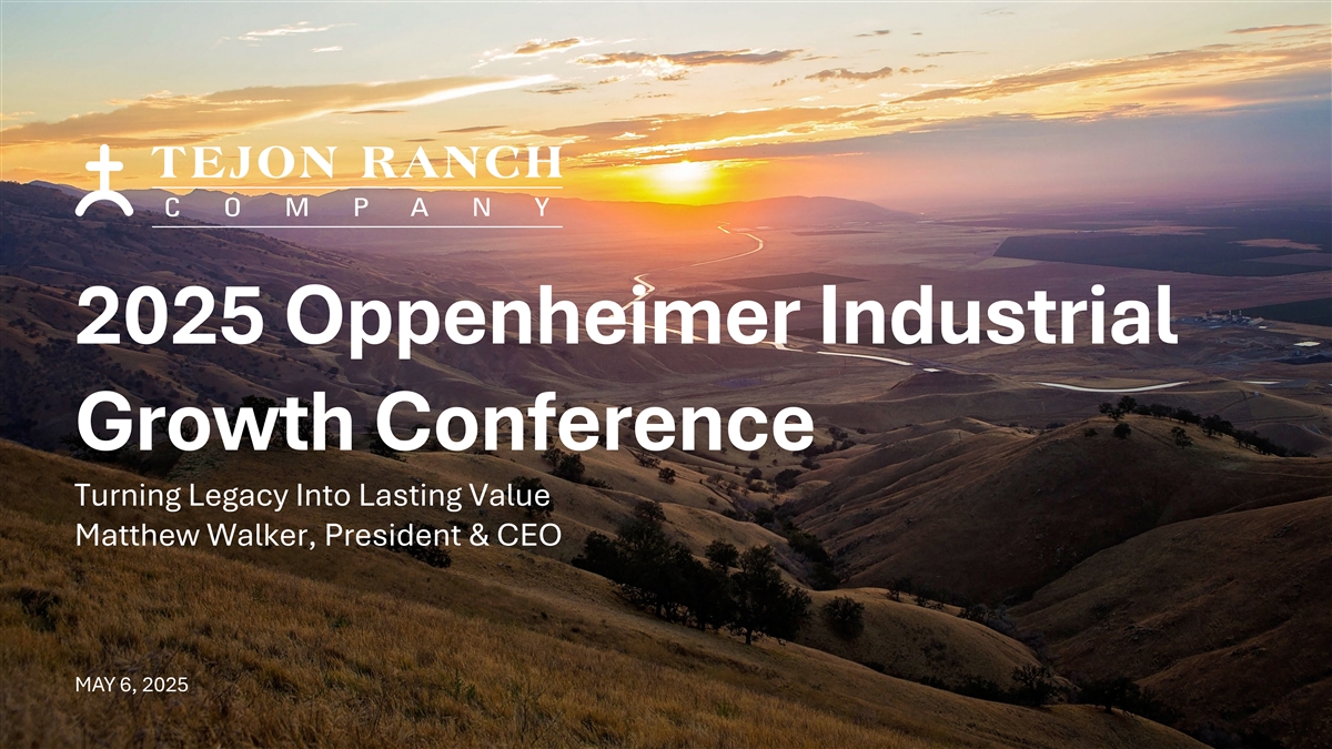 | 2025年5月6日,Tejon Ranch Co.新任总裁兼首席执行官Matthew Walker出席了奥本海默第20届年度工业增长大会。该演示文稿的演示文稿和成绩单载于下文。 |
