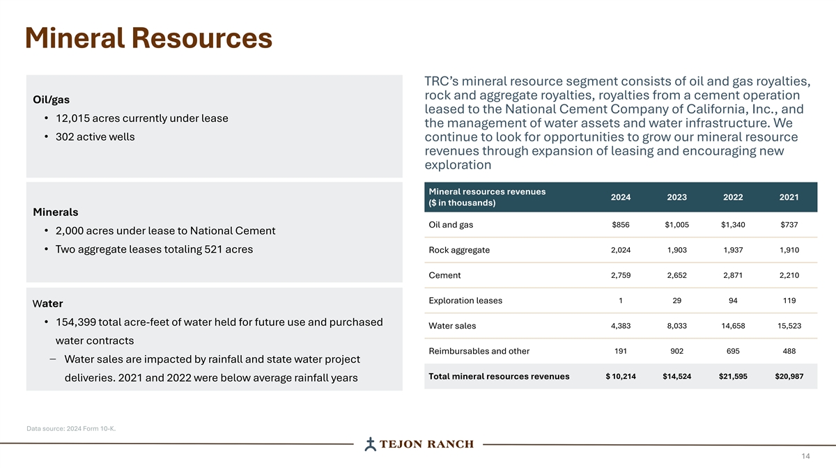 Mineral Resources TRC的矿产资源部门包括石油和天然气特许权使用费、岩石和骨料特许权使用费、水泥业务石油/天然气租赁给加州国家水泥公司的特许权使用费,以及•目前租赁管理的12,015英亩水务资产和水务基础设施。我们• 302口活跃油井继续寻找机会,通过扩大租赁和鼓励新的勘探来增加我们的矿产资源收入矿产资源收入2024202320222021(单位:千美元)Minerals石油和天然气$ 856 $ 1,005 $ 1,340 $ 737 • 2,000英亩租赁给国家水泥2,0 241,9031,9371,910 •两个合计租赁总面积为521英亩的岩石骨料水泥2,7592,6522,8712,21012994119勘探租赁水•总计154,399英亩-英尺的水持有以供未来使用和购买的水销售4,3838,03314,65815,523水合同191902695488报销和其他−水销售受到降雨和州水项目的影响10,214美元14,524美元21,595美元20,987矿产资源总收入交付。2021年和2022年低于平均降雨量年份数据来源:2024表格10-K.14