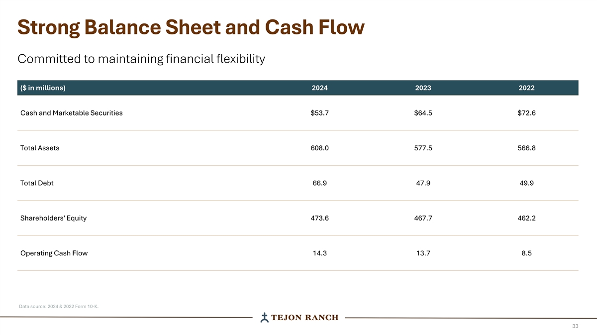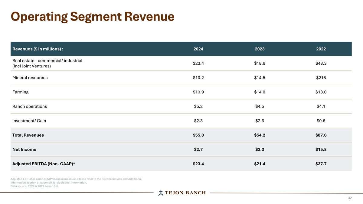 运营部门收入(百万美元):202420232022房地产-商业/工业$ 23.4 $ 18.6 $ 48.3(包括合资企业)矿产资源$ 10.2 $ 14.5 $ 216农业$ 13.9 $ 14.0 $ 13.0牧场运营$ 5.2 $ 4.5 $ 4.1投资/收益$ 2.3 $ 2.6 $ 0.6总收入$ 55.0 $ 54.2 $ 87.6净收入$ 2.7 $ 3.3 $ 15.8调整后EBITDA(非公认会计准则)*23.4美元21.4美元37.7美元调整后EBITDA是非公认会计准则财务指标。有关更多信息,请参阅附录的和解和附加信息部分。数据来源:2024 & 2022表格10-K.32