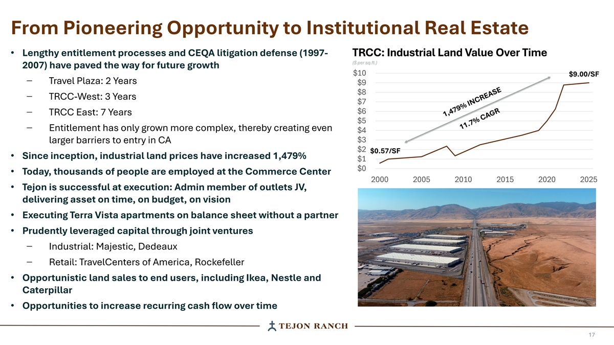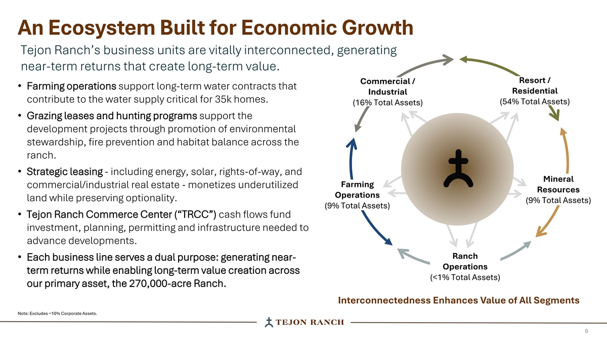 上世纪90年代中期,这家公司看到了从土地中提取价值的机会,并从一家以农业为重点的公司转变为一家多元化的房地产公司。我们认识到,5号州际公路沿线每天10万辆汽车显示出巨大的工业扩张潜力,并从这一认识中产生了TRCC的想法。该公司了解到,内陆帝国缺乏大型、深厚的工业场地,因此我们设想了拥有充足停车位的超级区域配送中心,该中心将提供从233,000平方英尺到百万七平方英尺的一系列建筑面积。它地理位置优越,靠近洛杉矶和长滩港以及奥克兰港,可轻松前往15号州际公路并向东指向。财产权利过程,包括我们成功的诉讼,从开始到结束花了10年时间。今天,我们的工业中心仍然100%被宜家和雀巢这样的国际公司占据。目前已有700万平方英尺的工业开发,还有1100万平方英尺尚待开发。TRCC最初与一家合资企业建立了一个为专业司机和旅行者提供服务的旅行中心。现在我们的京东包括两个出行中心,我们的加油站和便利店每个月卖出超百万加仑的油。然后,我们建造的餐厅开始获得牵引力,它们扩展到我们今天拥有的20多家。我们后来增加了一个输出中心,有近60家门店,我们卖了几个酒店垫,为旅行者提供了一个枢纽。如今,该零售店以95%的入住率运营。住宅自然是从千千万万现场办公的人的住房需求中流出的。这促使了我们对Terra Vista的愿景,它将在buildout拥有495套多户住宅。这个月,我们开始交付一期228台。TRCC已转变为一个充满活力的总规划社区,拥有全职居民。当你把所有这些放在一起时,它不仅展示了我们非凡的土地持有量,而且还展示了我们一直在稳步建立的战略飞轮,其中土地使用批准释放了发展机会,工业和零售业的增长创造了就业机会并推动了住宅需求,而住宅开发反过来又吸引了社区、零售和服务。这些重复的循环共同创造了持续的、复合的土地价值。这个飞轮一直在运转,在TRCC创造了多年的价值。对我来说,领导Tejon牧业的一个高度优先事项是利用这种势头,为我们的股东充分释放我们剩余土地资产的经济潜力。