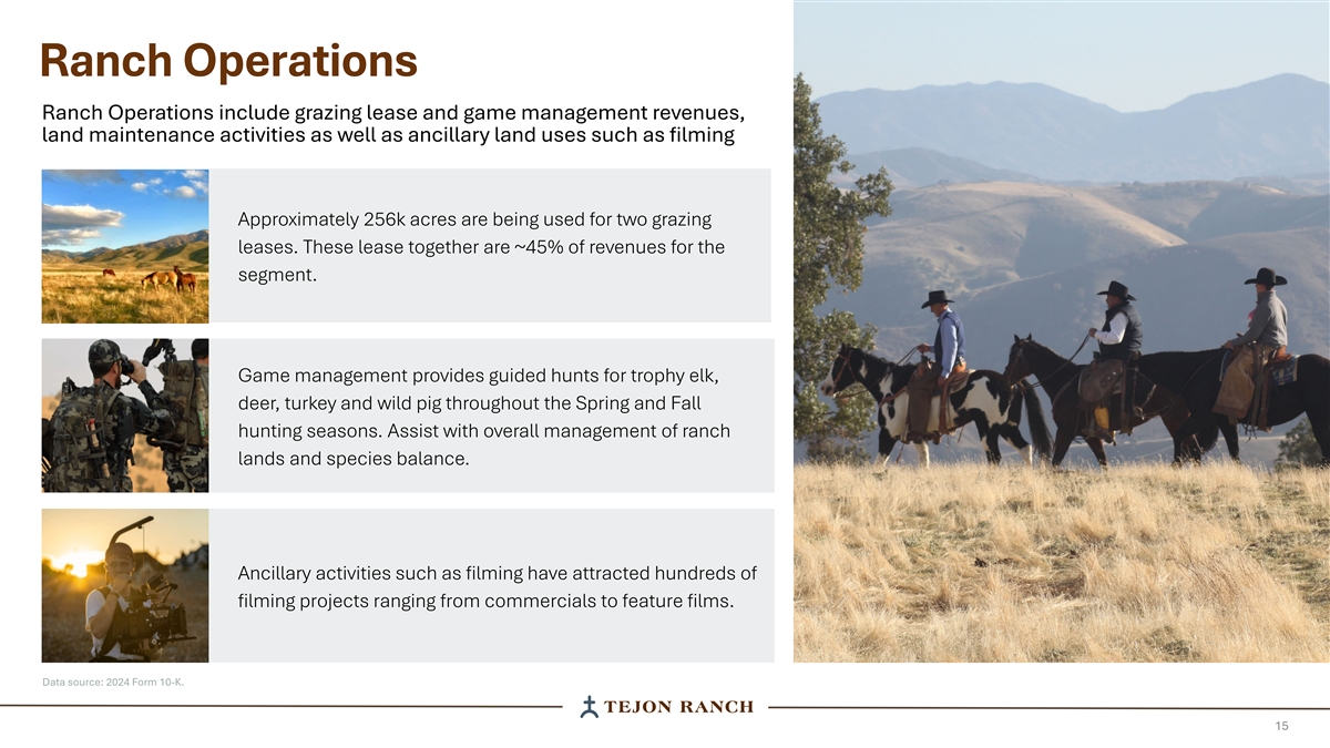 牧场运营牧场运营包括放牧租赁和游戏管理收入、土地维护活动以及拍摄等辅助土地用途约25.6万英亩用于两项放牧租赁。这些租赁加起来约占该部门收入的45%。游戏管理在整个春季和秋季狩猎季节为战利品麋鹿、鹿、火鸡和野猪提供引导式狩猎。协助统筹管理牧场土地和物种平衡。拍摄等辅助活动,吸引了从商业广告到故事片等上百个拍摄项目。数据来源:2024表格10-K.15