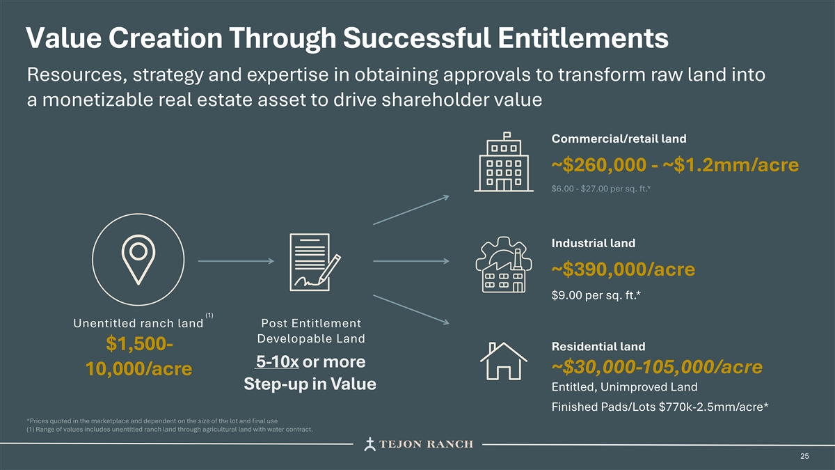 通过成功的权利创造价值资源、战略和专业知识获得批准,将原始土地转变为可货币化的房地产资产,以推动股东价值商业/零售土地~260,000美元-~1.2美元/英亩每平方英尺6.00美元-27.00美元。*工业用地~390000美元/英亩每平方英尺9.00美元。*(1)未获授权的牧场土地后权利可开发土地$ 1,500-住宅土地5-10倍或更多~$ 30,000-105,000/英亩10,000/英亩有权价值提升,未改良土地成品垫/地块$ 770k-2.5mm/英亩**市场上报价并取决于地段大小和最终用途的价格(1)价值范围包括通过有水合同的农用地未获得授权的牧场土地。25