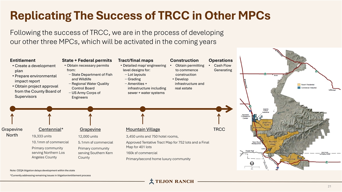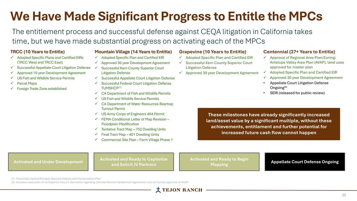 我们已经取得了重大进展,为MPC赋予了权利程序,在加利福尼亚州成功抵御CEQA诉讼需要时间,但我们在激活每一个MPCs TRCC(10年赋权)山村(14年赋权)葡萄藤(10年赋权)百年(27年+赋权)ü采用特定方案和认证EIR ü采用特定方案和认证EIR ü采用特定方案和认证EIR ü批准区域面积规划/分区:(TRCC西和TRCC East)Antelope Valley Area Plan(AVAP);土地用途ü批准30年开发协议ü成功Kern县高等法院批准总体规划ü成功上诉法院诉讼辩护诉讼辩护ü成功Kern县高等法院ü通过具体方案和认证EIR ü批准10年开发协议诉讼辩护ü批准30年开发协议ü批准30年开发协议ü美国鱼和野生动物服务许可证ü成功上诉法院诉讼抗辩•上诉法院诉讼抗辩ü Parcel Maps ü成功联邦法院诉讼抗辩(2)(1)正在进行的TUMSHCP ü外贸区成立• SEIR(面向公众发布审核)ü 加利福尼亚州鱼类和野生动物部许可证ü美国鱼类和野生动物服务许可证ü 加利福尼亚州水利部捕熊者投票率许可证ü美国陆军工程兵团404许可证这些里程碑已经显着增加ü FEMA有条件的地图修改信-土地/资产价值的显着倍数,如果没有这些洪泛区改造成果,ü暂定区域地图的权利和进一步潜力– 752个住宅单元增加的未来现金流不可能发生ü最终区域地图– 401个住宅单元ü商业用地计划–农场村庄第1期已激活并准备好资本化已激活并准备好开始激活和正在开发上诉法院辩护正在进行中并征求合资伙伴绘图(1)Tehachapi Upland多物种栖息地和保护计划(2)包括解决洛杉矶高等法院关于气候解决解决解决解决解决协议的裁决和洛杉矶县批准AVAP 22