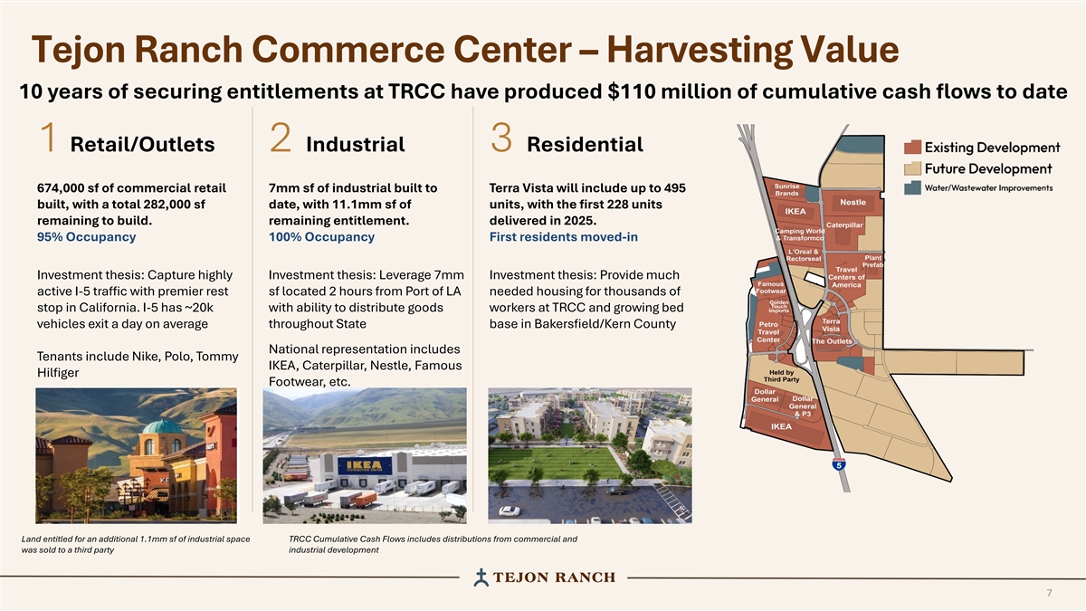Tejon牧业 Commerce Center – Harvesting Value 10年来在TRCC获得权利已经产生了1.1亿美元的累计现金流,迄今为止1 Retail/Outlets 2 Industrial 3 Residential 674,000 sF的商业零售7mm sF的工业建筑将包括多达495个已建成的日期,总面积为282,000 sF,单位面积为11.1mm sF,前228个单位仍有待建造。剩余权利。将于2025年交付。95%入住率100%入住率First residents moved in Investment Thesis:Capture highly Investment Thesis:Leverage 7mm Investment Thesis:Provide much active I-5 traffic with Premier rest SF located 2 hours from Port of LA needed housing for thousands of stop in California for thousands of ports of LA 2 hoursI-5拥有~20k的能力,可以在TRCC分配货物工人,在贝克斯菲尔德/克恩县的整个州立基地平均每天有种植床车辆出口。全国代表包括租户包括耐克、波罗、汤米宜家、卡特彼勒、雀巢、著名的Hilfiger鞋业等。有权获得额外1.1mm sF工业空间TRCC的土地累计现金流包括来自商业的分配并已出售给第三方工业发展7