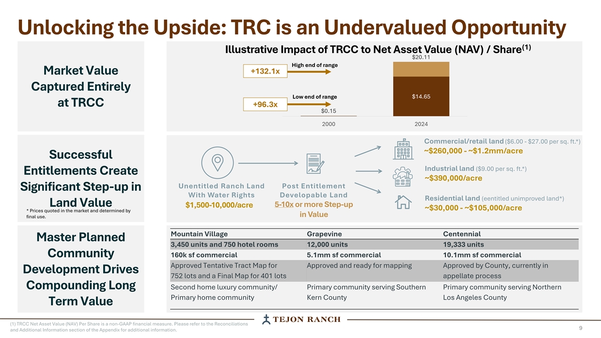 释放上行空间:TRC是一个被低估的机会(1)TRCC对资产净值(NAV)/股20.11美元区间高端+ 132.1倍市值的说明性影响在TRCC + 96.3x 0.15美元的全是区间低端14.65美元20002024商业/零售用地(每平方英尺6.00美元-27.00美元。*)~26万美元-~1.2mm/英亩的成功工业用地(每平方英尺9.00美元。*)权利创造约390,000美元/英亩的未获授权的牧场土地职位权利显着增加与水权可开发土地住宅用地(eeeeealted unimproved land*)土地价值5-10倍或更多-升1,500-10,000美元/英亩~30,000美元-~105,000美元/英亩*市场报价并由In Value Final Use确定。Mountain Village Grapevine Centennial Master规划3,450个单位和750个酒店房间12,000个单位19,333个单位社区160k SF商业5.1mm SF商业10.1mm SF商业批准的暂定区域地图已获批准并可供县批准的绘图,目前正在开发中的驱动752个地块和401个地块的最终地图上诉程序复合长第二家豪华社区/主要社区服务于南部主要社区服务于北部主要家庭社区Kern County Los Angeles County Term Value(1)TRCC每股净资产值(NAV)是非公认会计准则财务指标。有关更多信息,请参阅附录的和解9和附加信息部分。